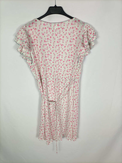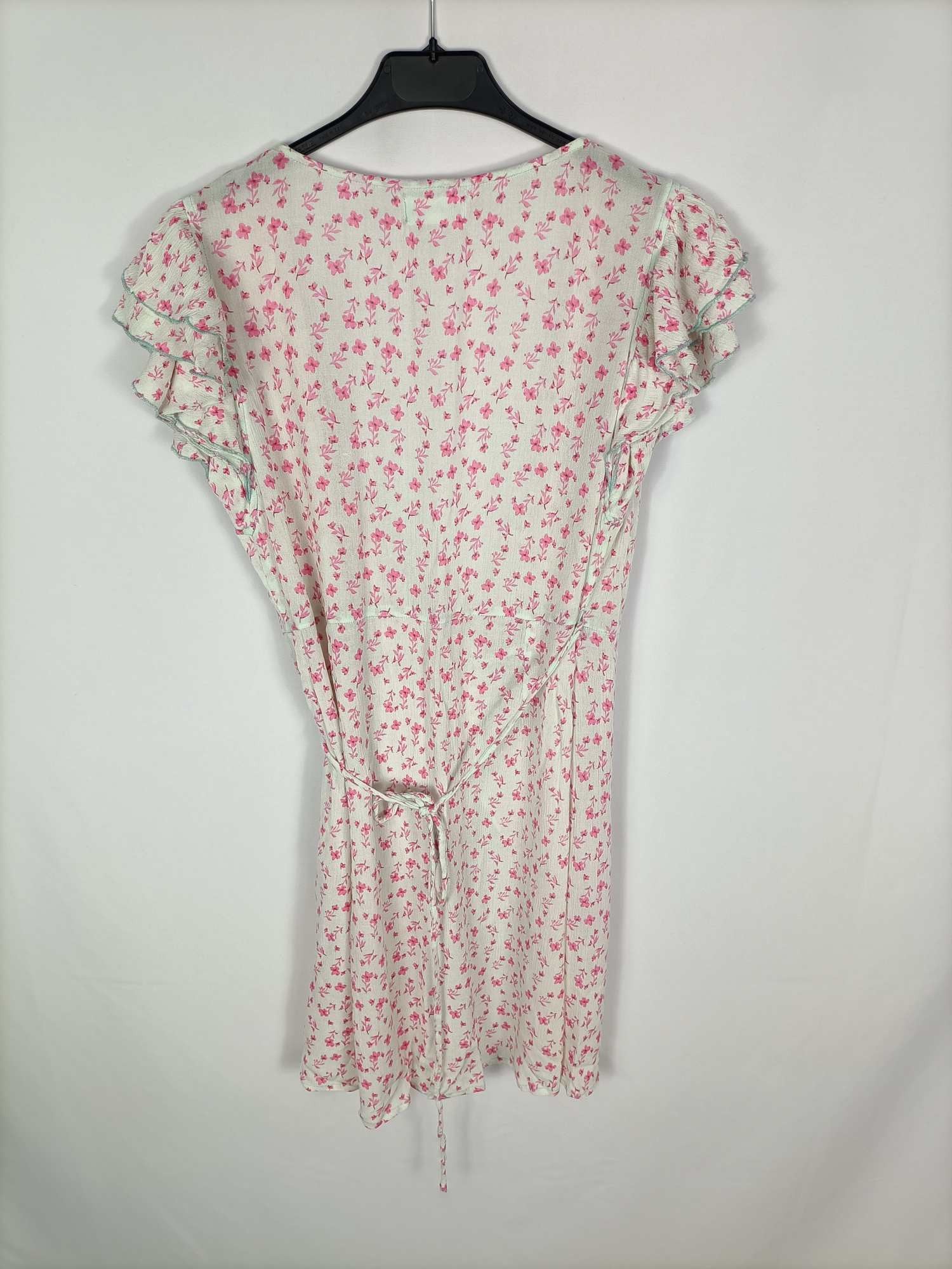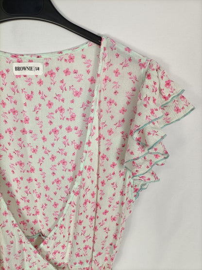 Brownie. S/m. Vestido azul verdoso cruzado con flores rosas. Mangas con volantes. No elástico. De sisa a sisa 52 cm largo 86 cm