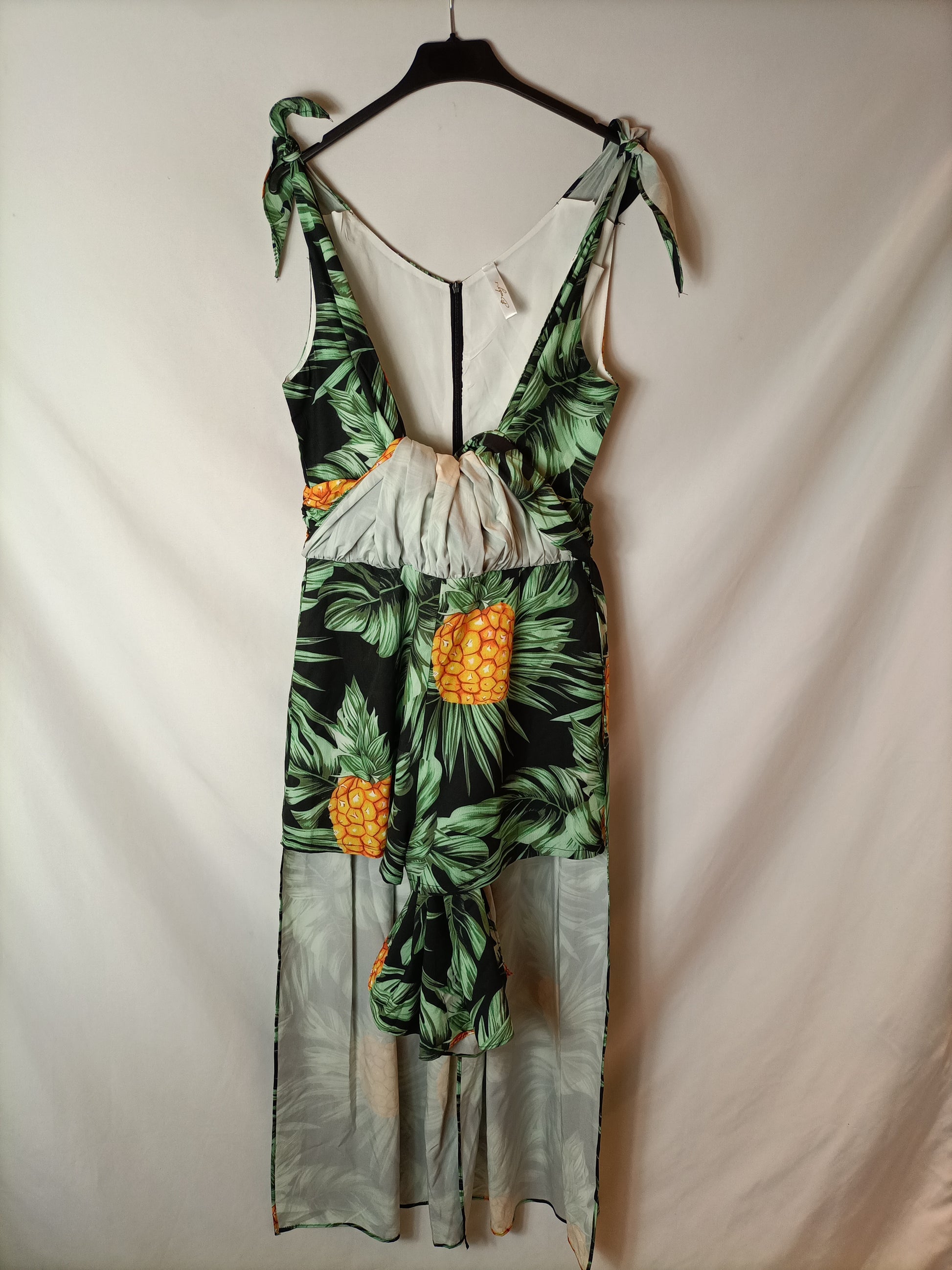 Vestido largo negro con estampado de hojas. apertura lateral larga y forro interior de mono corto. de sisa a sisa cm largo cm