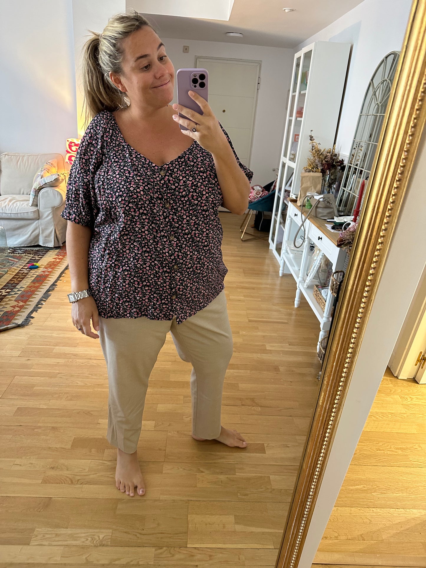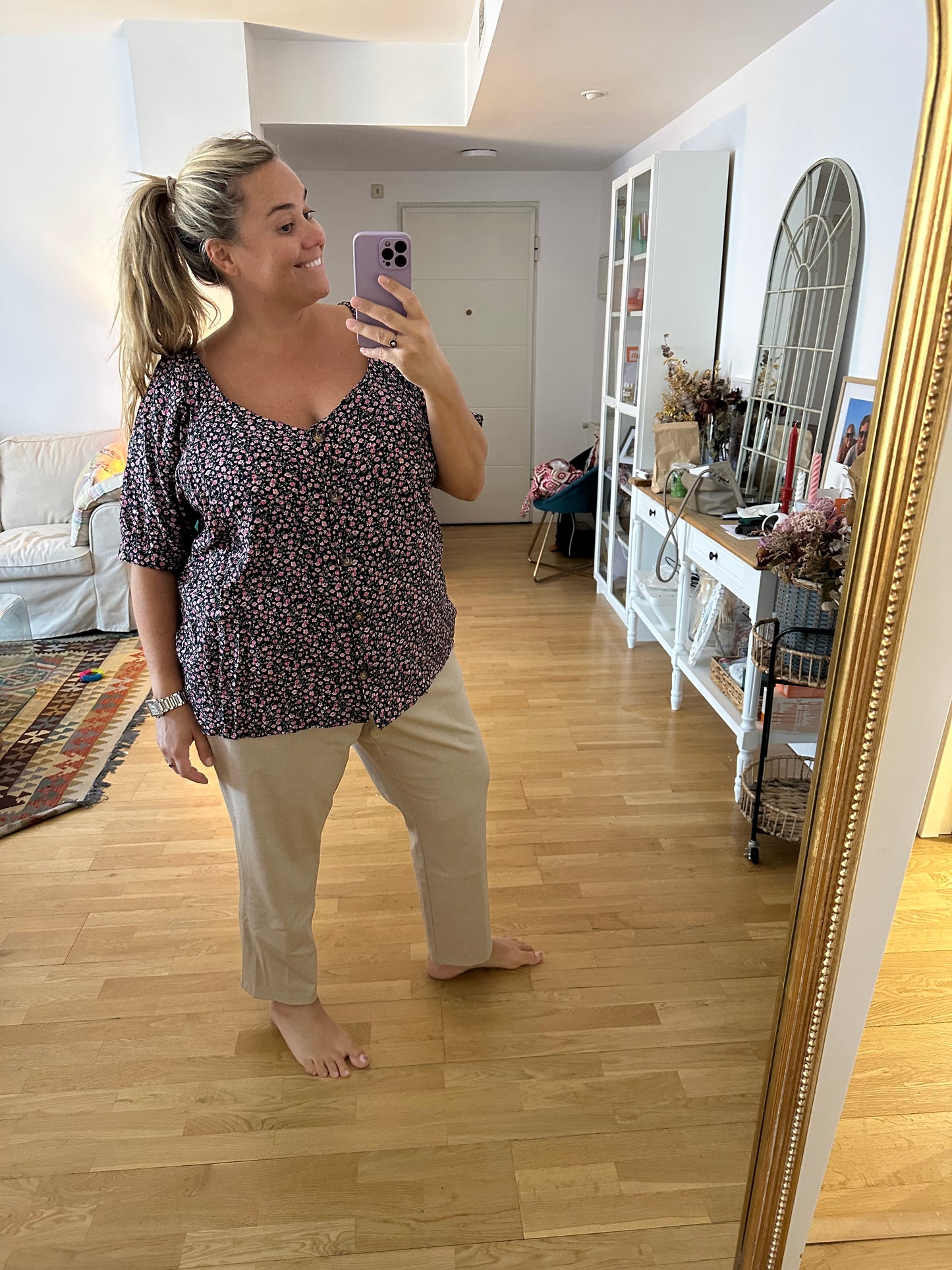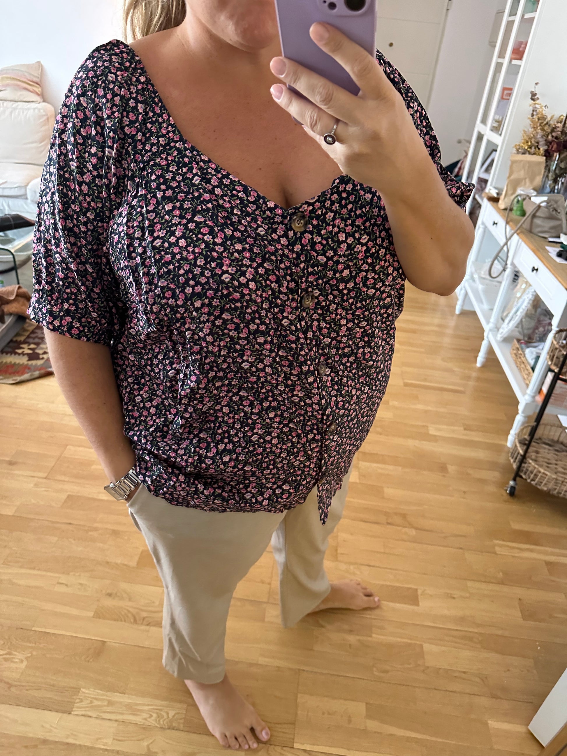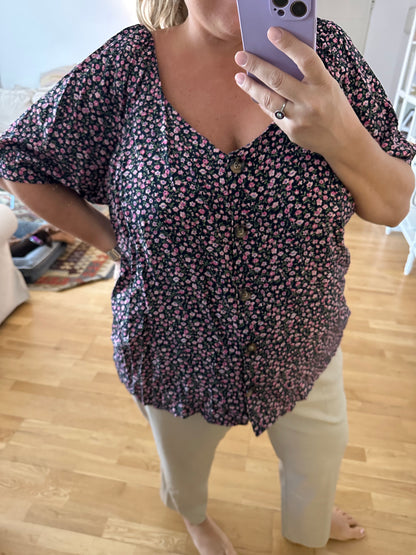 blusa negra fluida con botones de nácar y estampado de flores.