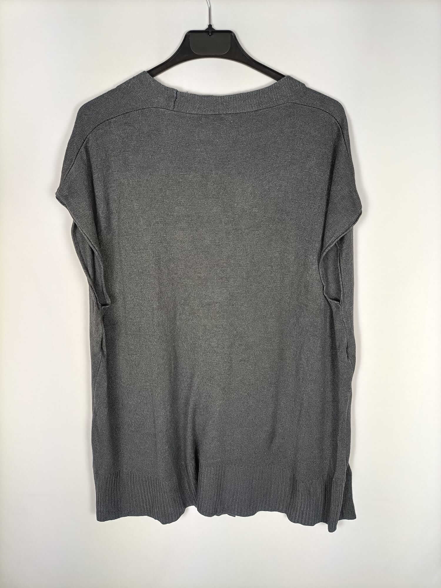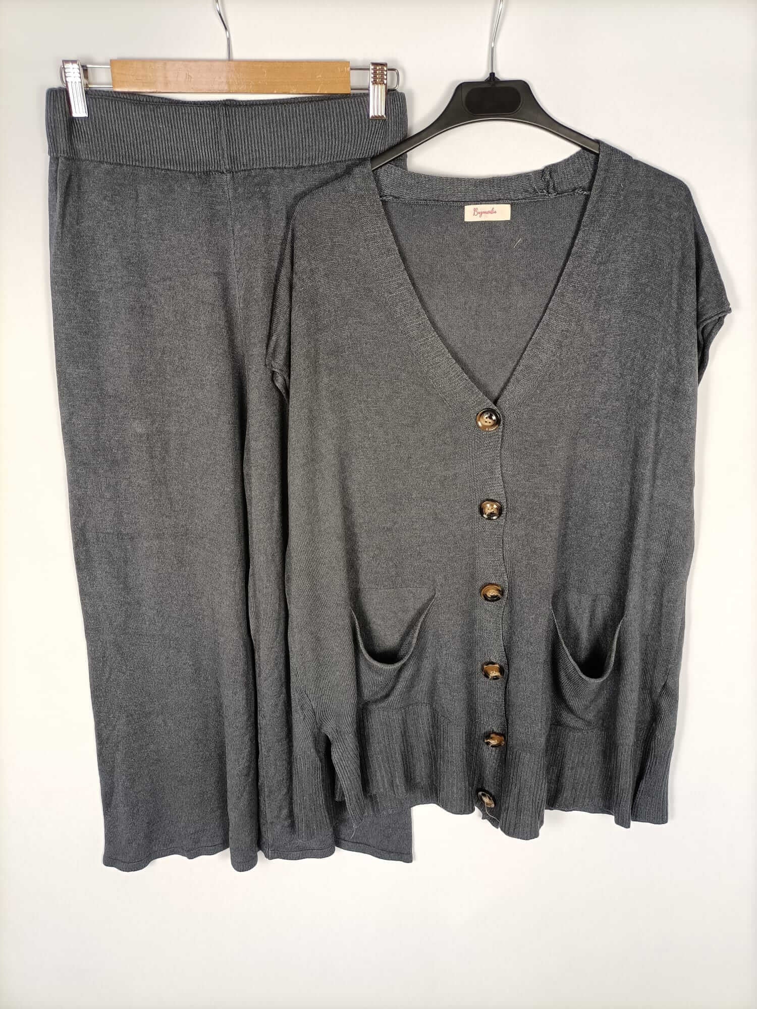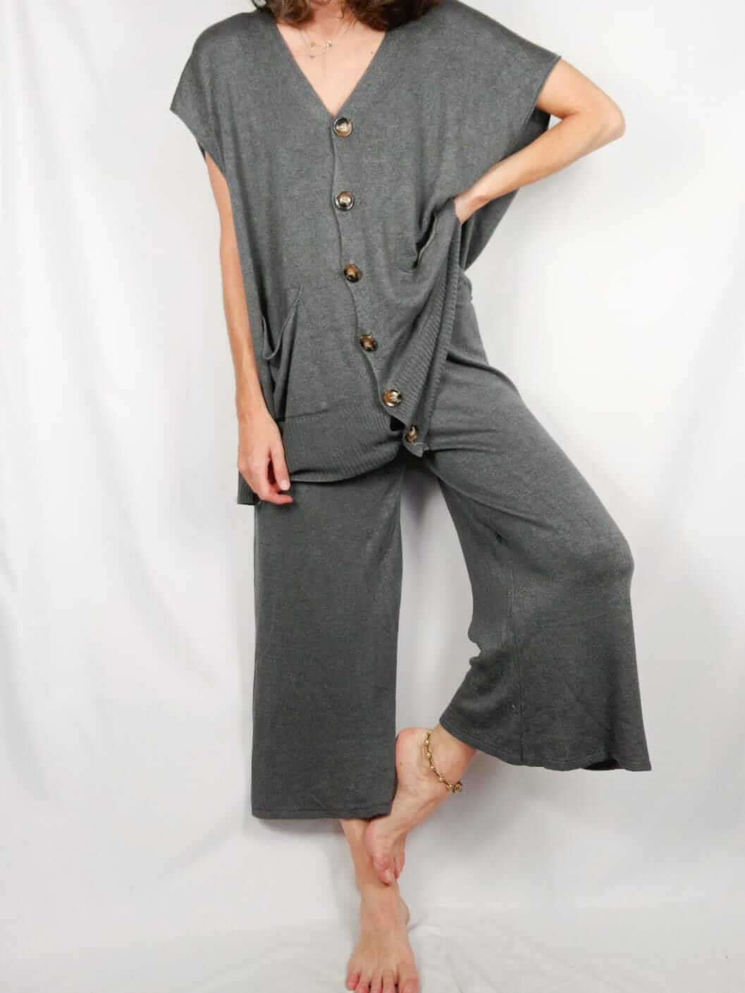 Buganvilia. Cárdigan de punto gris abotonado. Fluido y elástico. Estilo oversized. Largo 70 cm. Total look