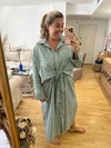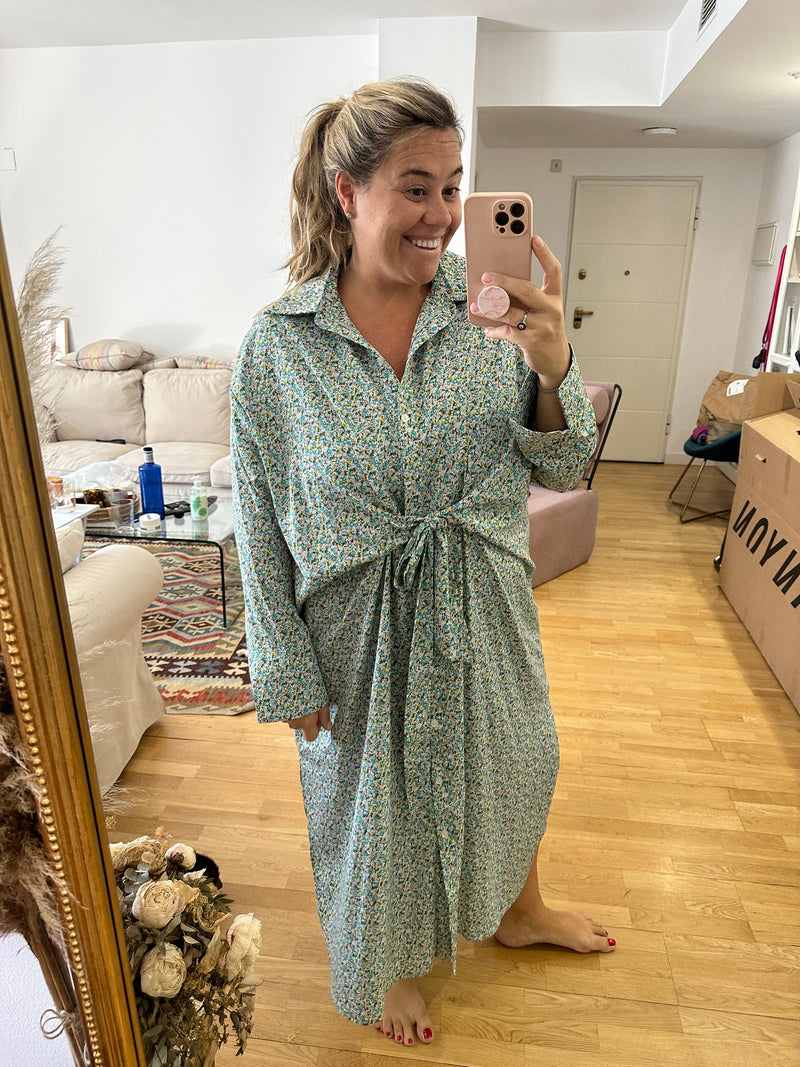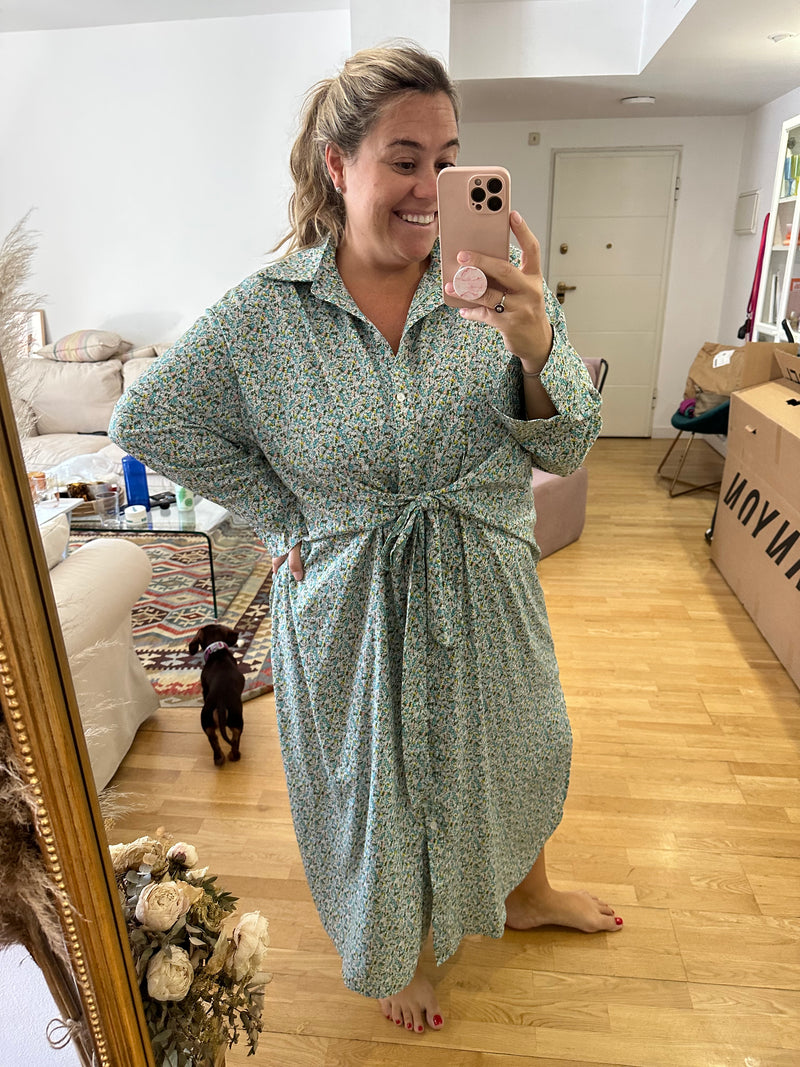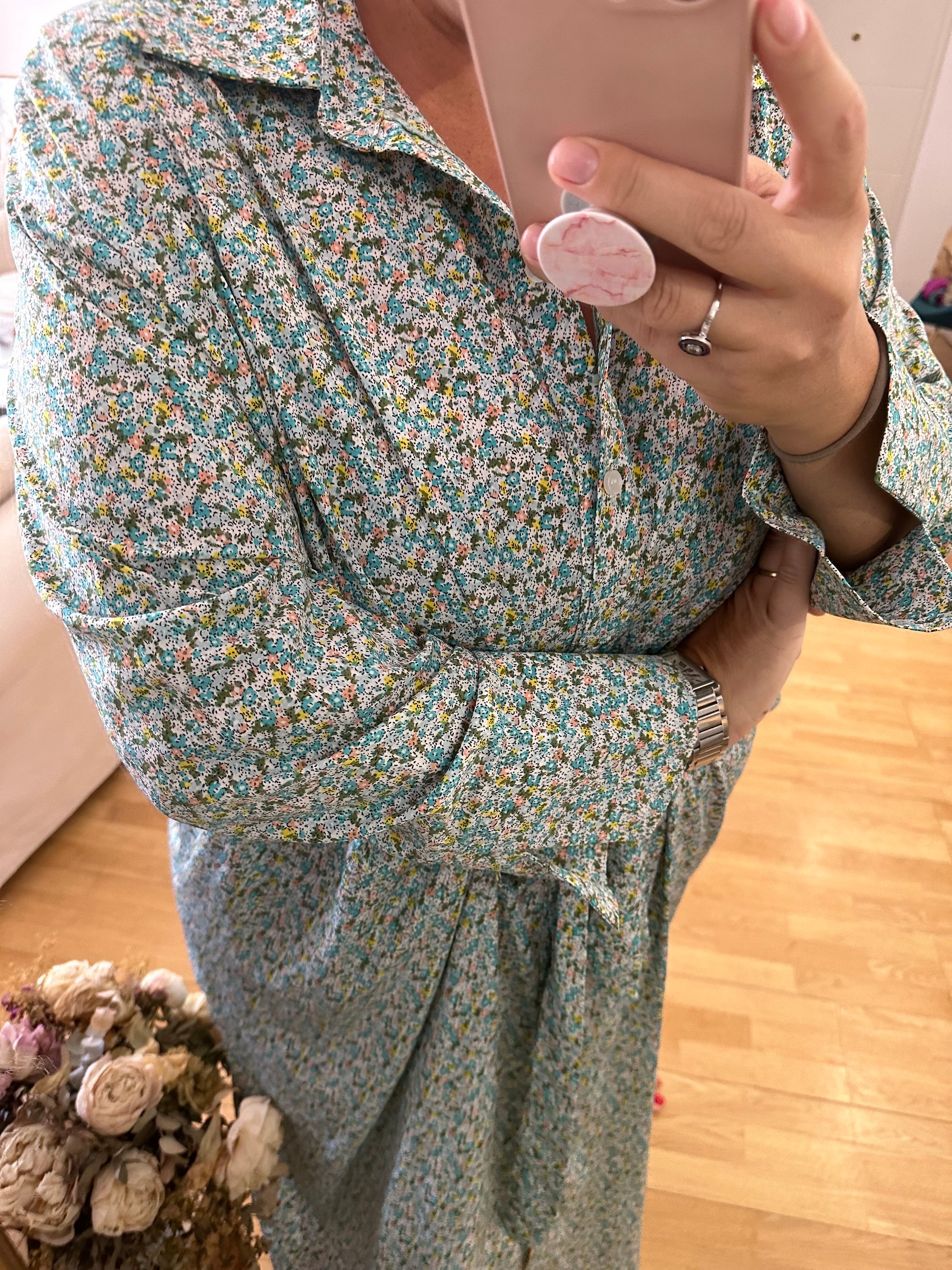vestido camisero abotonado con estampado de florecitas en tonos verdes