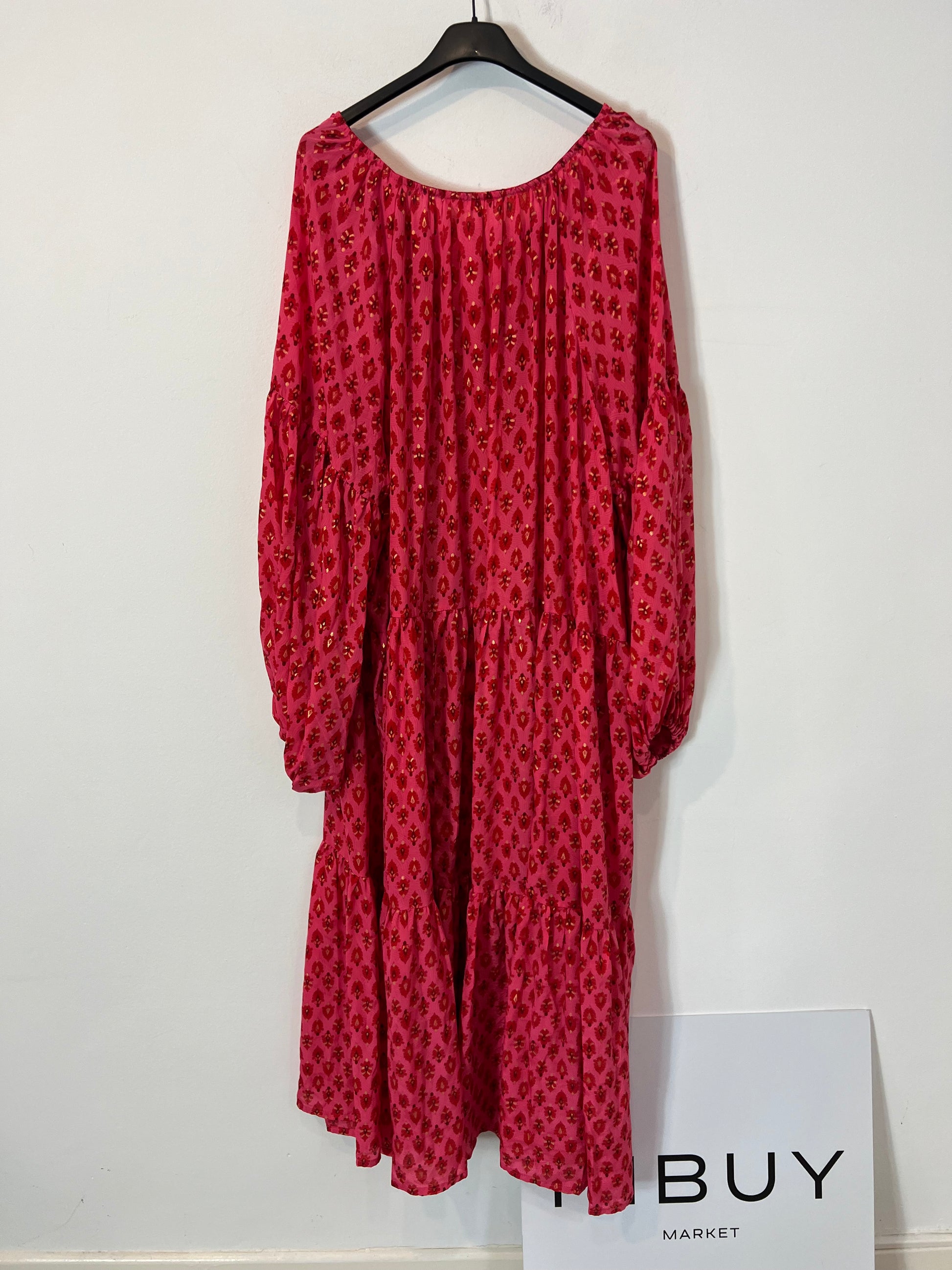 BUGANVILIA. Vestido rosa fucsia estampado dorados sedaT.3xl