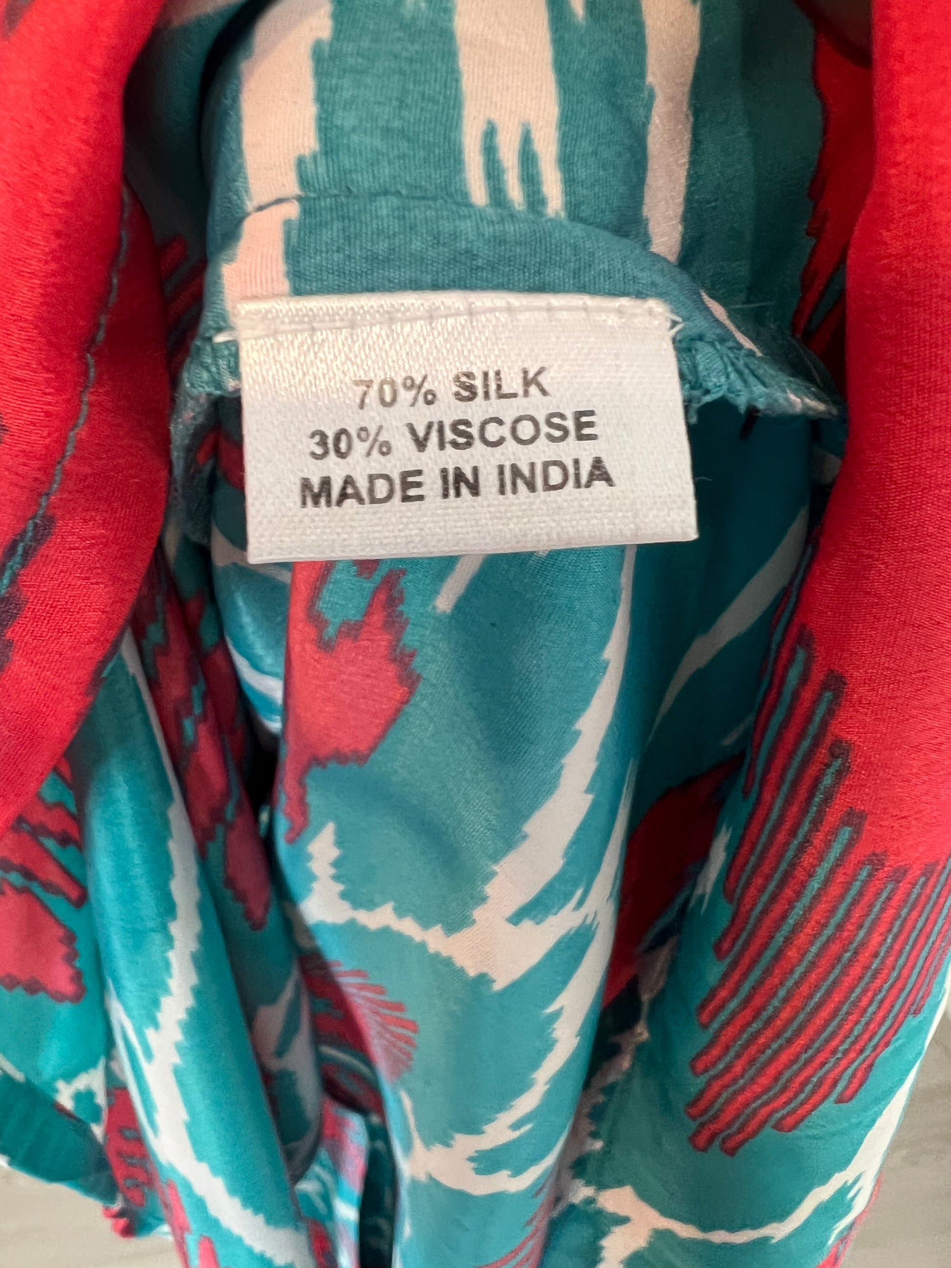 BUGANVILIA. Vestido verde estampado rojo sedaT.3xl
