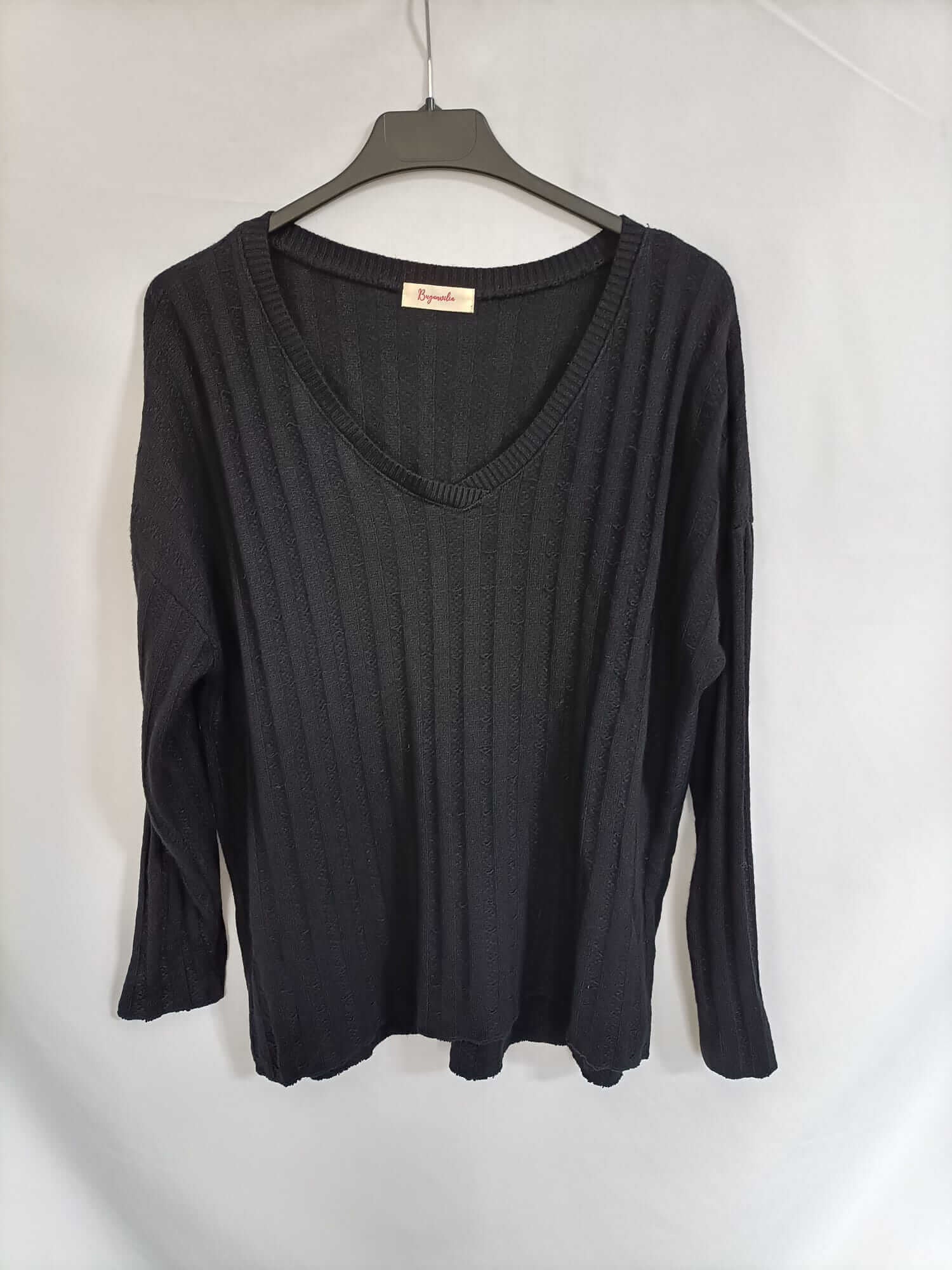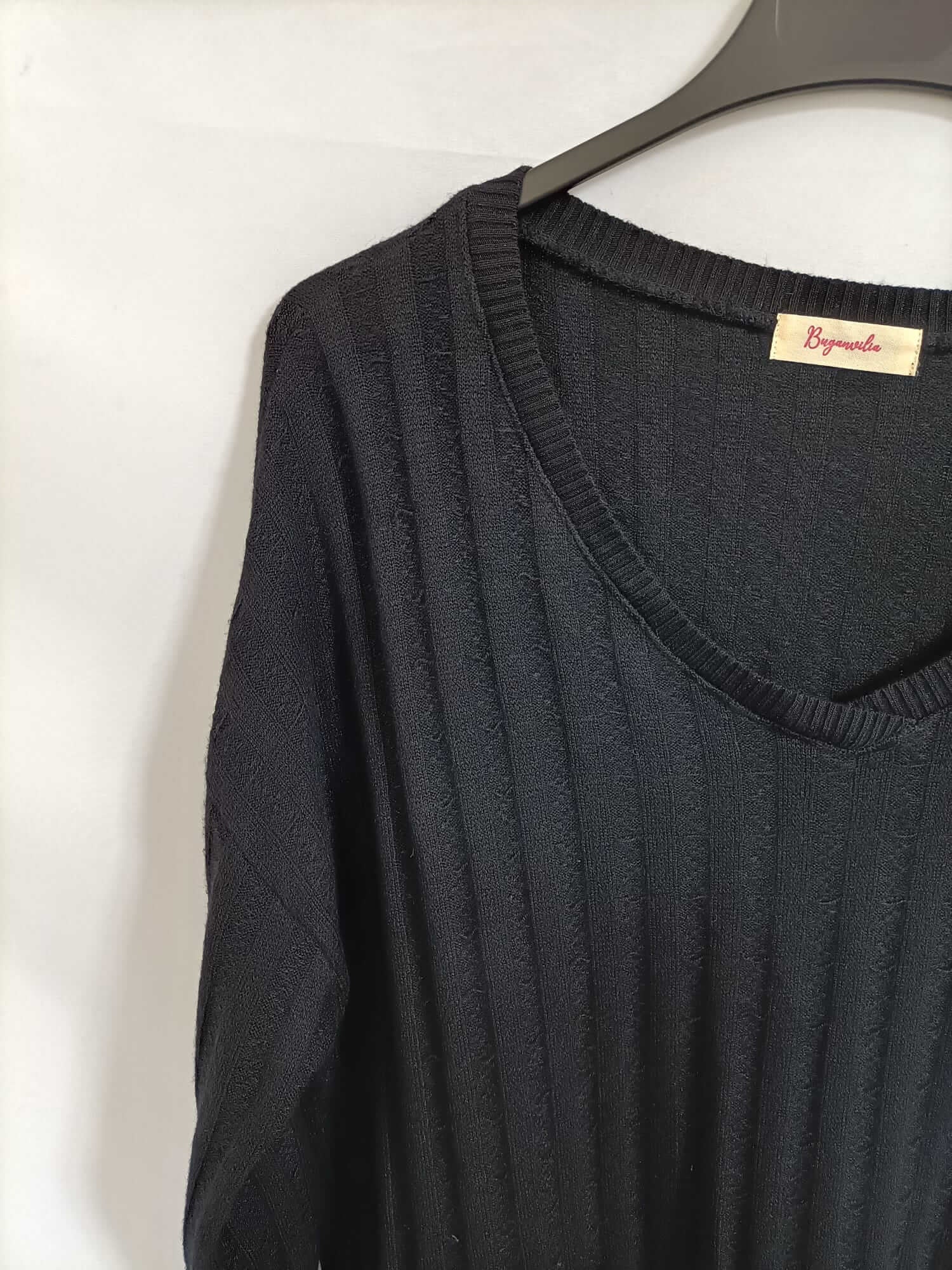 Buganvilia. Tu (m/L). Jersey negro estilo de canalé con las mangas estilo murciélago ajustadas. Fluida. Cuello pico.