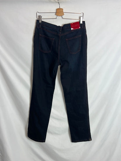 NUEVO CON ETIQUETA. Denim recto azul oscuro costuras. Tejido semi elastico. Cibtura 40cm, largo 106cm