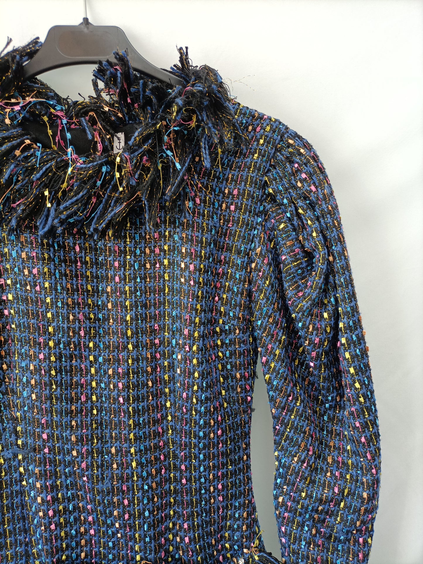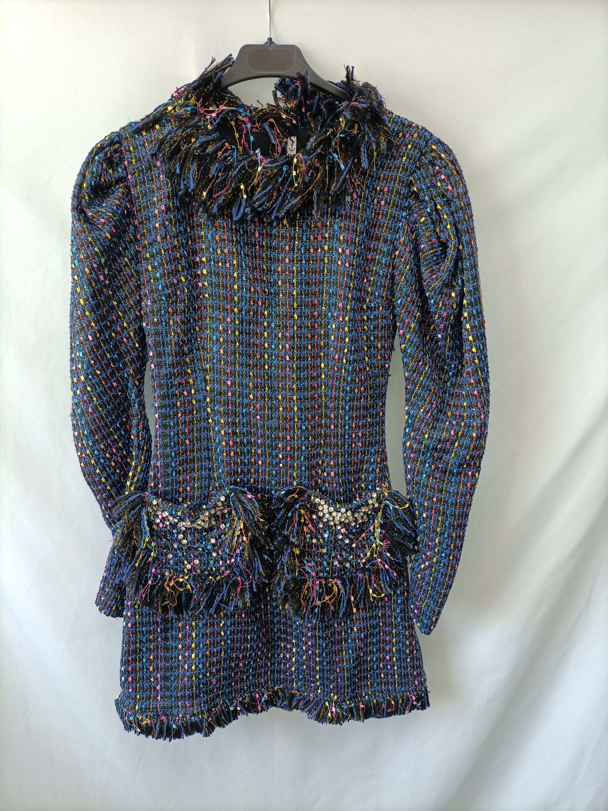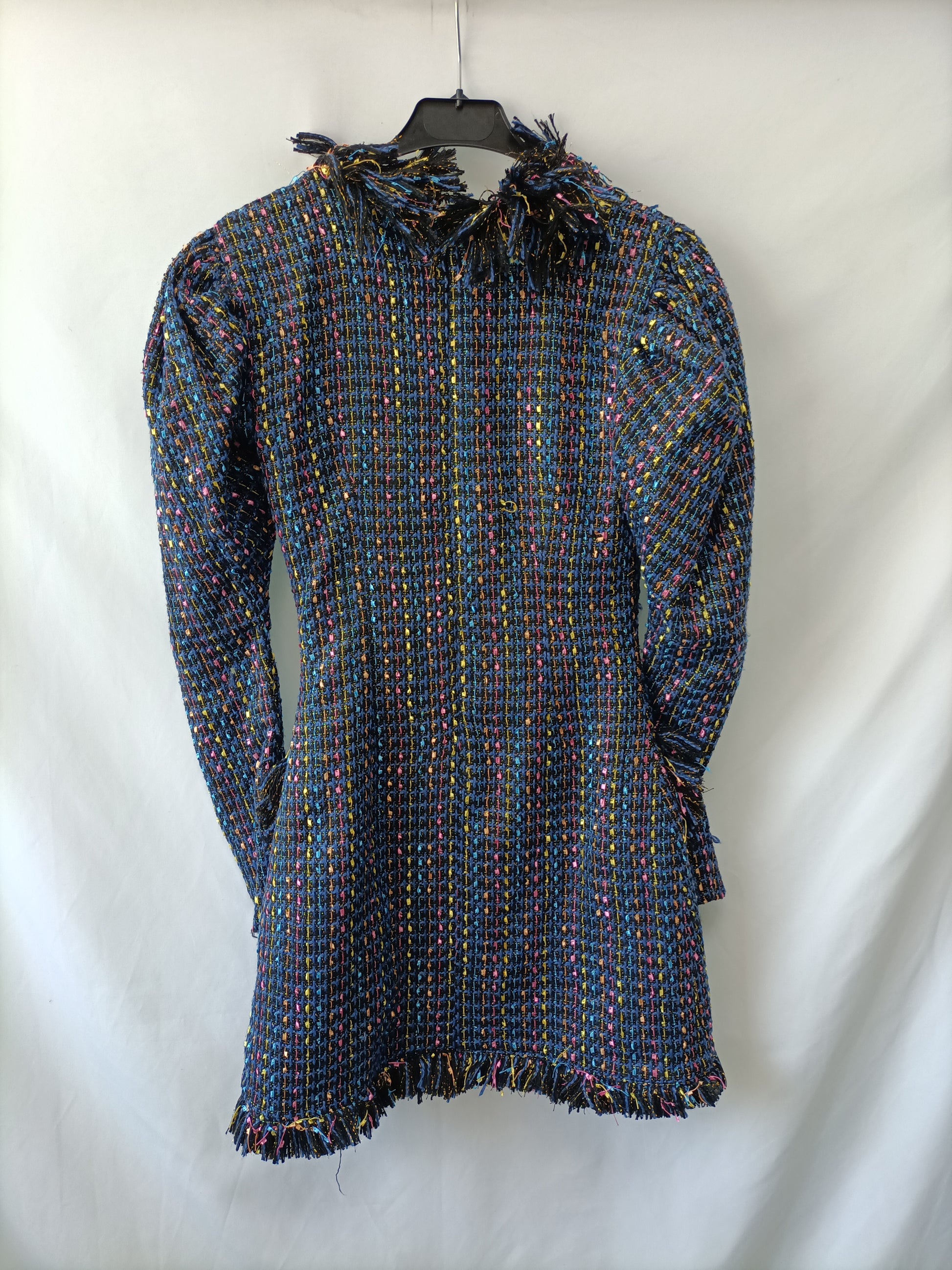 Vestido corto de tejido tipo tweed en azul y negro y colores. Cuello con flecos y mangas abullonadas. No elástico. De sisa a sisa 38 cm largo 84 cm 0k