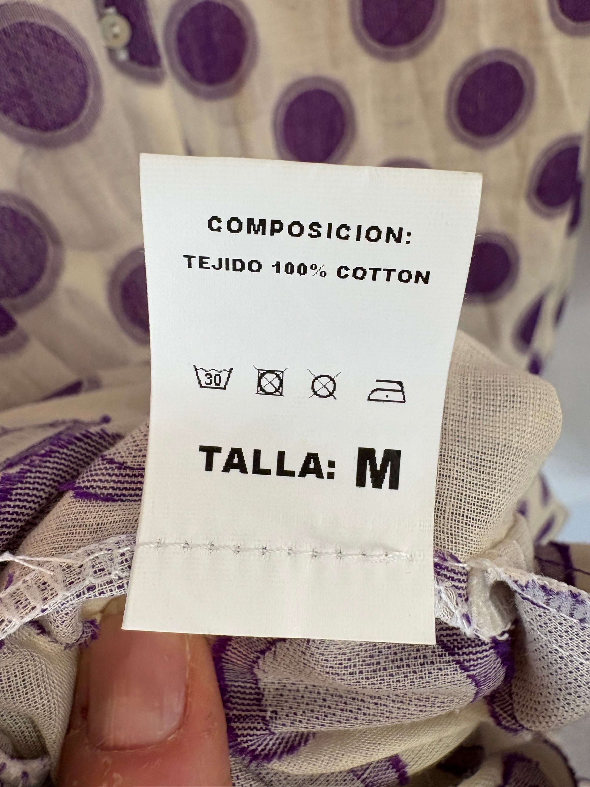 Vestido largo blanco roto con lunares morados. 100%algodón. de sisa a sisa 63cm largo 127 cm.