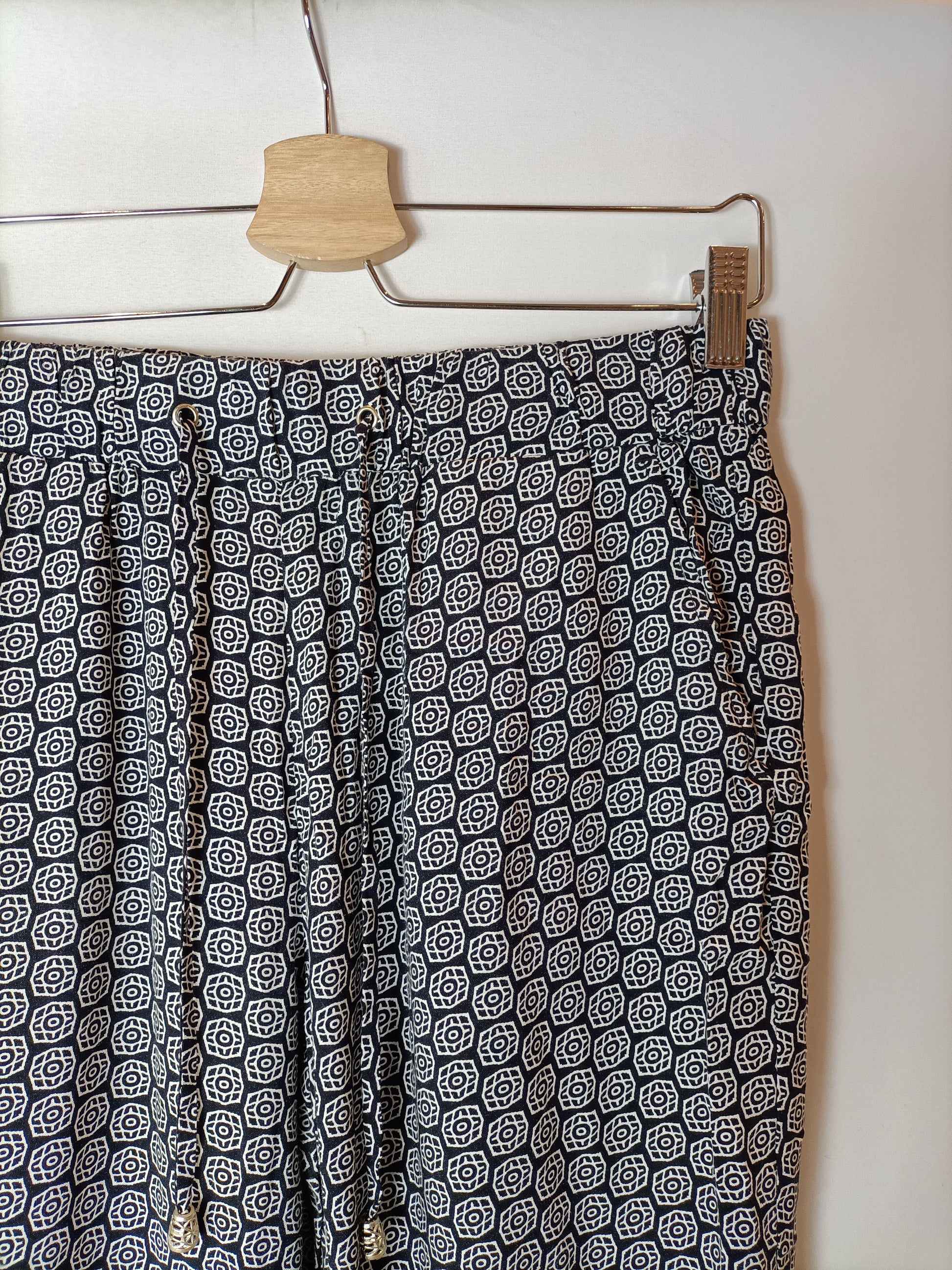 Pantalón fluido negro y blanco. Cintura elástica cpon cinturon regulable. Resto de tejido no elástico.