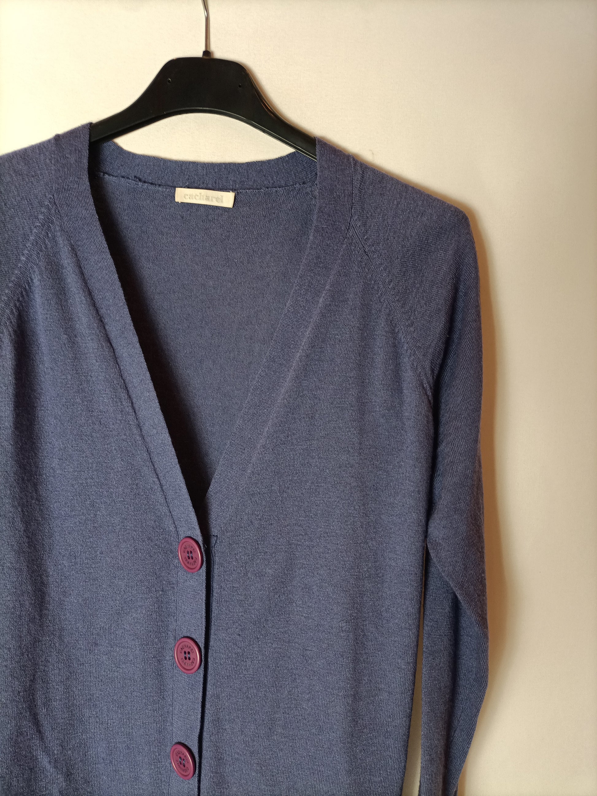 Cárdigan largo morado. 75% Lana, 25% seda. Botones con clip