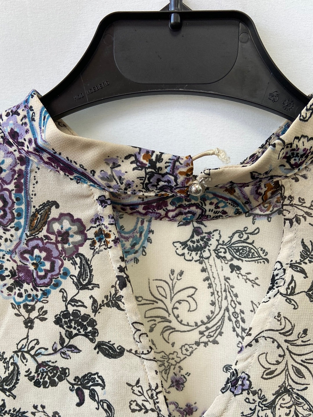 blusa fluida semitransparente. Estampado amebas. Mangas volantes. No elástico. Largo 61 cm. Tara: uno de los enganches está roto, habría que coserlo
