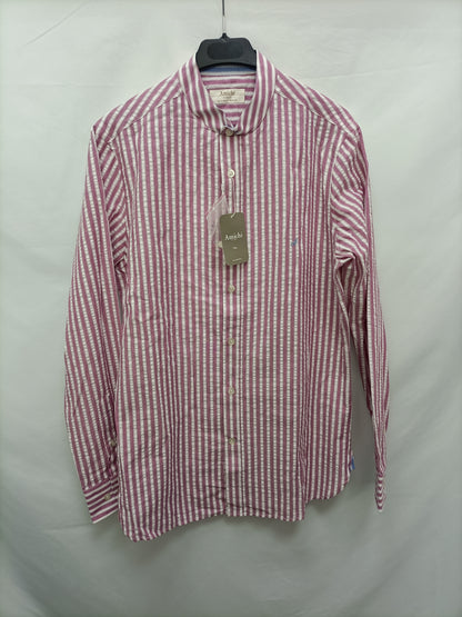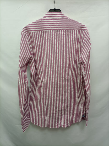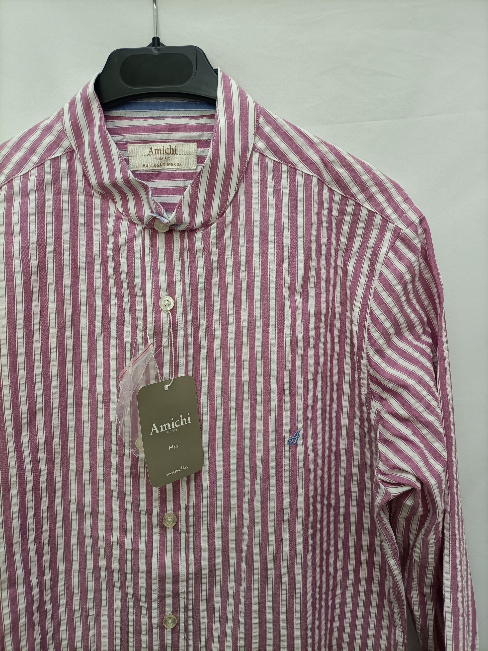 Camisa de rayas blanca y rosa oscuro abototada con el cuello Mao. Estilo clásico.