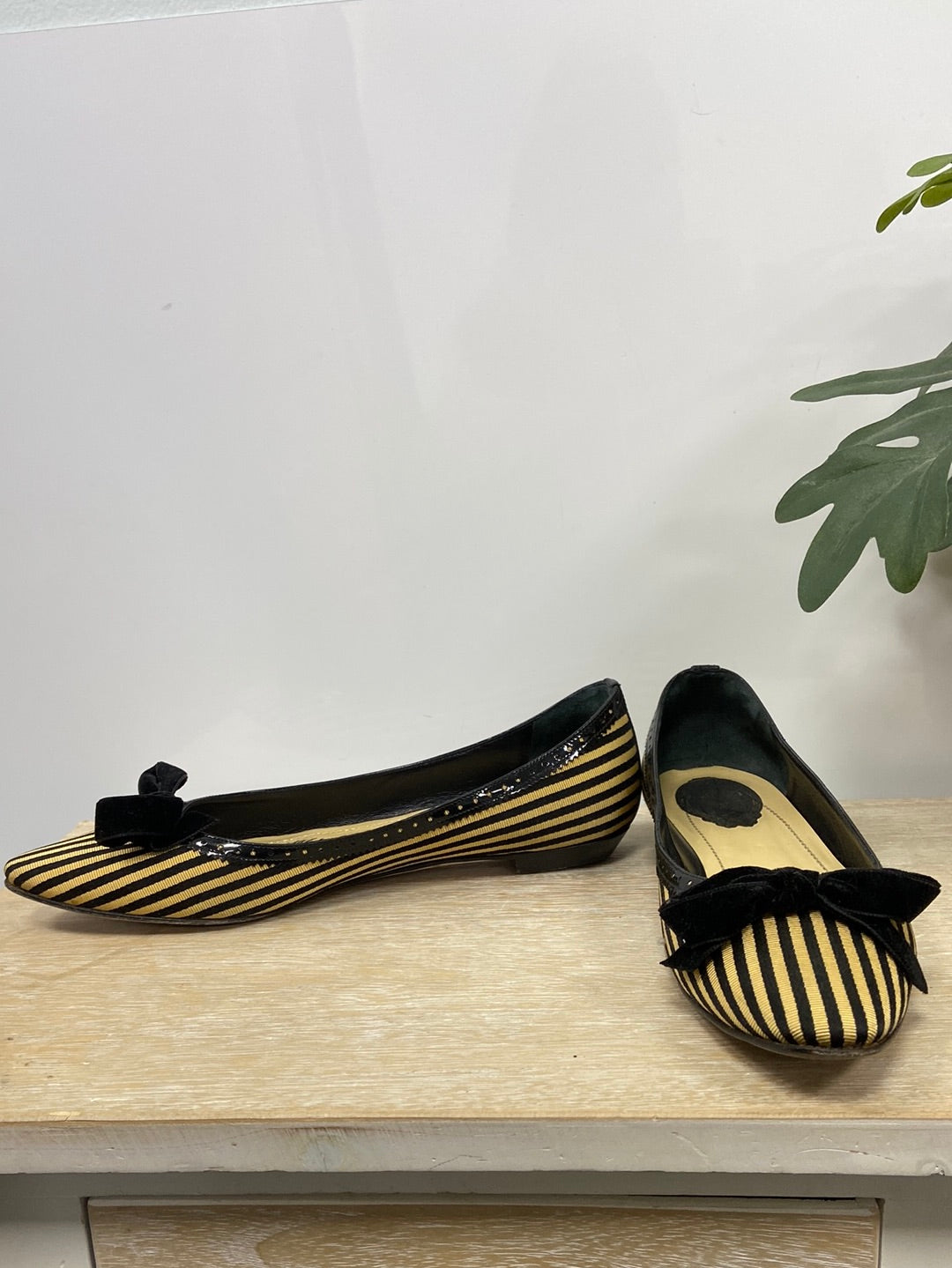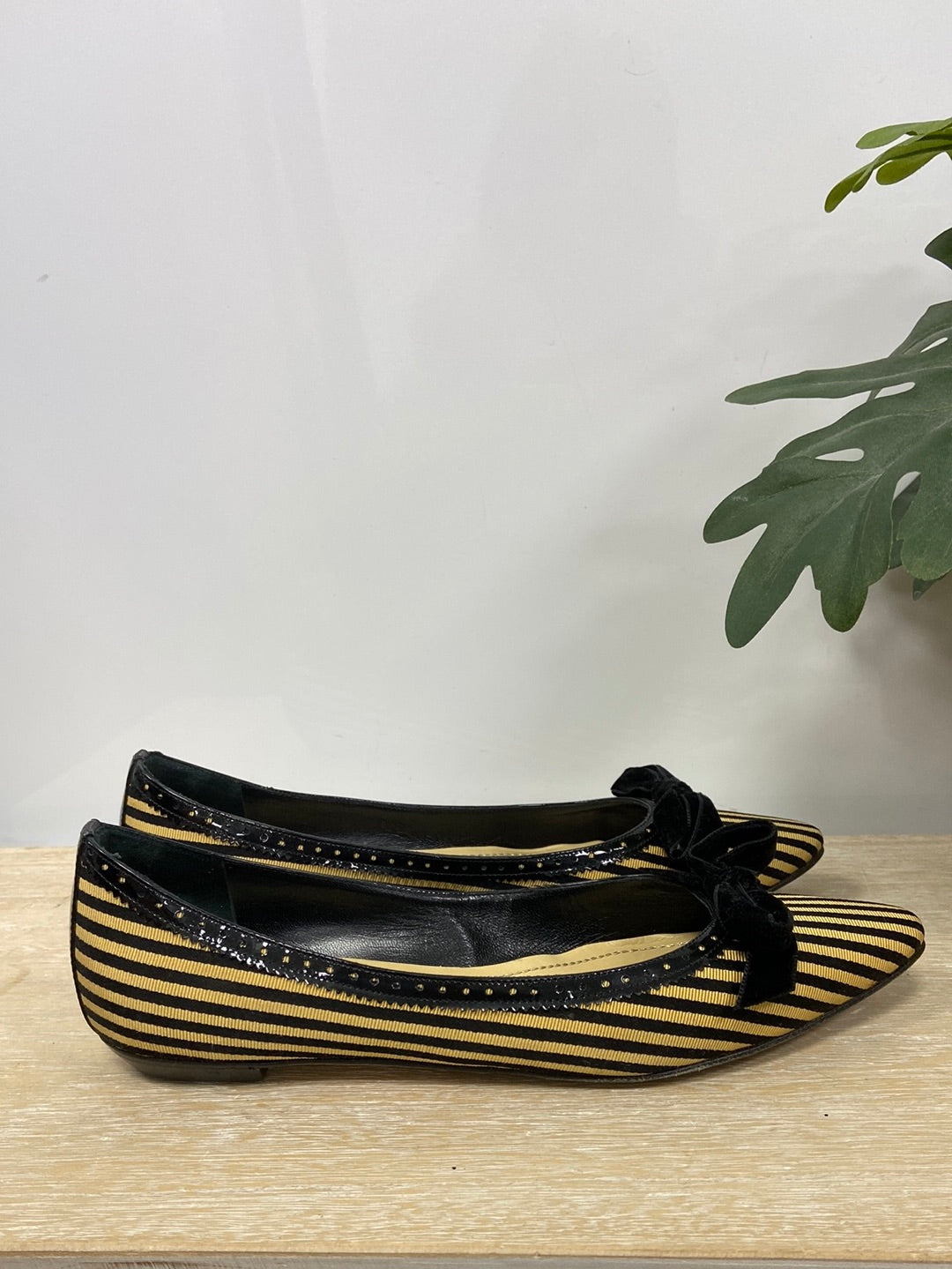 Manoletinas rayas beiges y negras con lazo de terciopelo