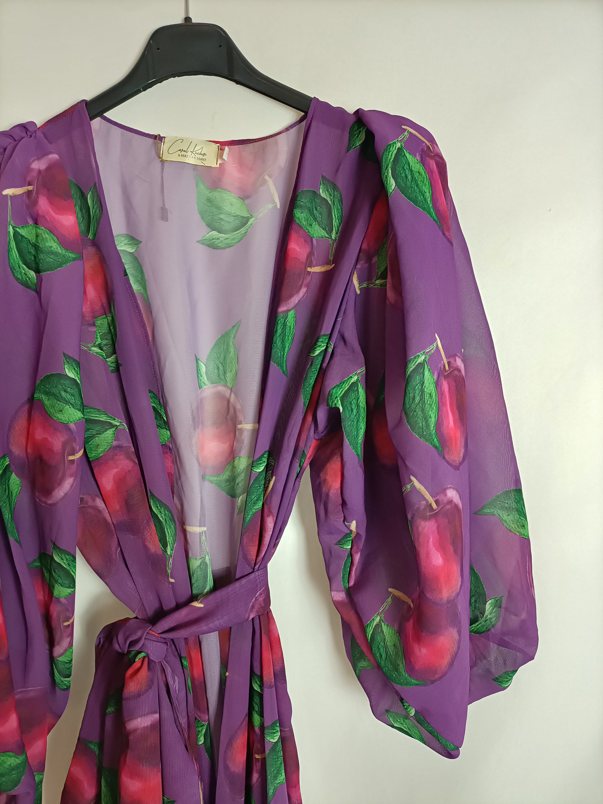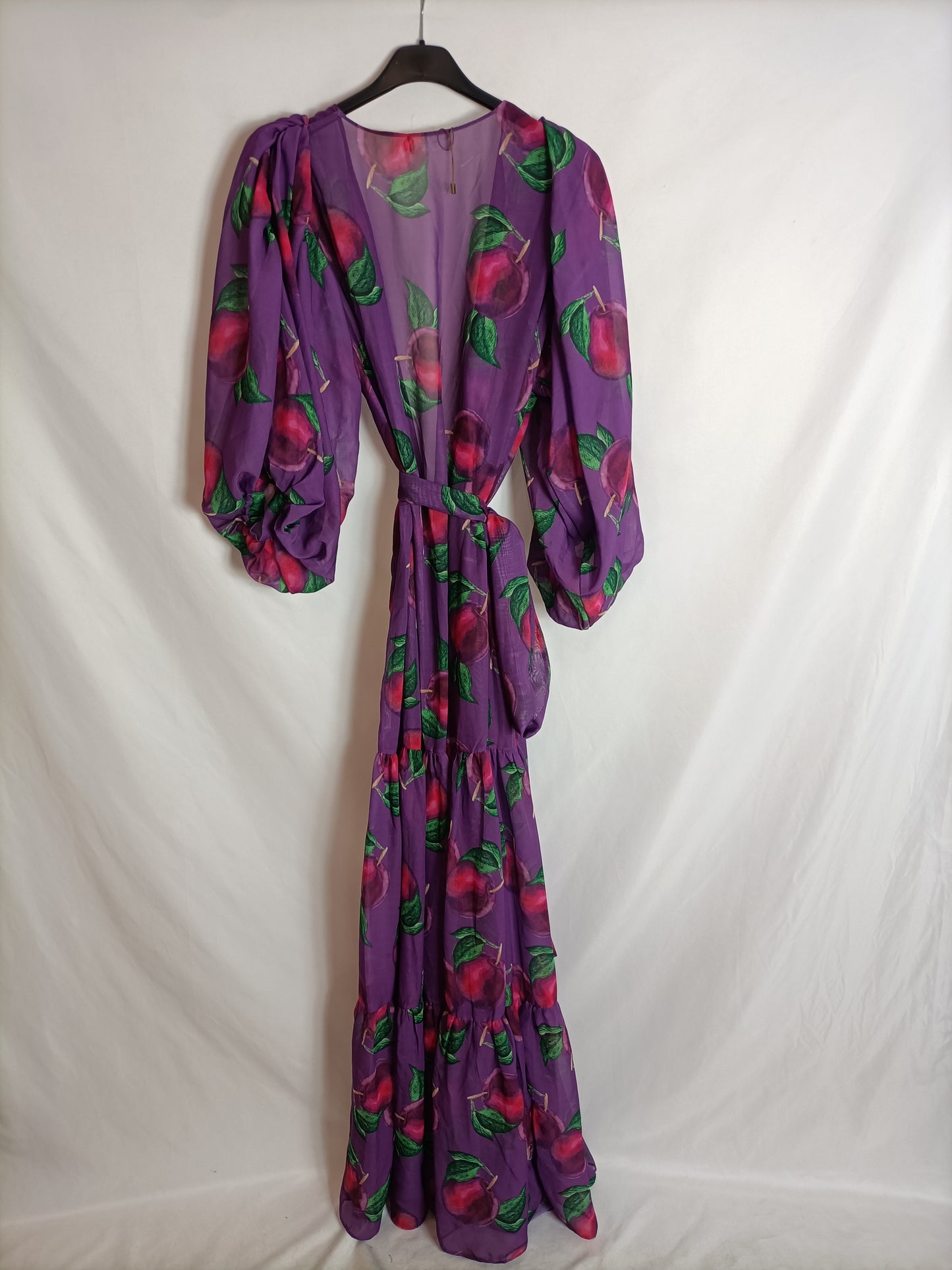 Vestido largo/ kimono morado flores. Lleva cinturón. No elástico. mangas abuellonadas