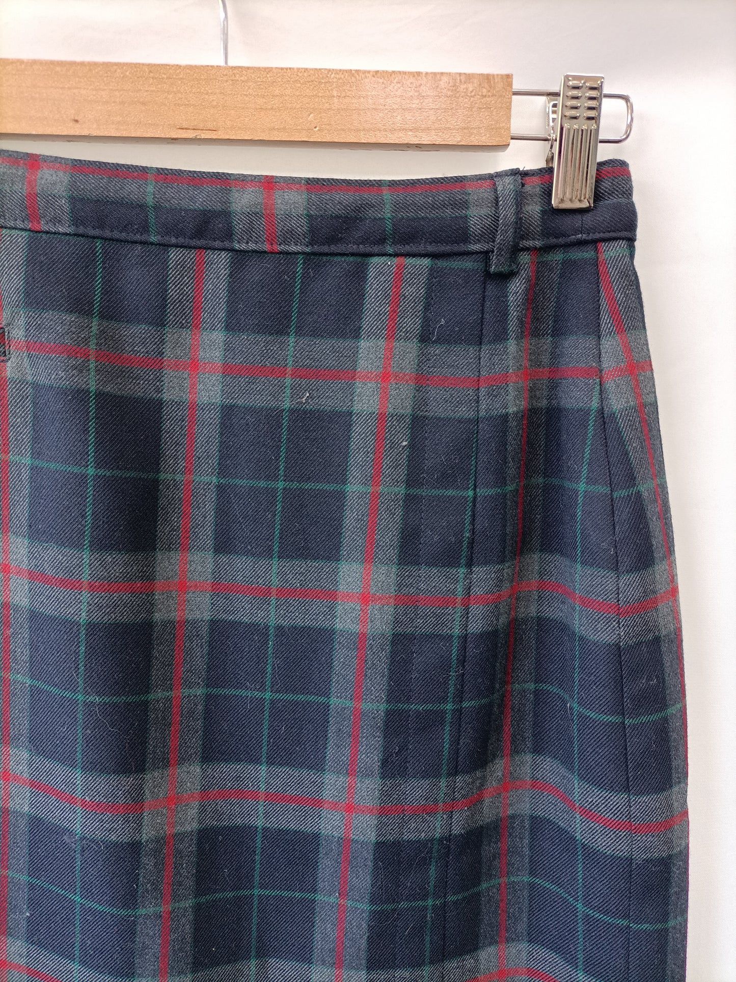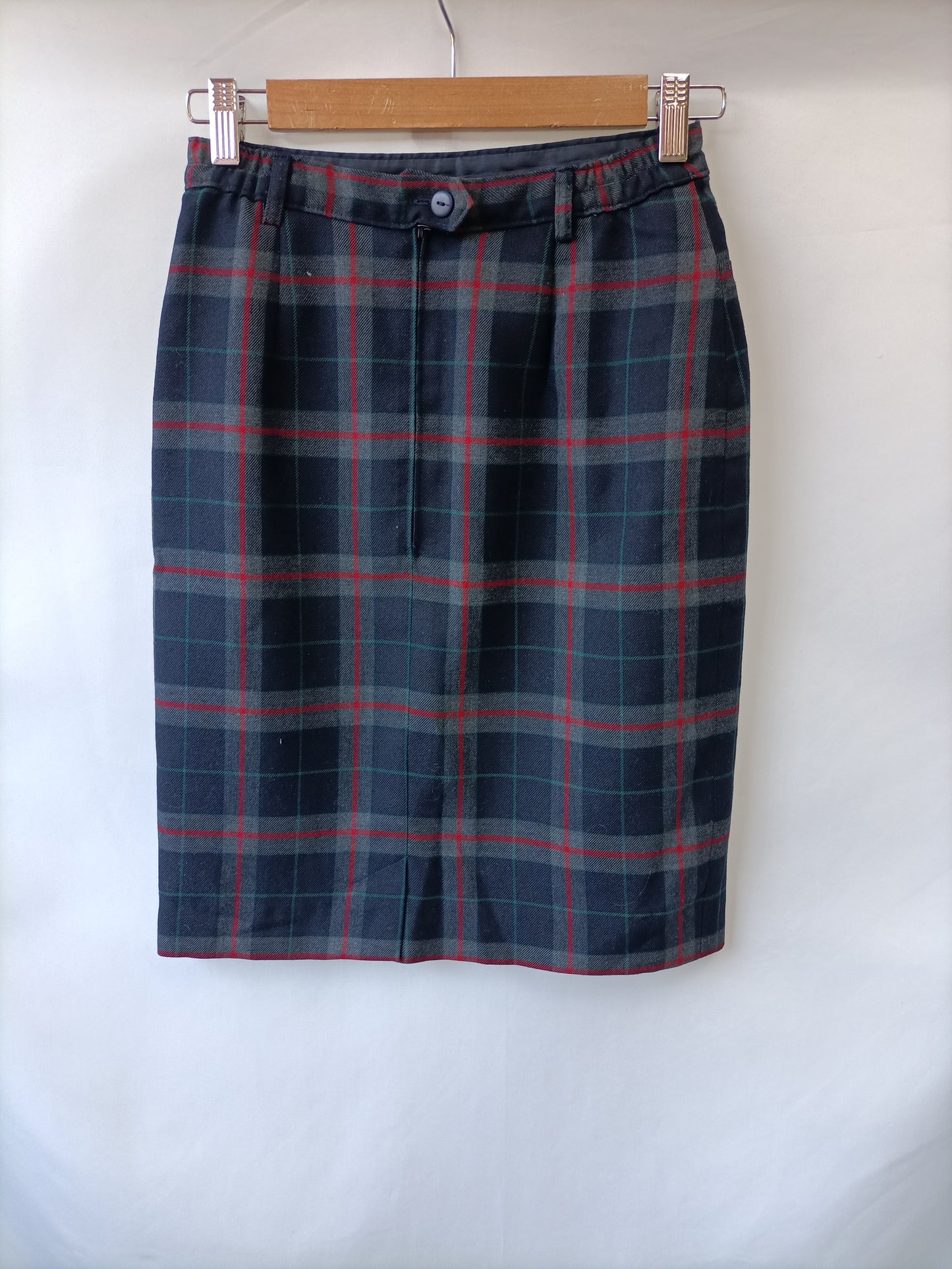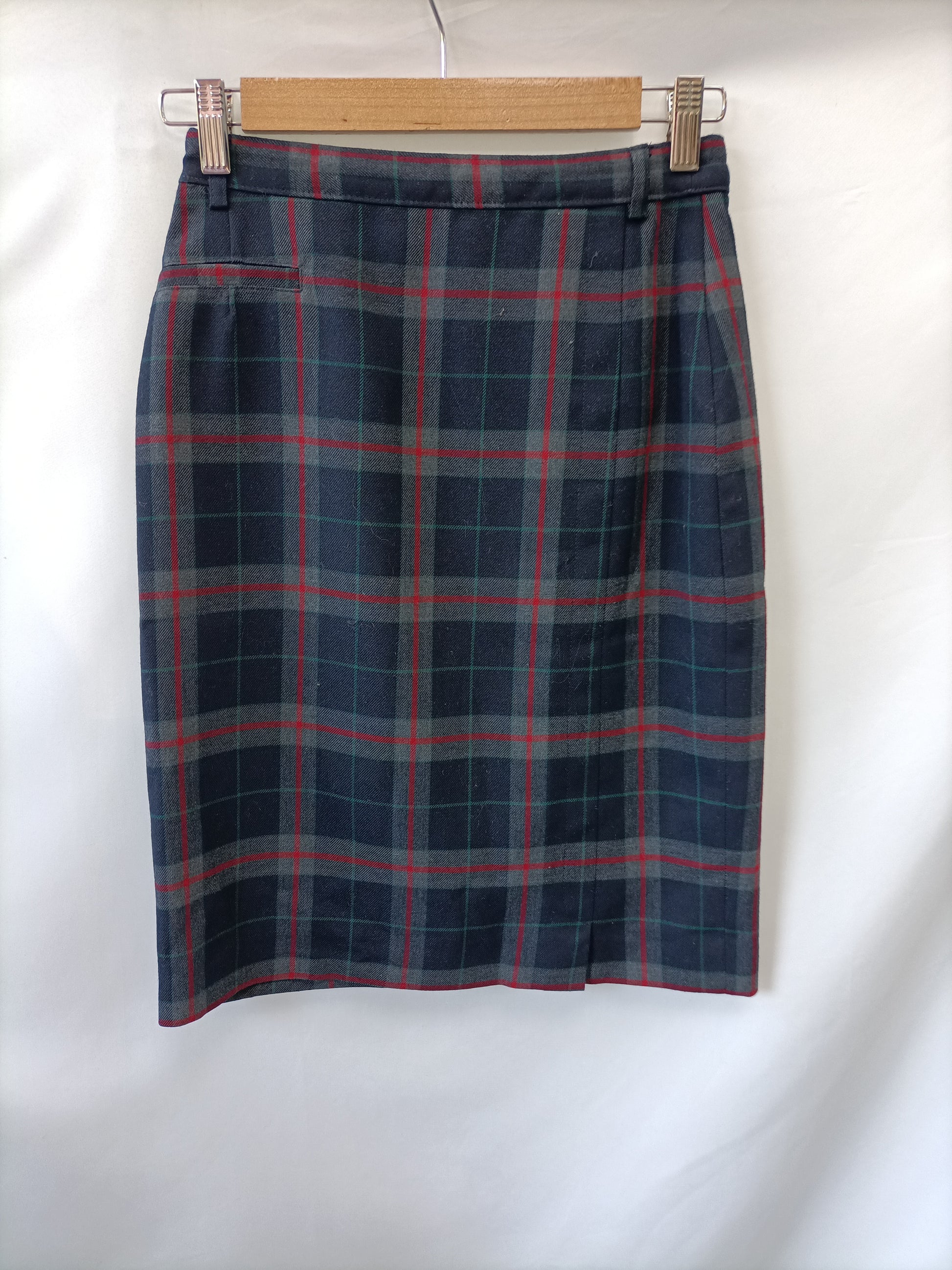 Falda de cuadros en tonos grises y azules. Cortita y ajustada. No elástica . Cintura 33 cm largo 53 cm lazada delantera, el tejido es satinado.