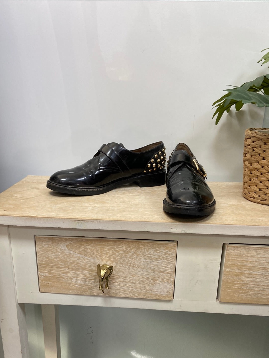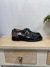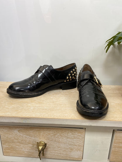 Zapatos negro de hebilla con tachuelas doradas en el talón