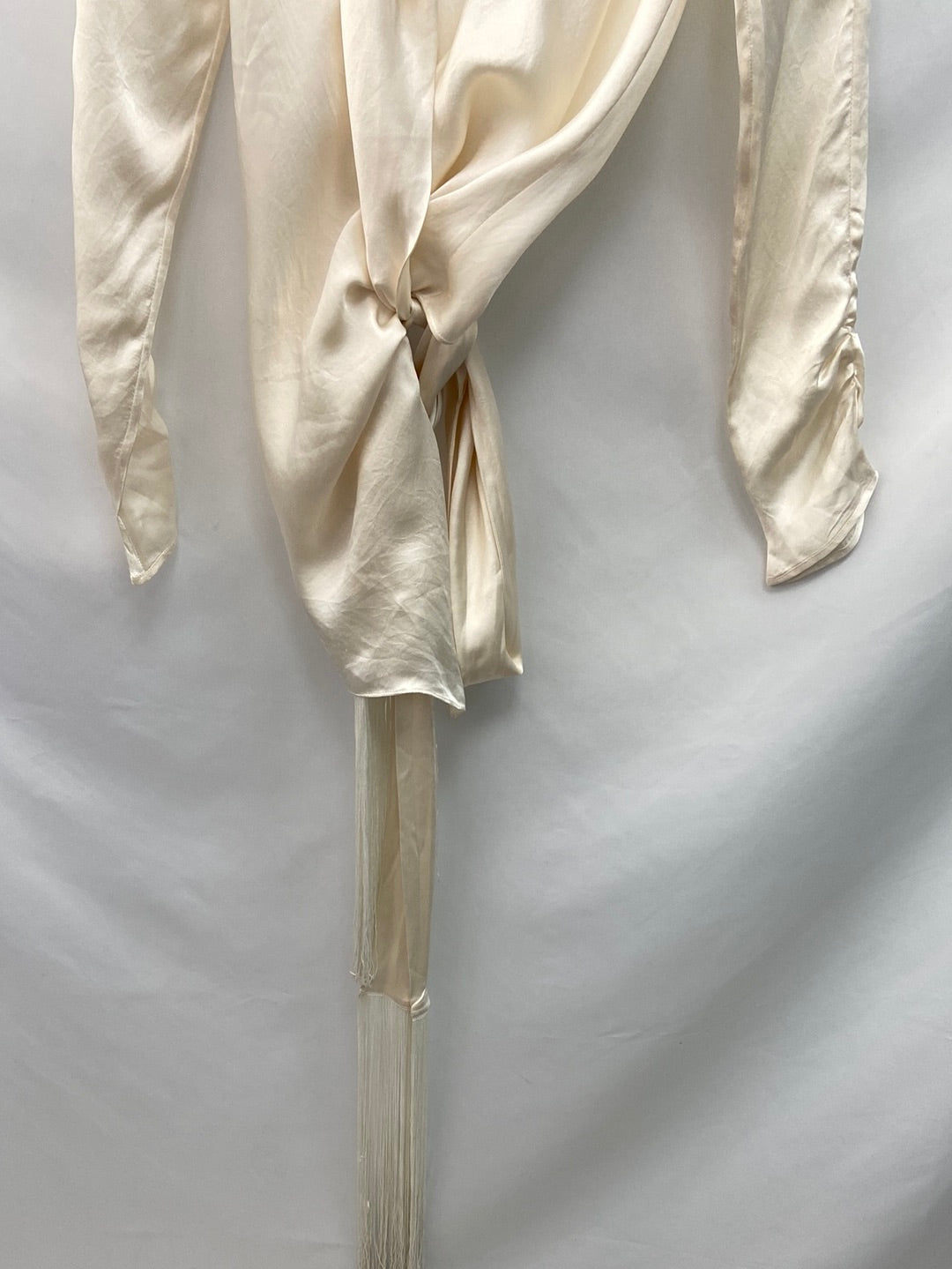 Blusa cruzada color perla con la parte e abajo de la lazada acabada en flecos. Fluida, suave y no elástica. Talla & de la marca. De sisa a sisa 48 cm, largo 56 cm