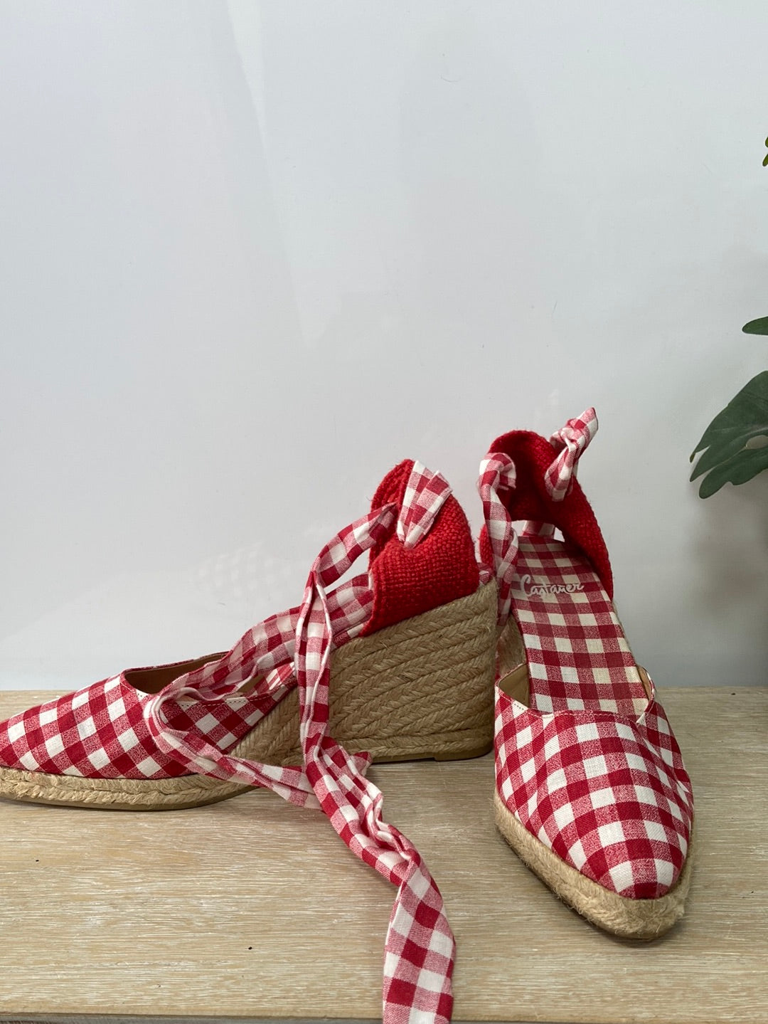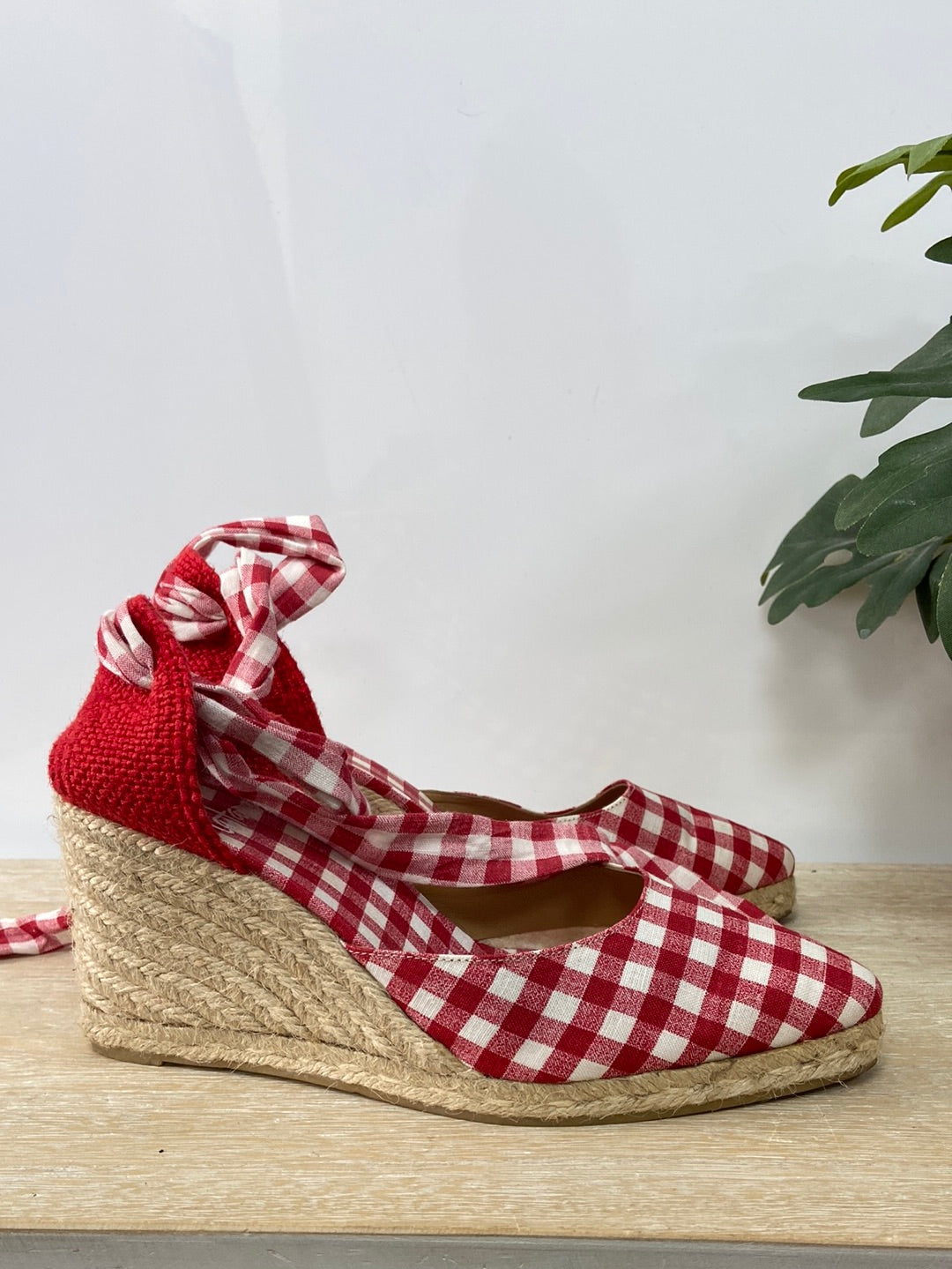 Castañer. 38. Cuñas de esparto de cuadros vichi rojos. Se abrocha. Con lazada. Tacón 8 cm plataforma 1,5 cm