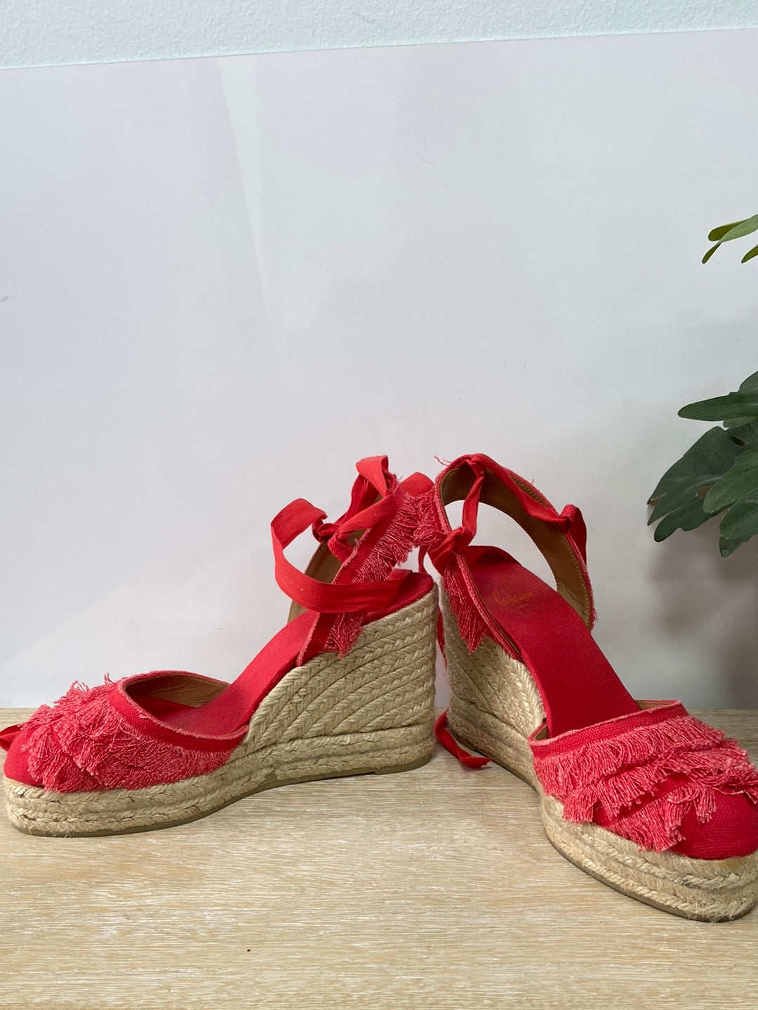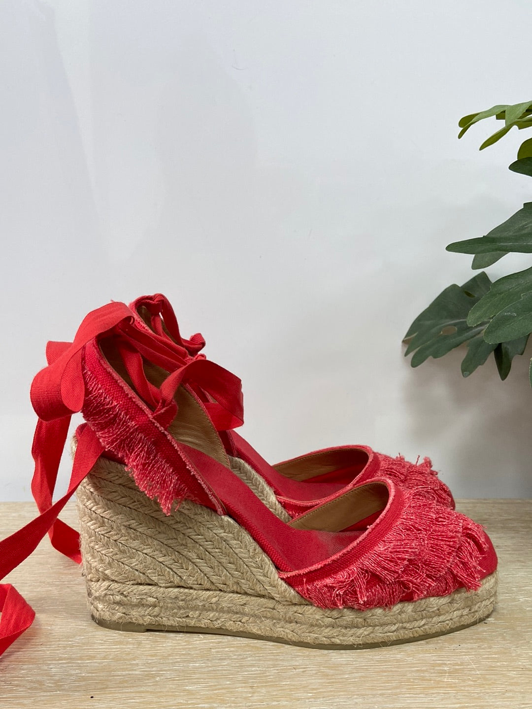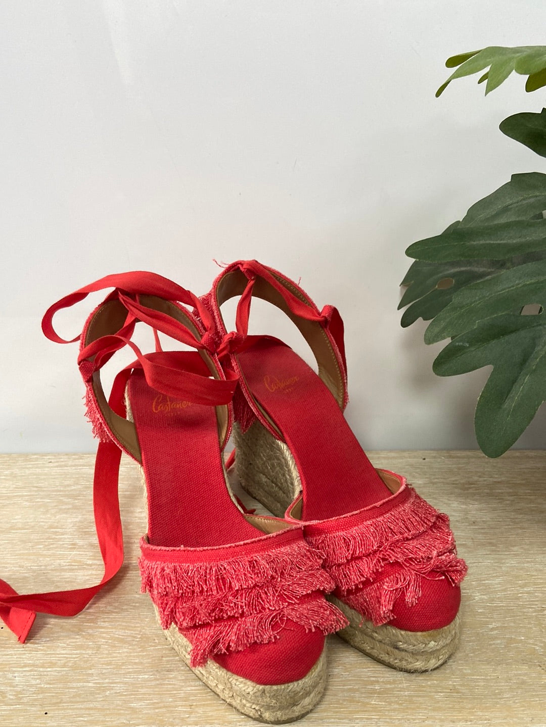 Castañer. 37. Cuñas rojas con flecos. Tacón 10 cm plataforma 2,5 cm