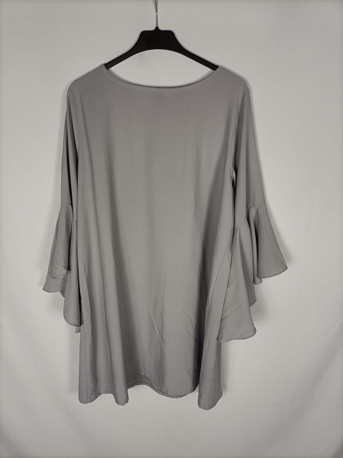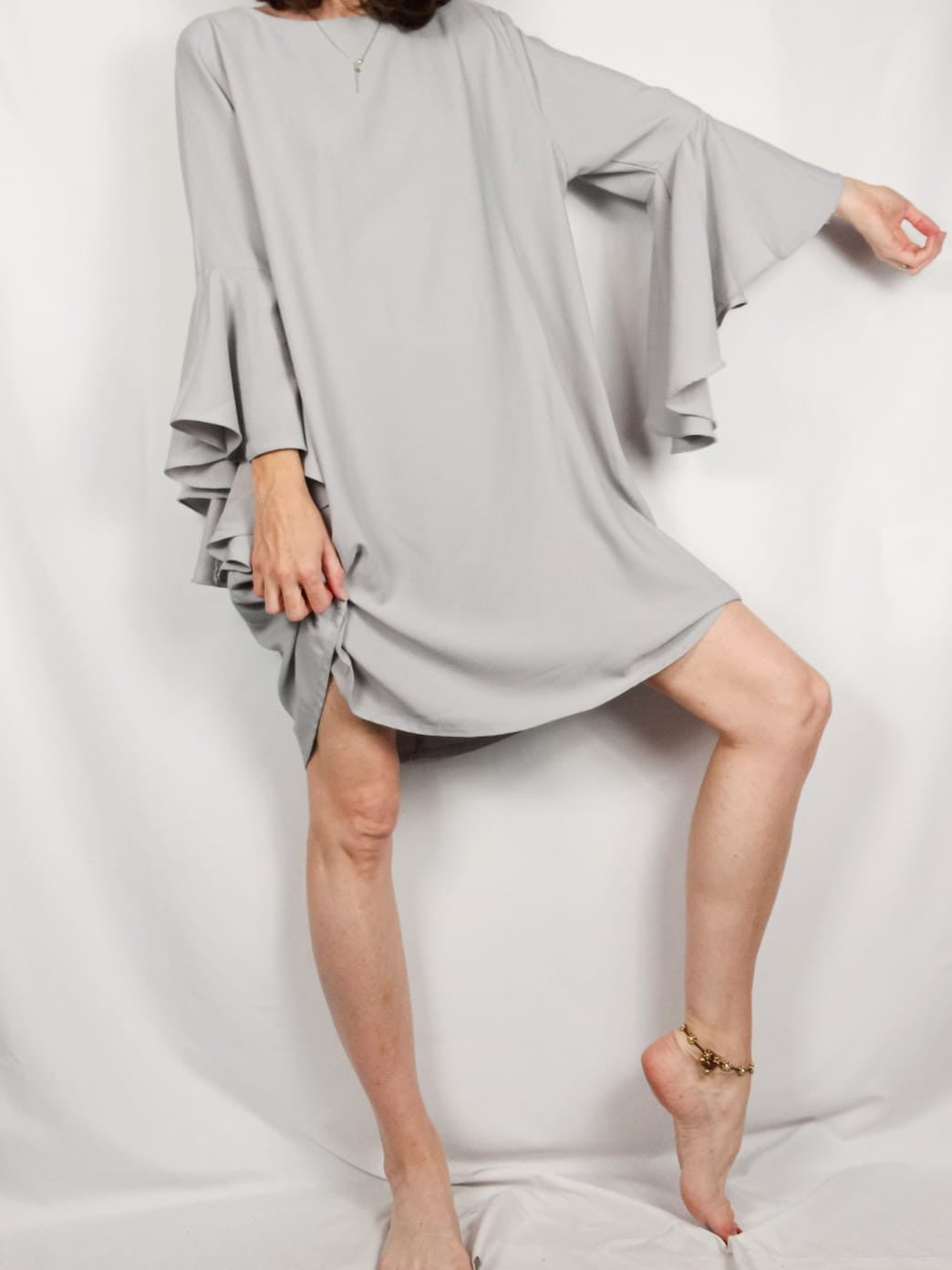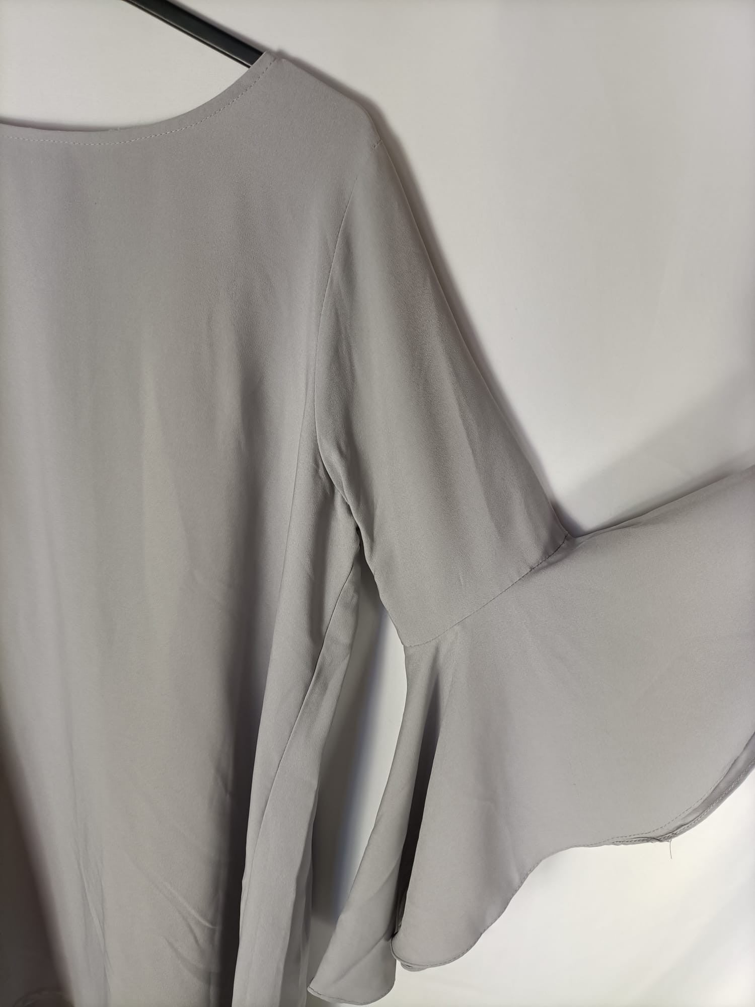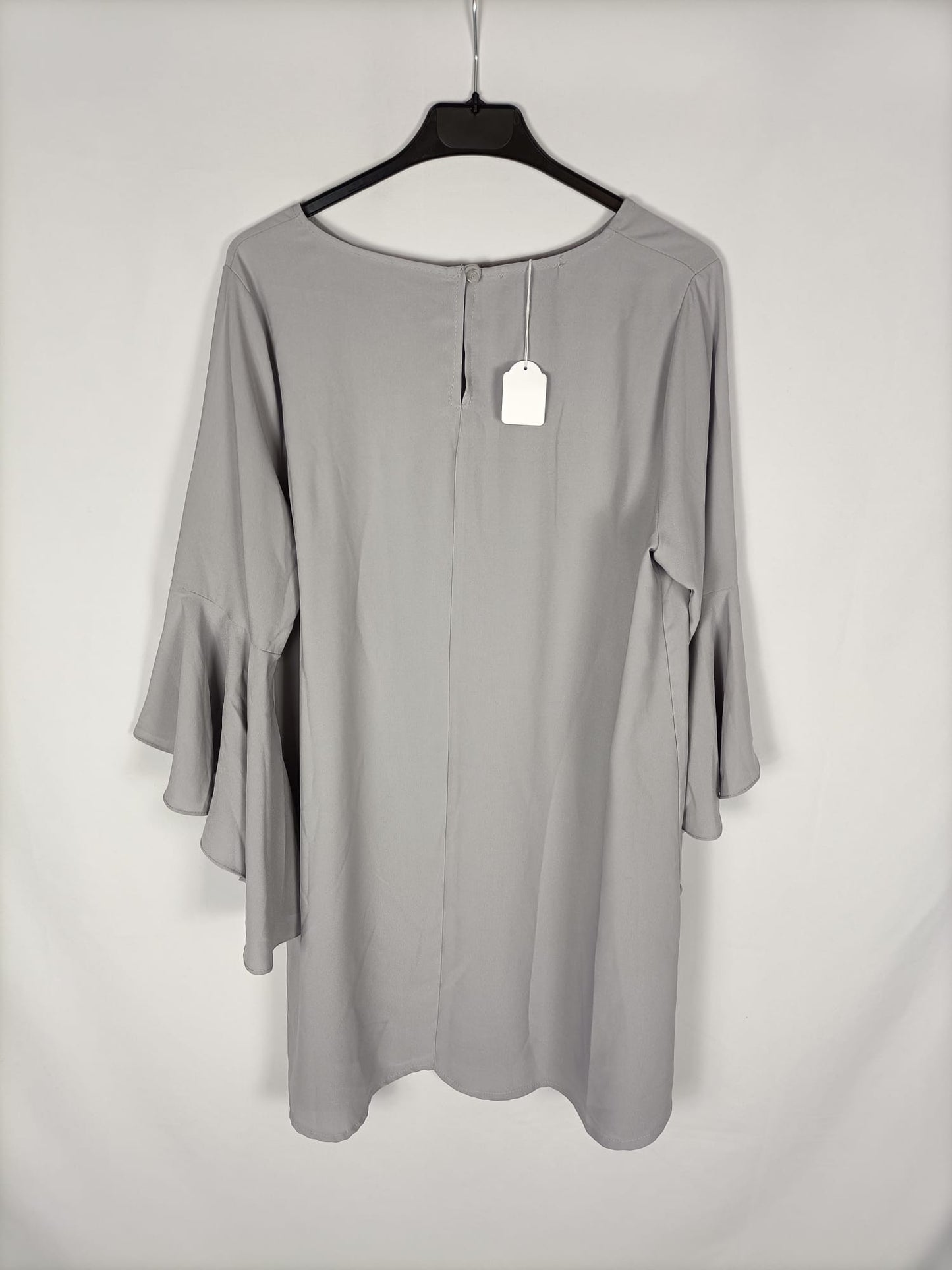 Vestido gris perla. Mangas con volantes. Escote cerrado. Espalda con botón y pequeña apertura. No es elástico
