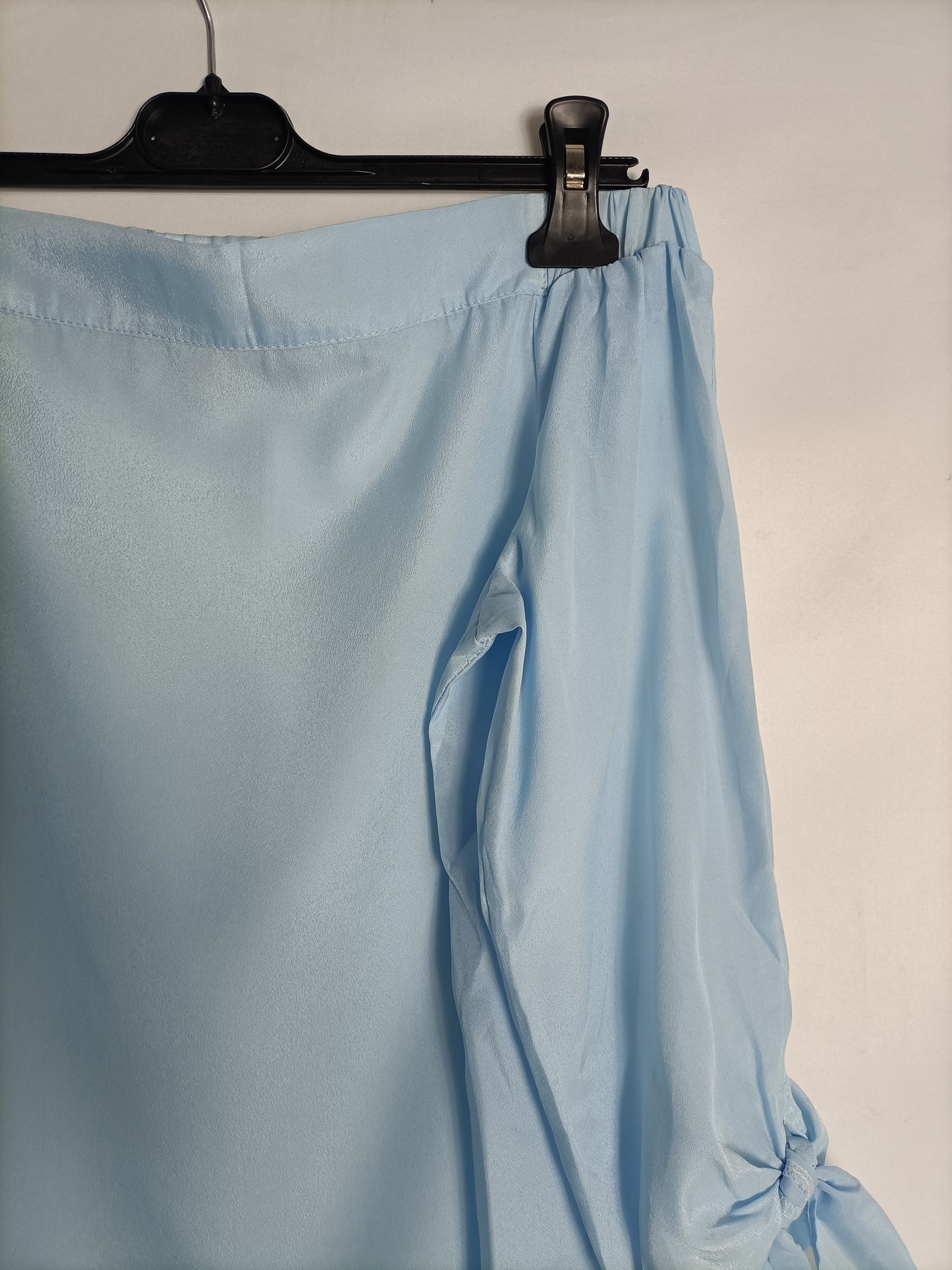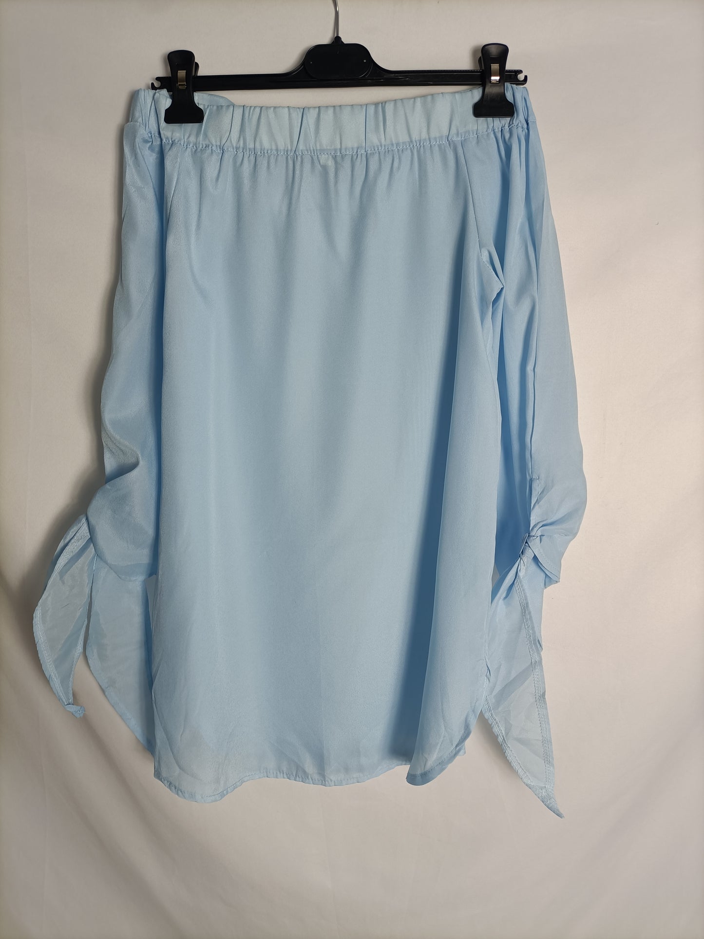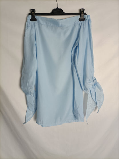 Top azul cuello barco con lazada en las mangas. de sisa a sisa 46 cm