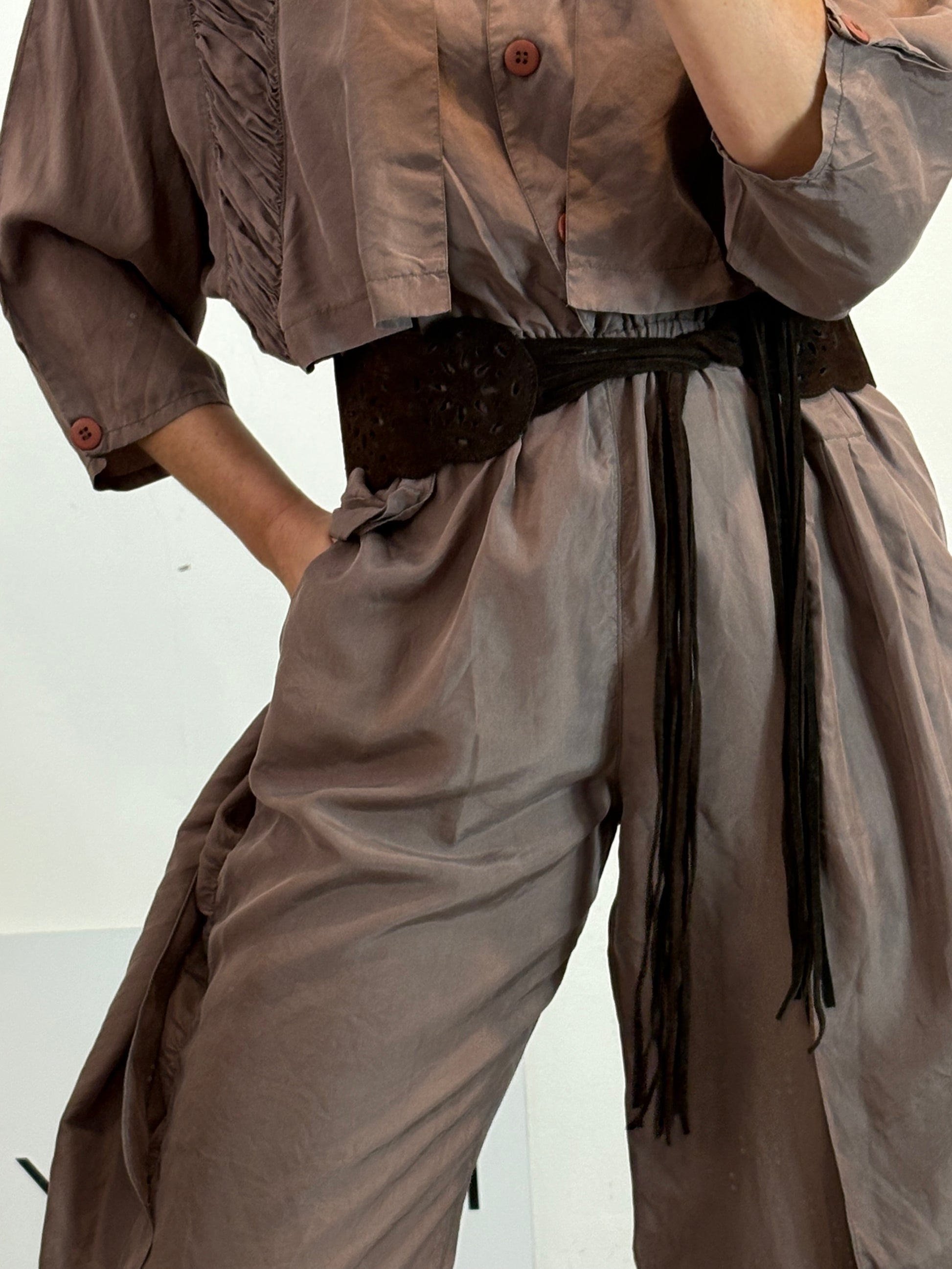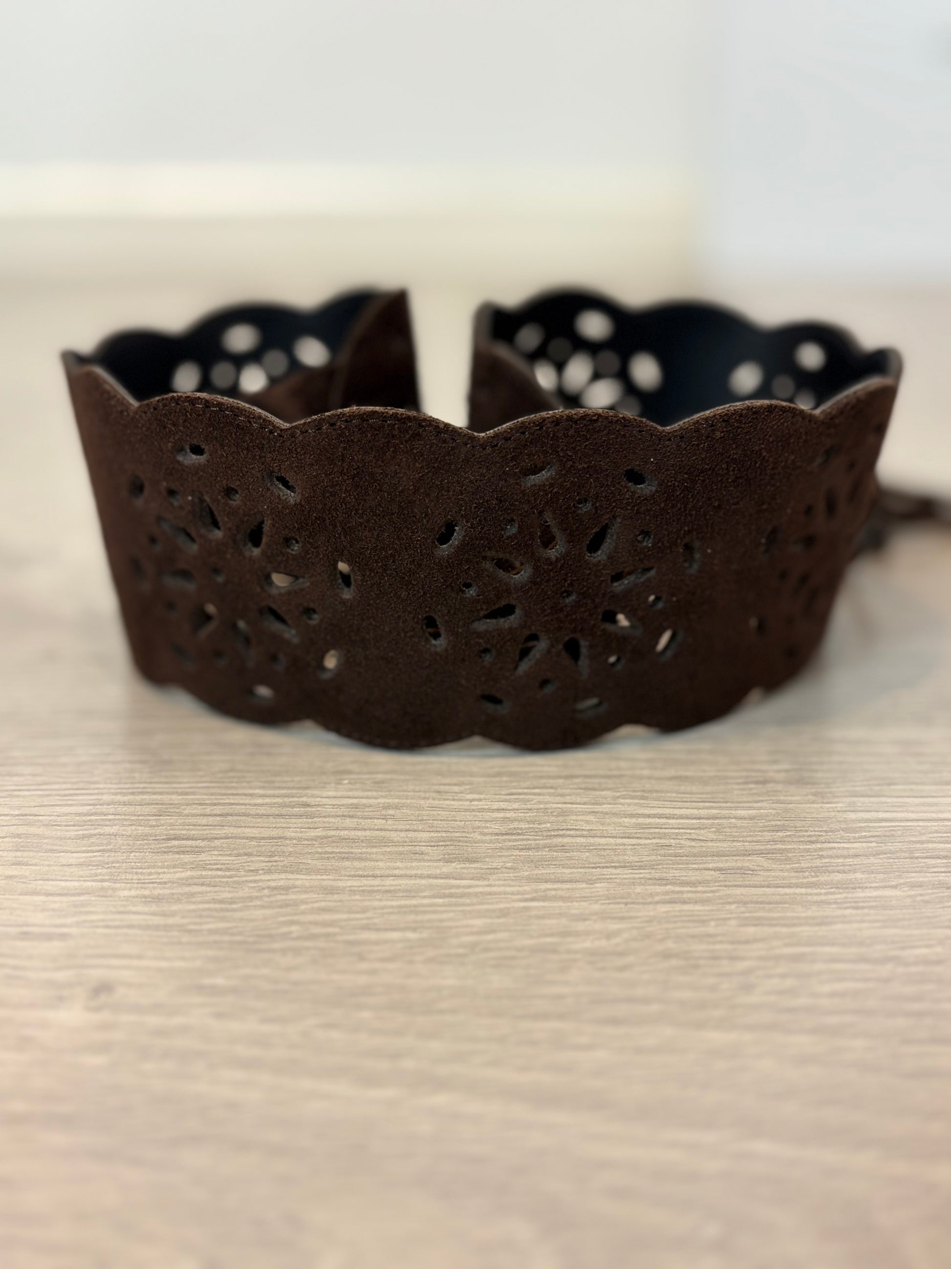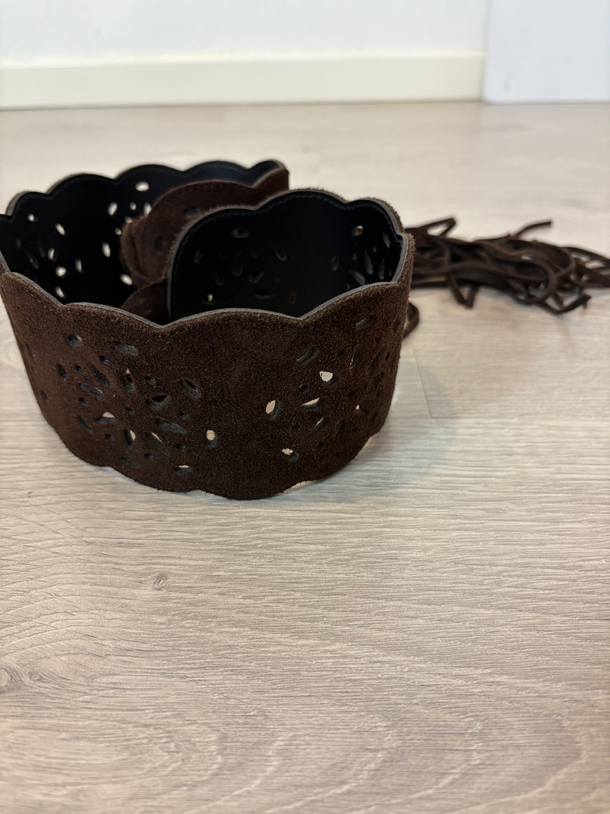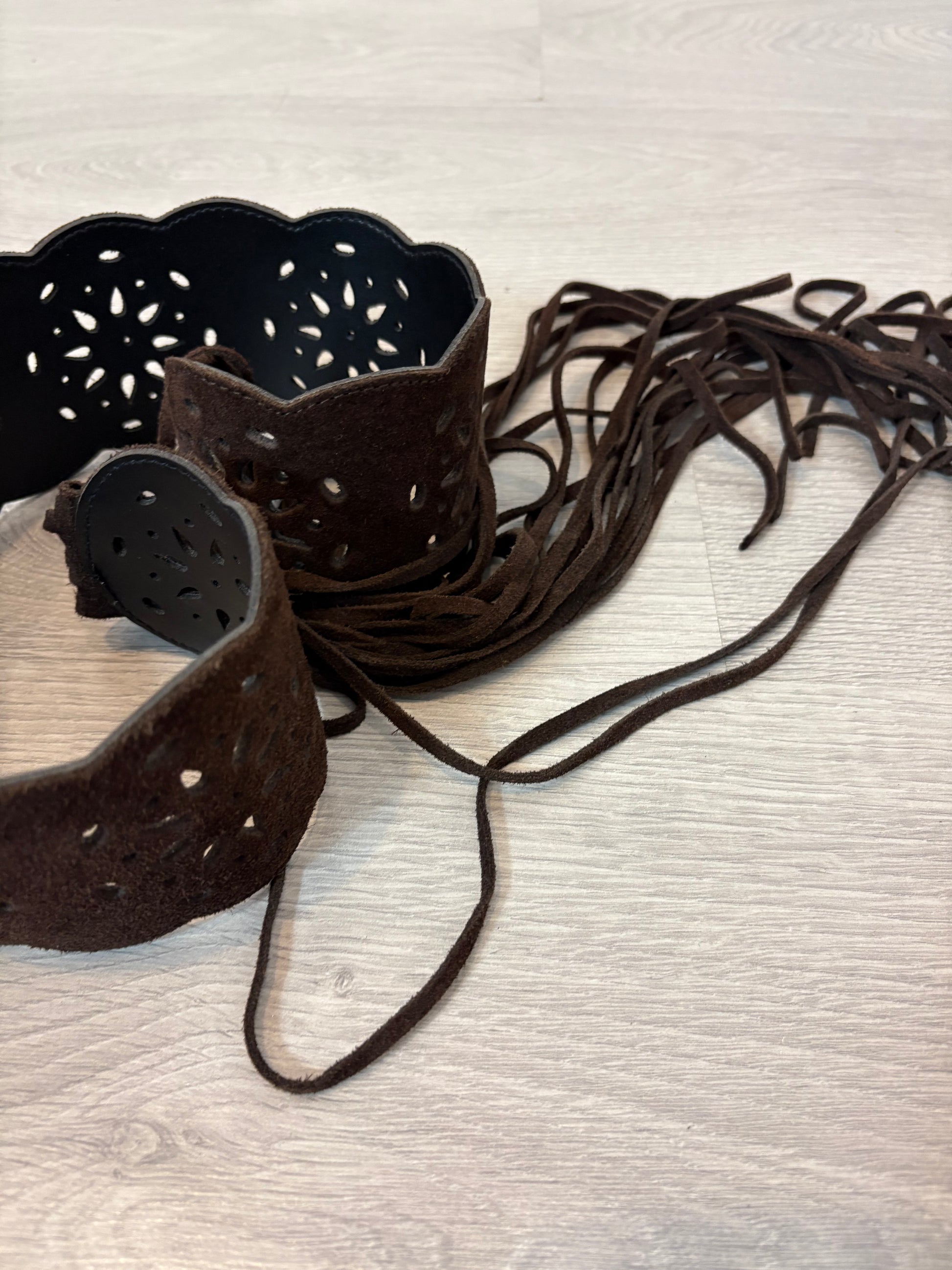 Largo sin contar flecos 69 cm, ancho 8 cm/ parece piel pero no tiene etiqueta