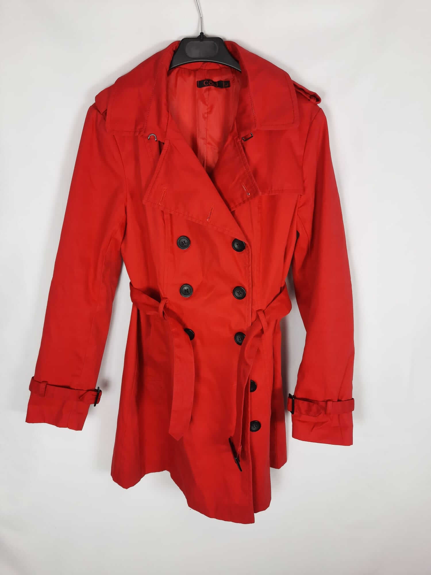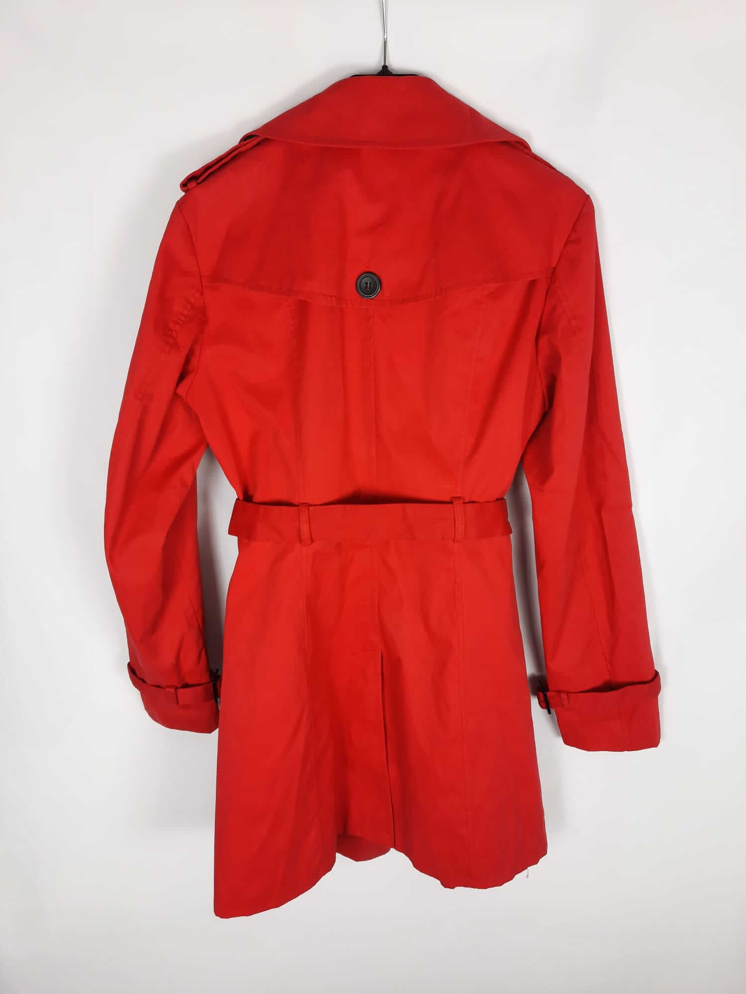 C&J. Gabarina roja cruzado con botones en negro y cinturón incorporado. Largo por debajo de la rodilla. De sisa a sisa 46 cm largo 87 cm