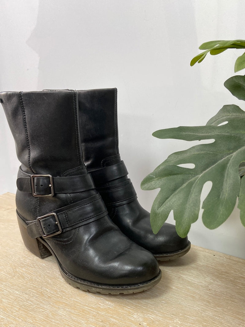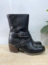 Botas negras caña media hebillas y cremallera con tacón de madera. Tacón 5,5 cm , caña desde talón 16 cm