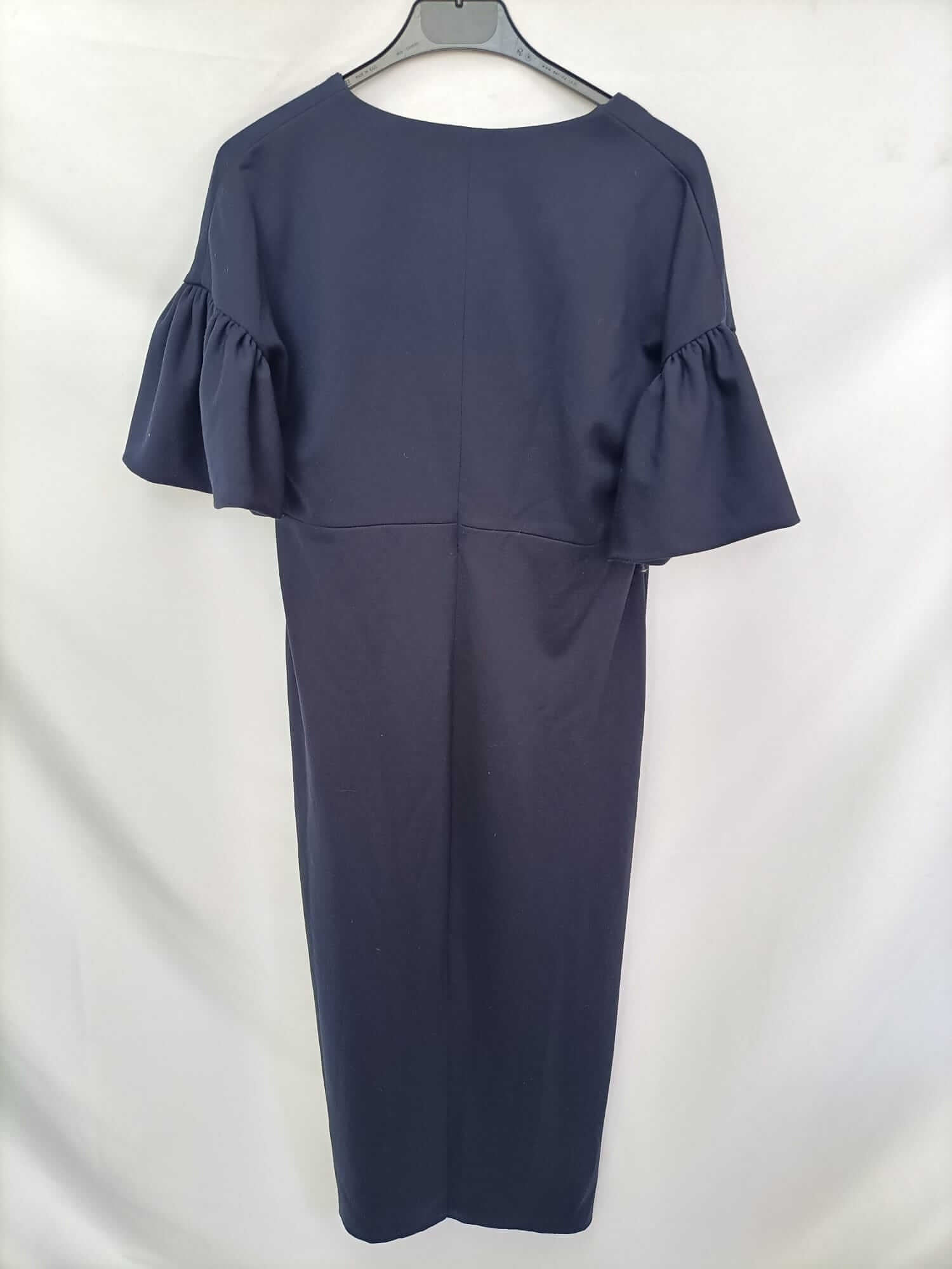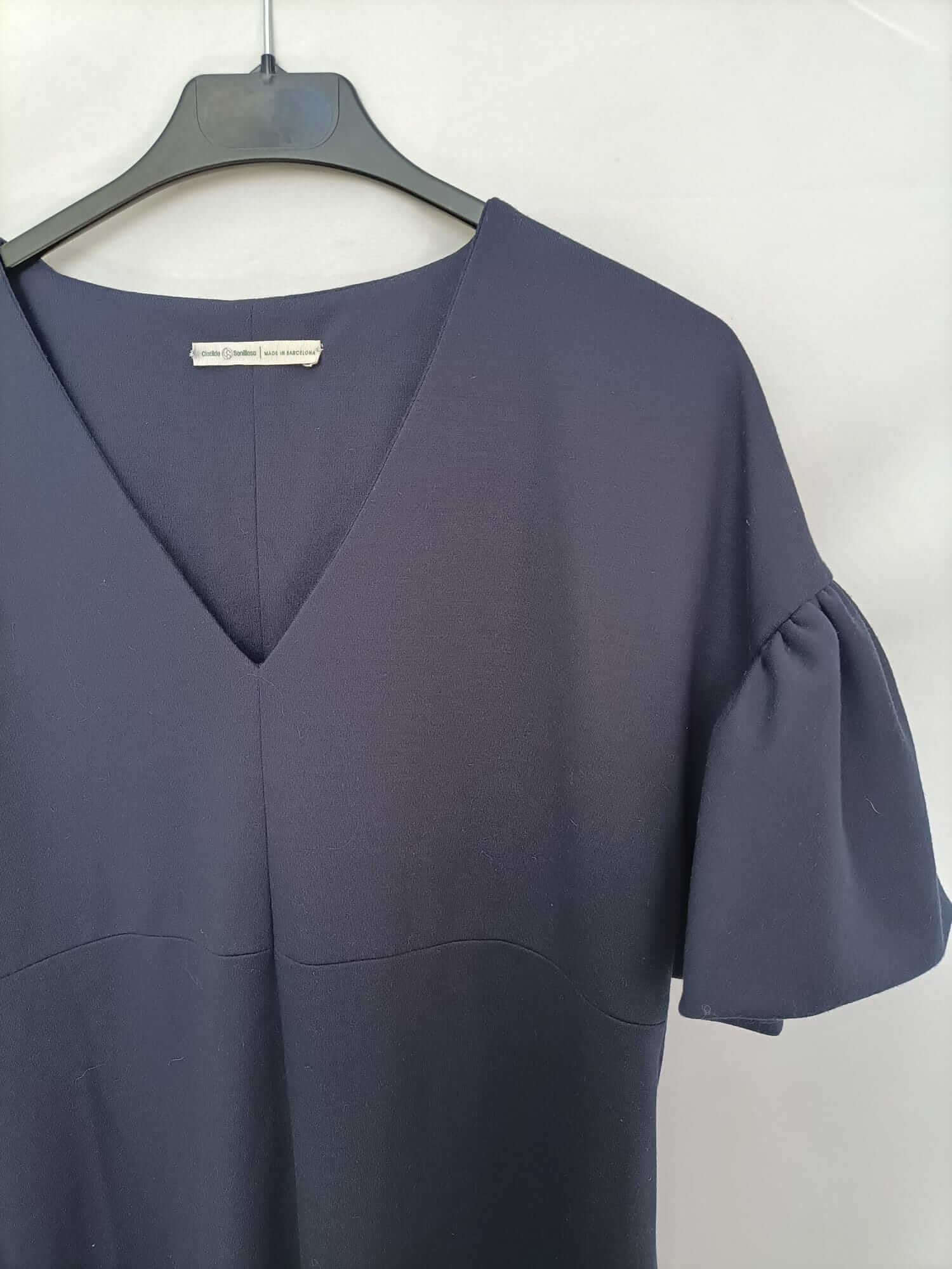 Clotilde senillosa. S. Vestido largo azul con las mangas estilo volante. Apertura delantera. Elastico. Largo 127 cm