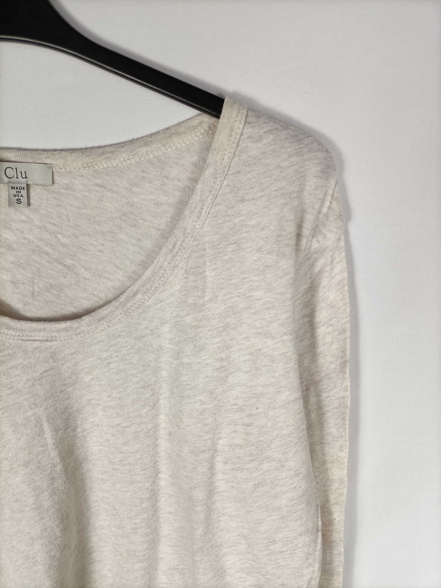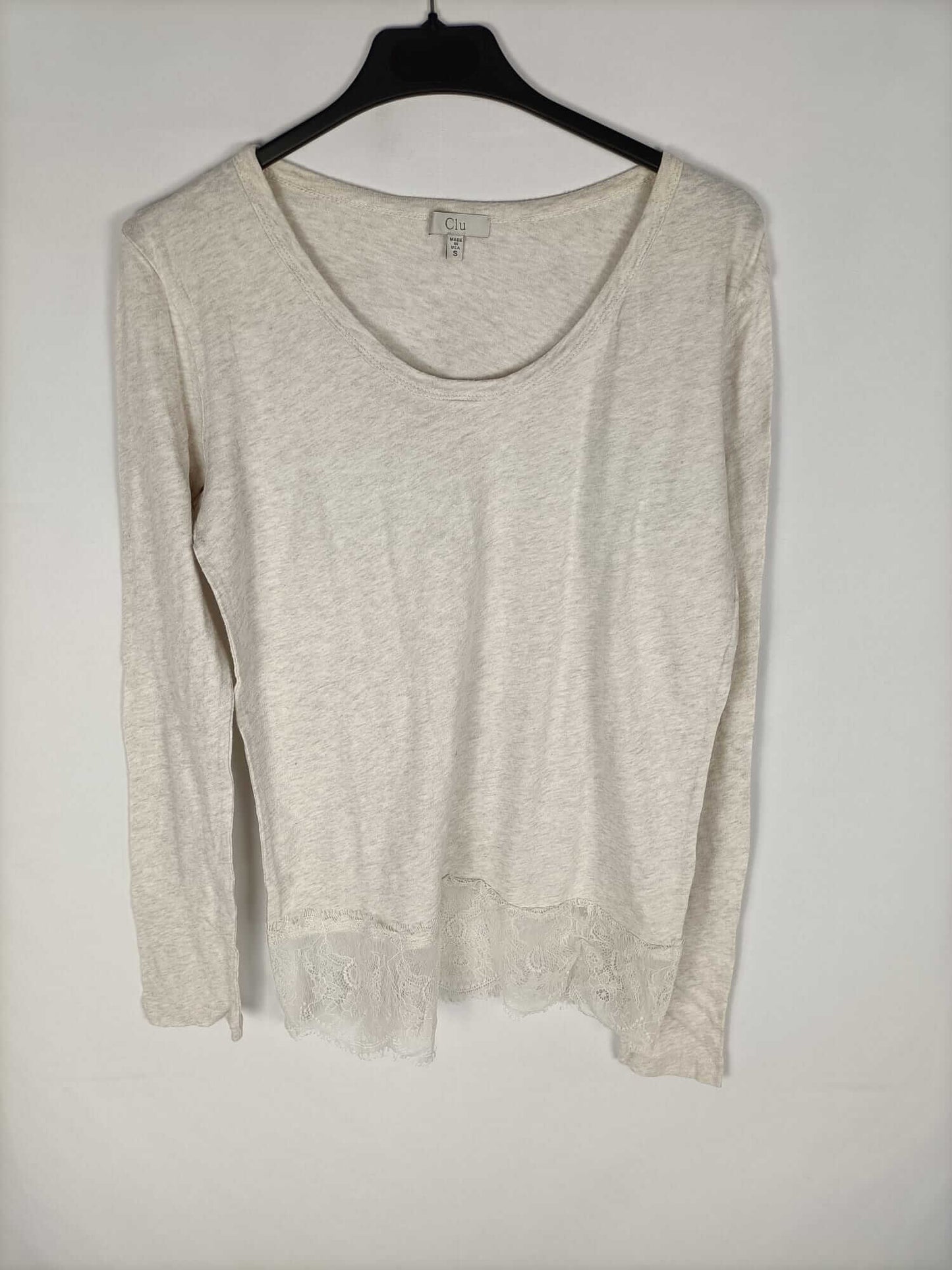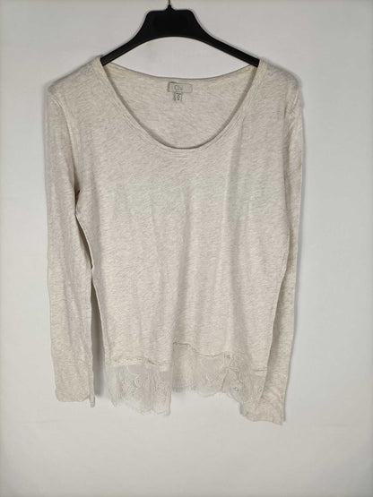 Clu. S. Camiseta básica jaspeada beige y rosa con detalle de encaje en la parte de abajo. elástica. largo 64 cm