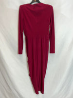 Vestido midi fruncido color vino tinto. Tiene hombreras. Largo 117 a la parte más larga. Tejido semi elástico