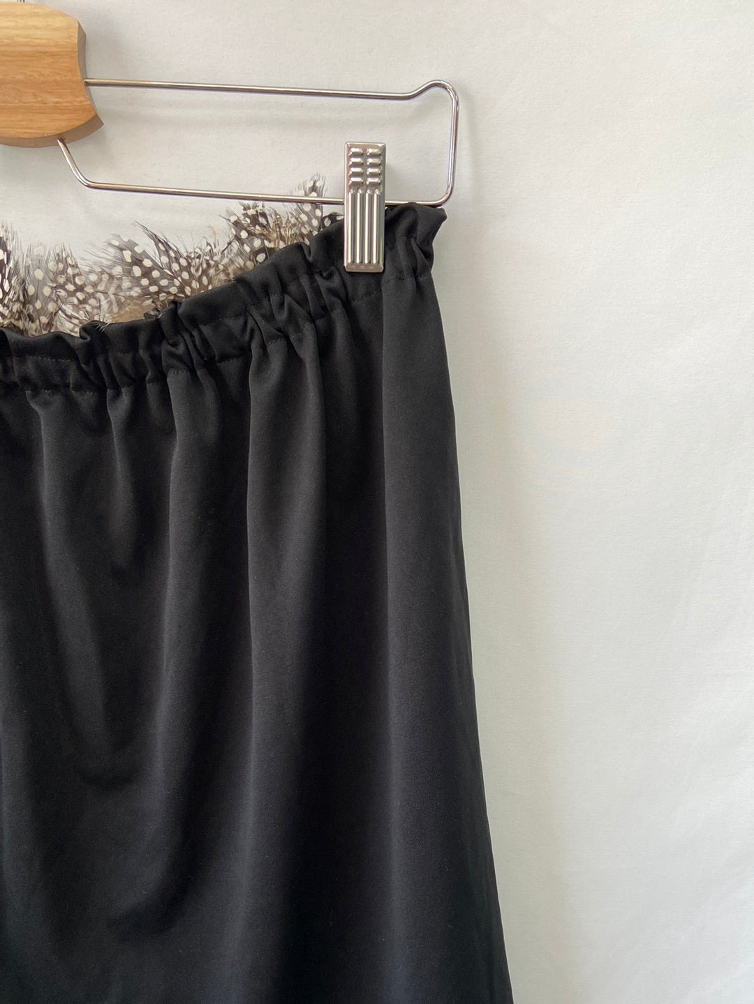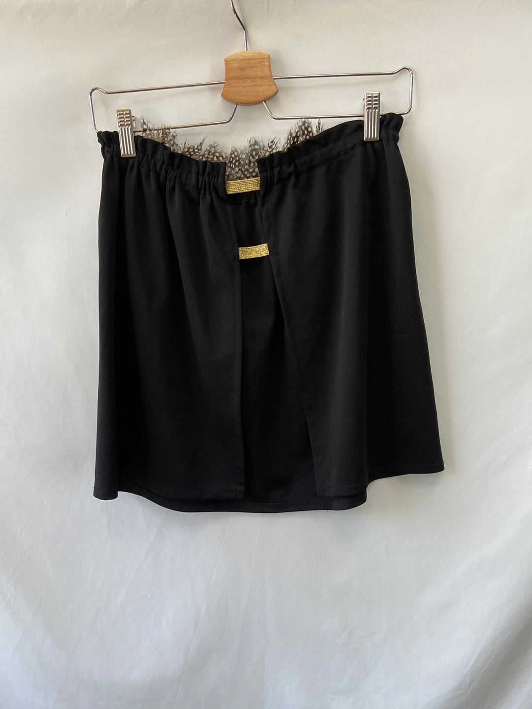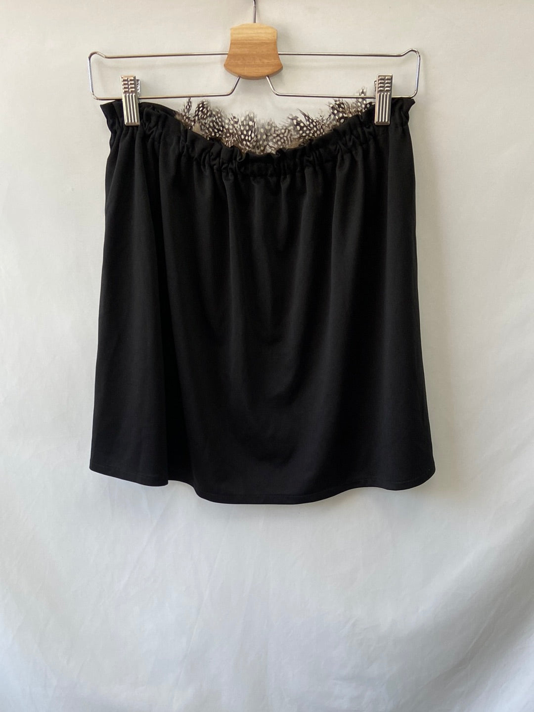 Top recto palabra de honor elástico con plumas y espalda descubierta. Largo 44 cm