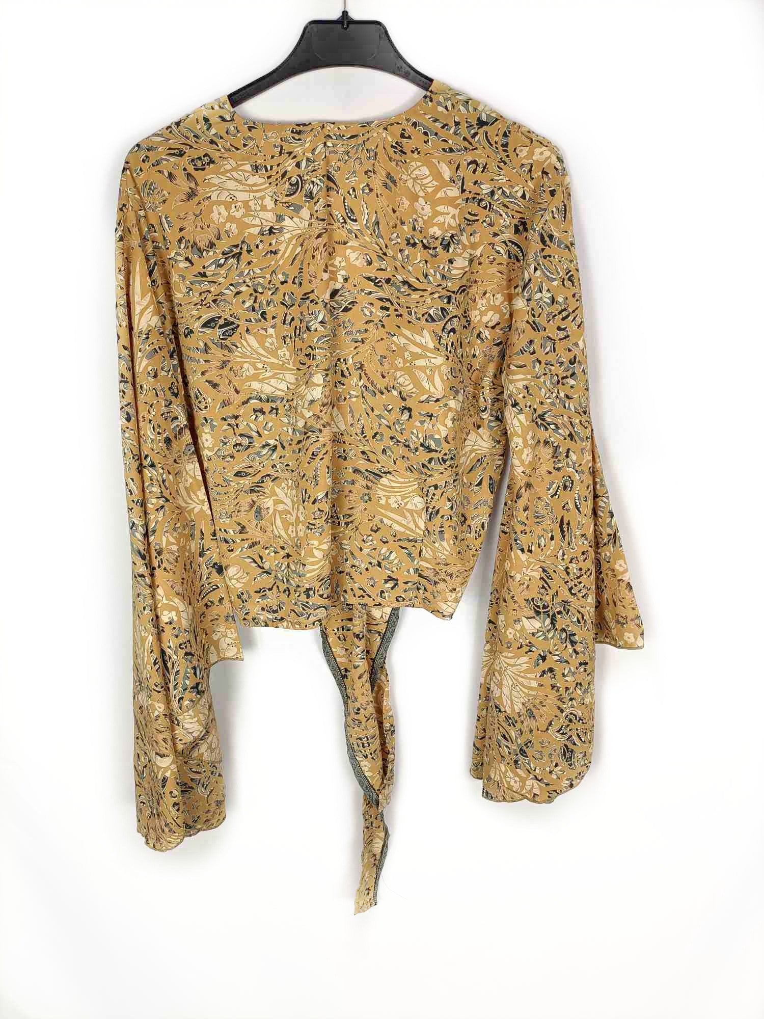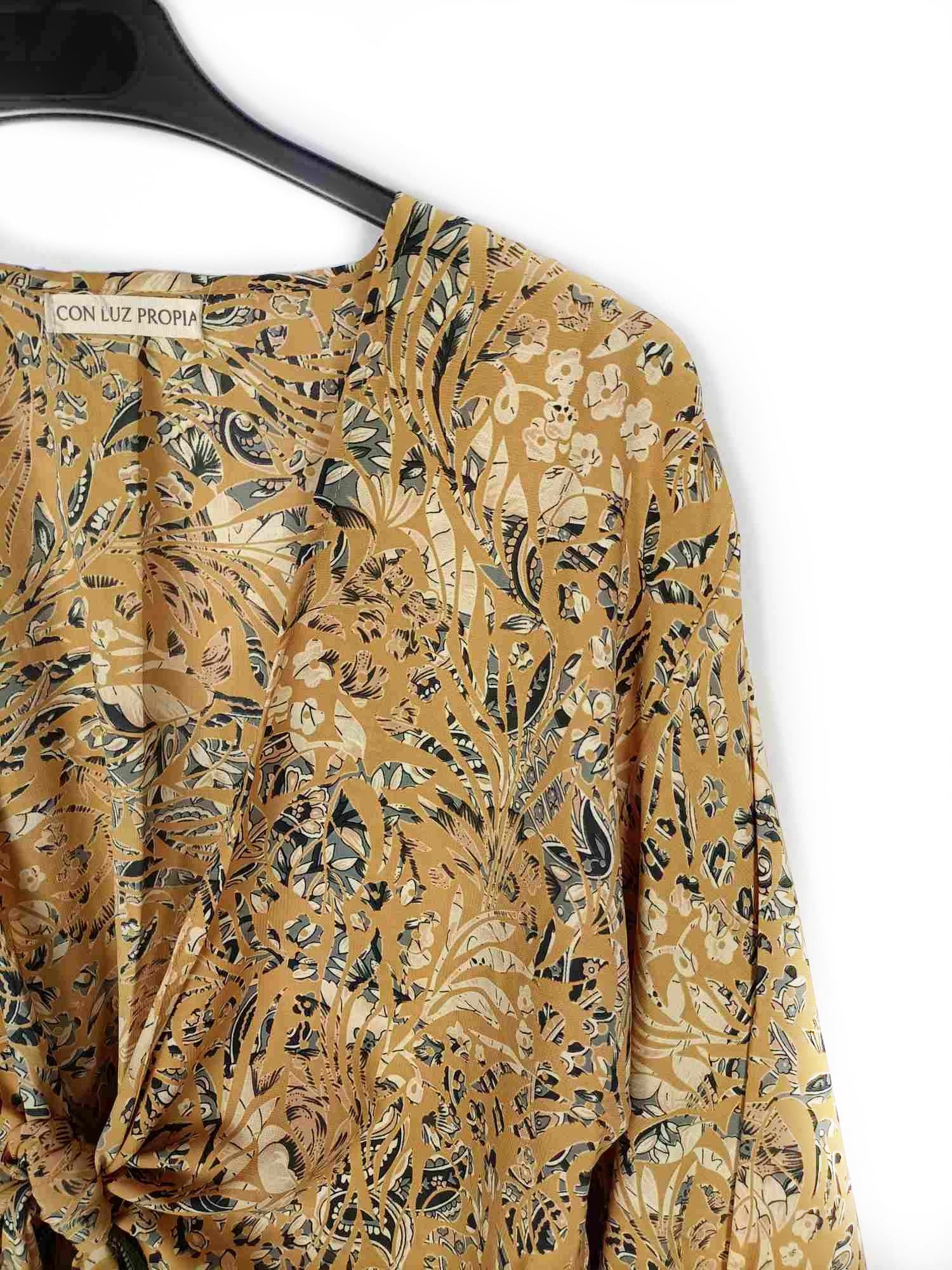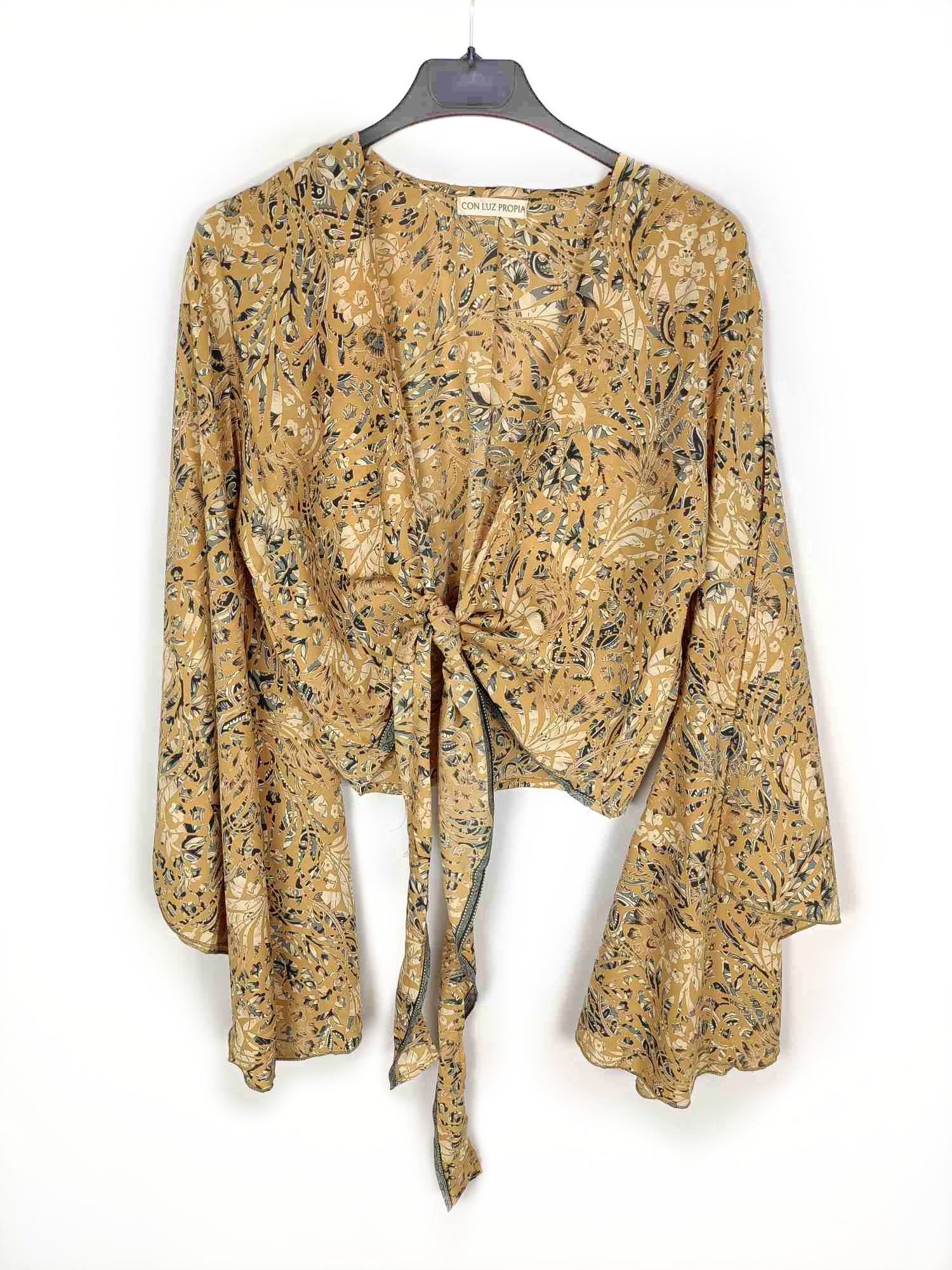 Con luz propia. Tu (m) Top mostaza estampado con lazada delantera y mangas acampanadas. No elástico. De sisa a sisa 55 cm largo 48 cm