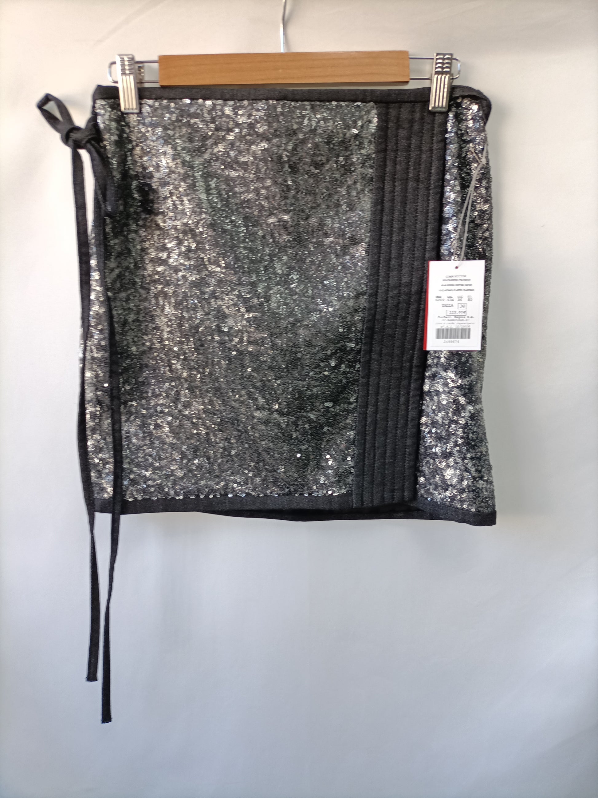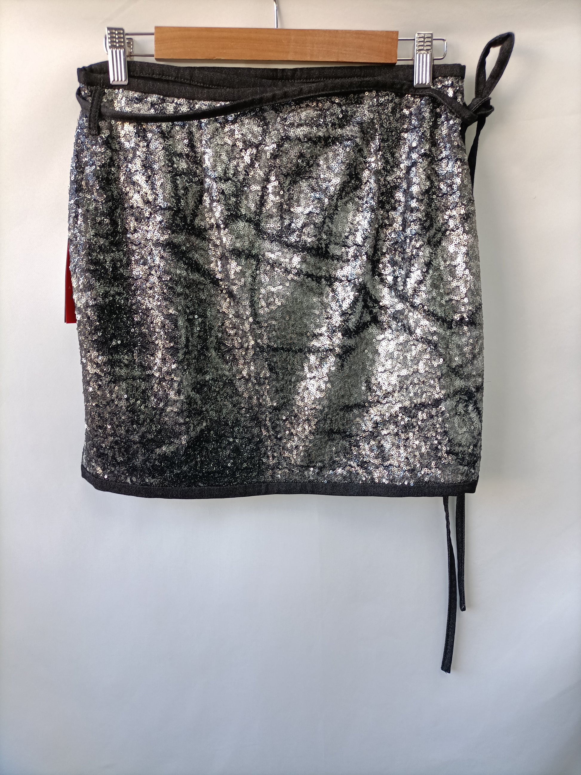 NUEVA CON ETIQUETA.Falda cruzada plateada y negra.No elástico. Largo 43 cm
