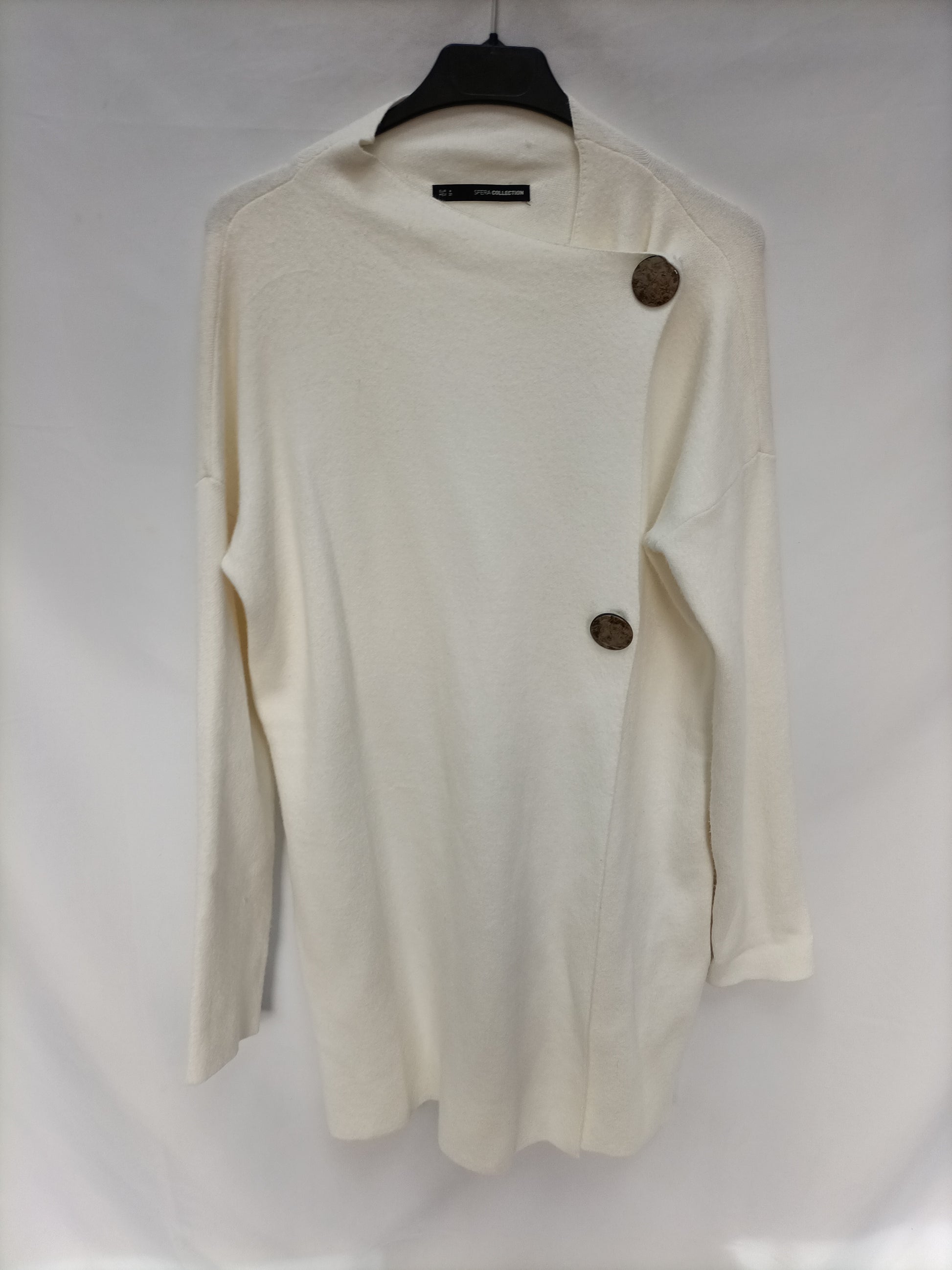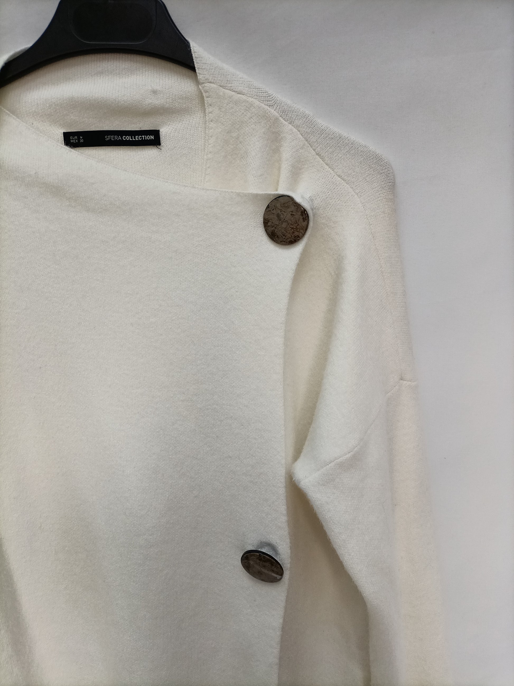 Cárdigan de punto blanco roto cruzado con botones. Elastico. Largo 68 cm