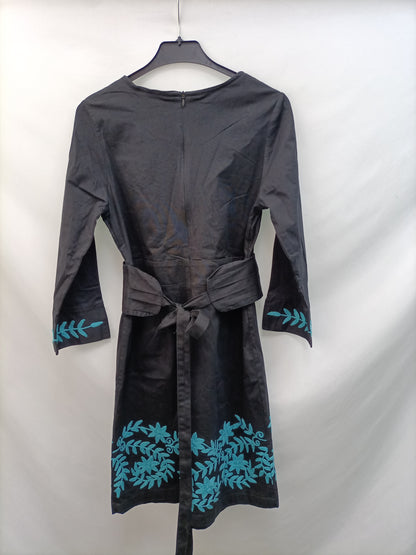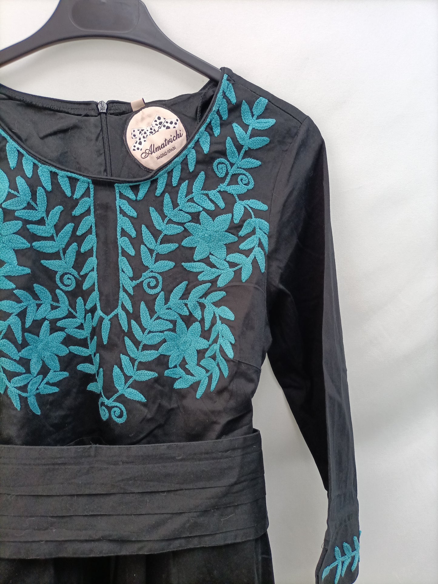 vestido negro bordado en tonos azules. De sisa a sisa 38 cm Largo 88 cm