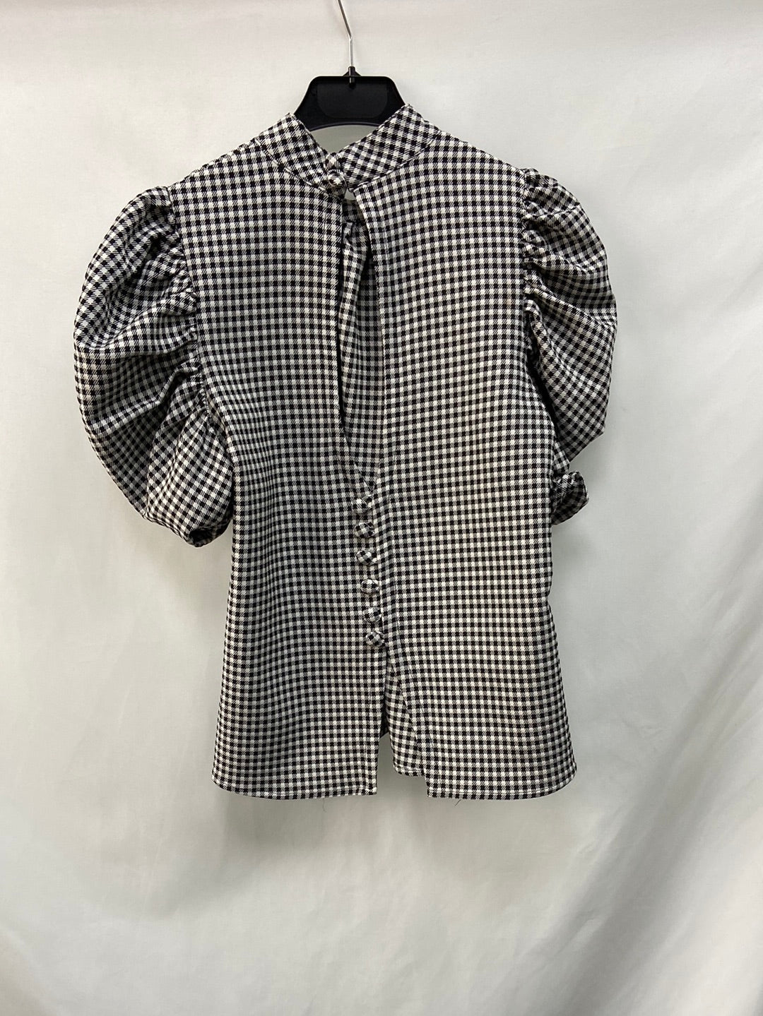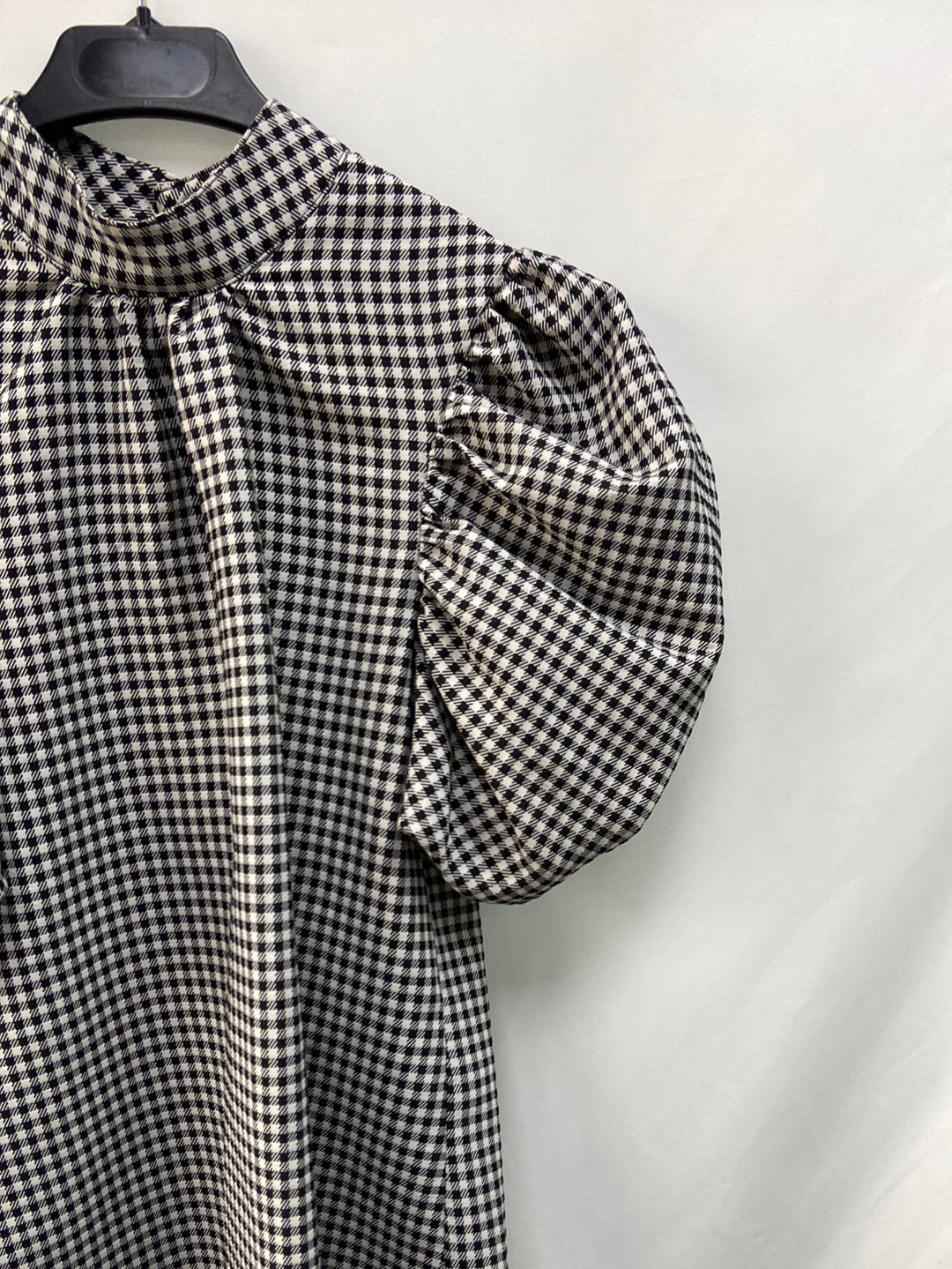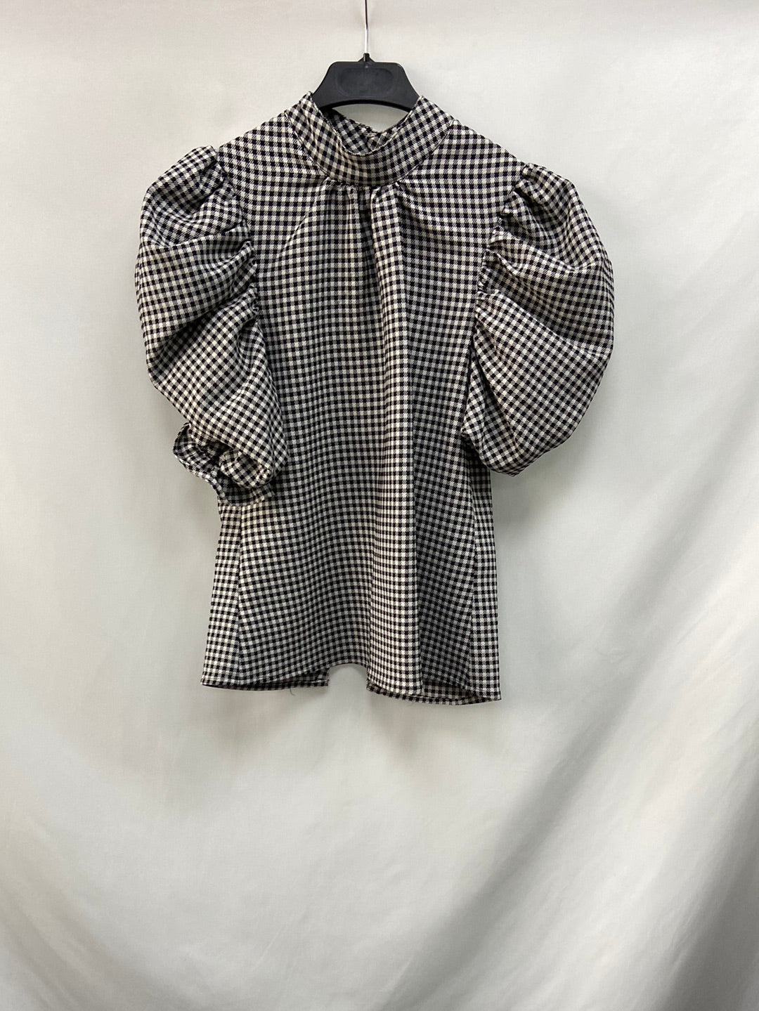 Top cuadros vichy negro y blanco con las mangas abullonadas. semielástica. No elástica. de sisa a sisa 36 cm largo 57 cm Tara: mini mancha el la espalda