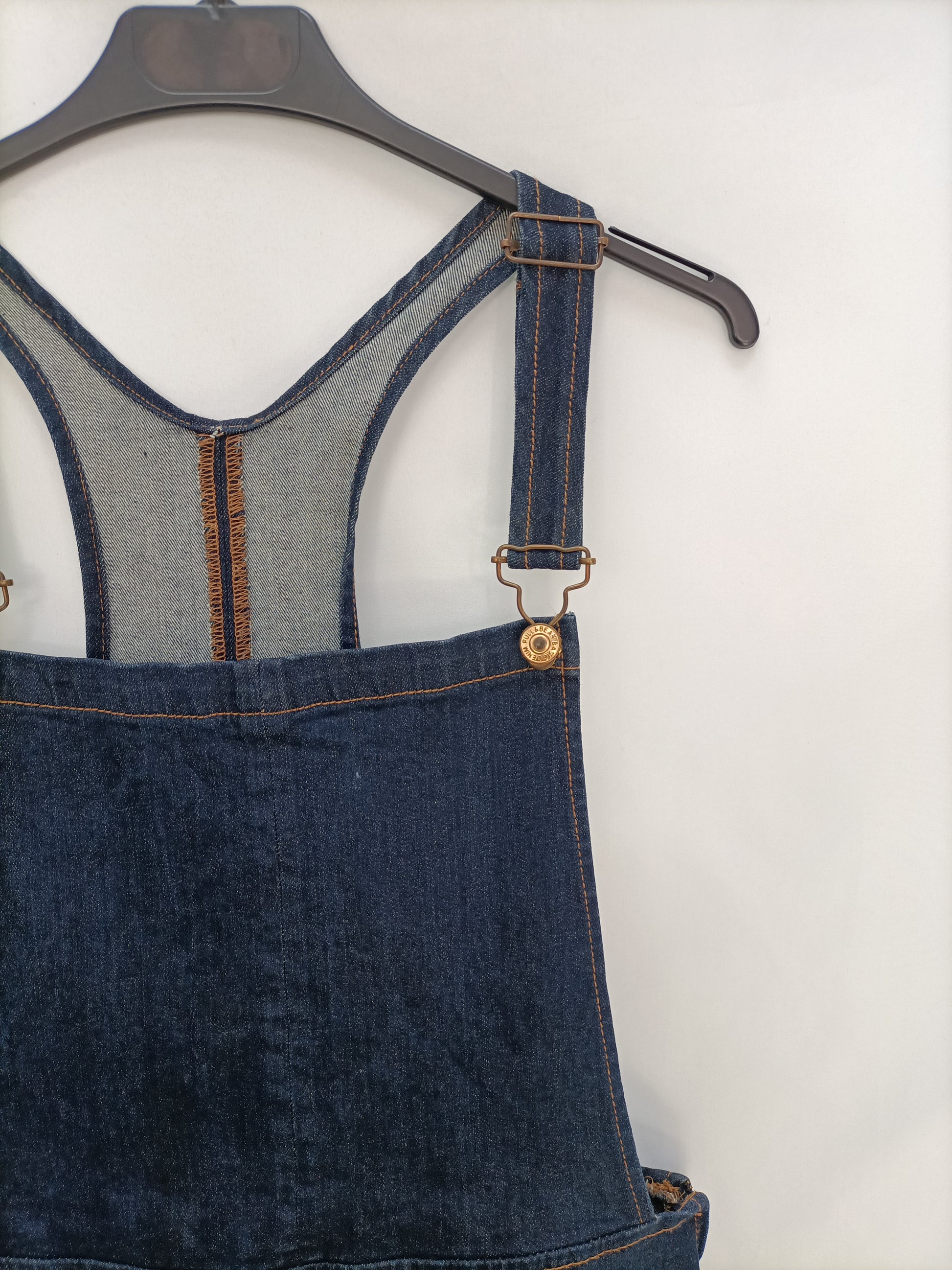 Peto (de falda) vaquero oscuro con los tirantes ajustables. No elastico. Cintura 44 cm Largo 81 cm