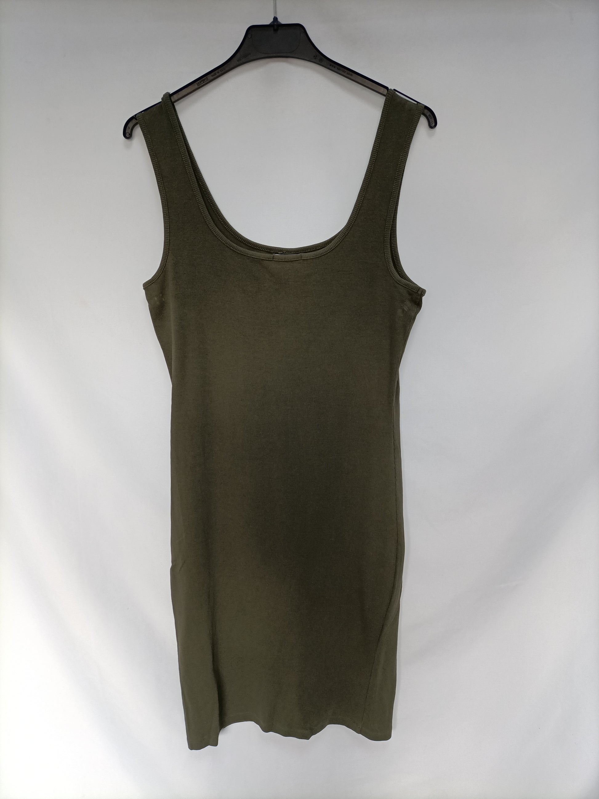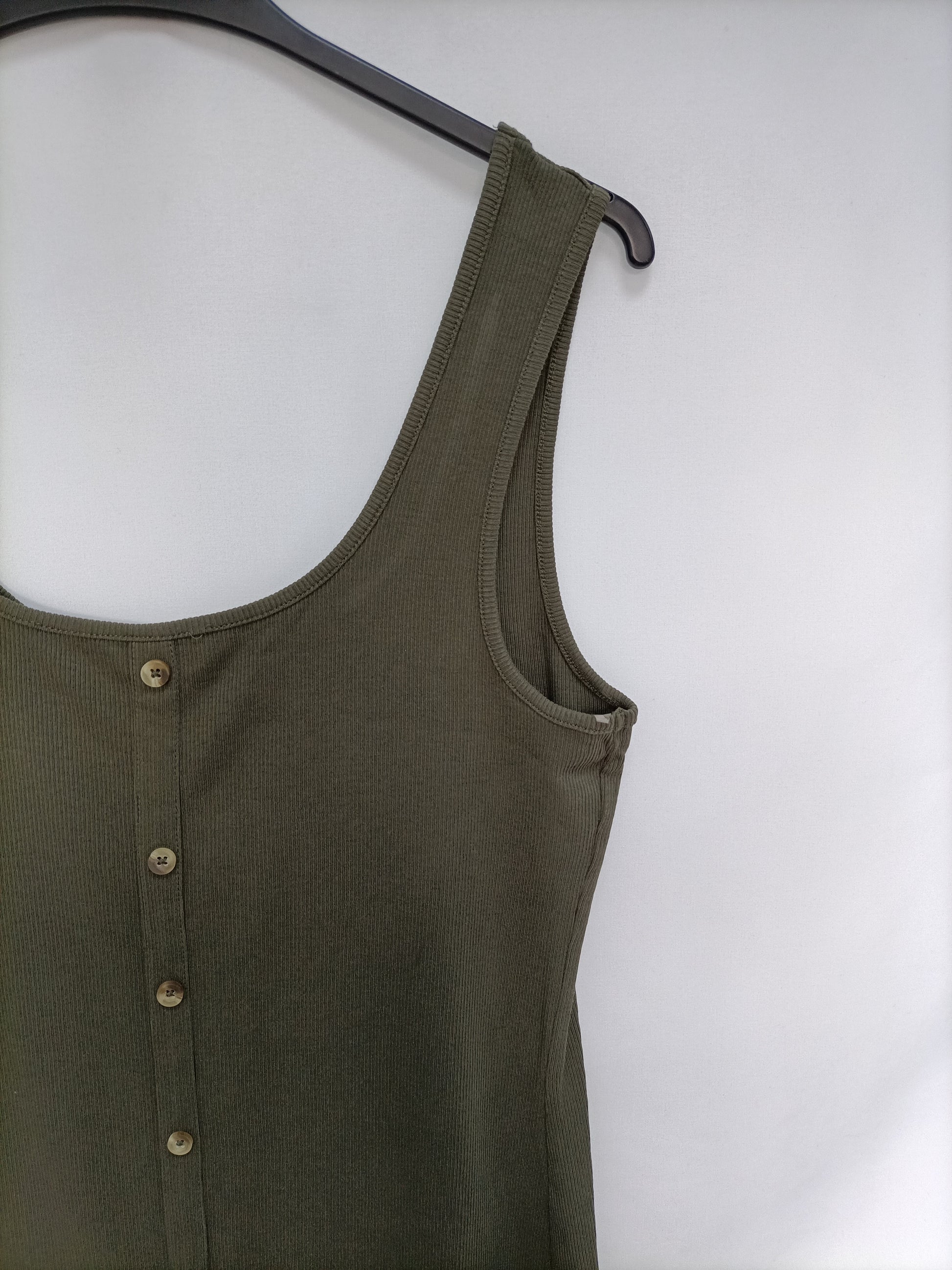 Vestido verde midi de tejido de canalé elástico. Ajustado con detalle de botones delanteros. Largo 99 cm