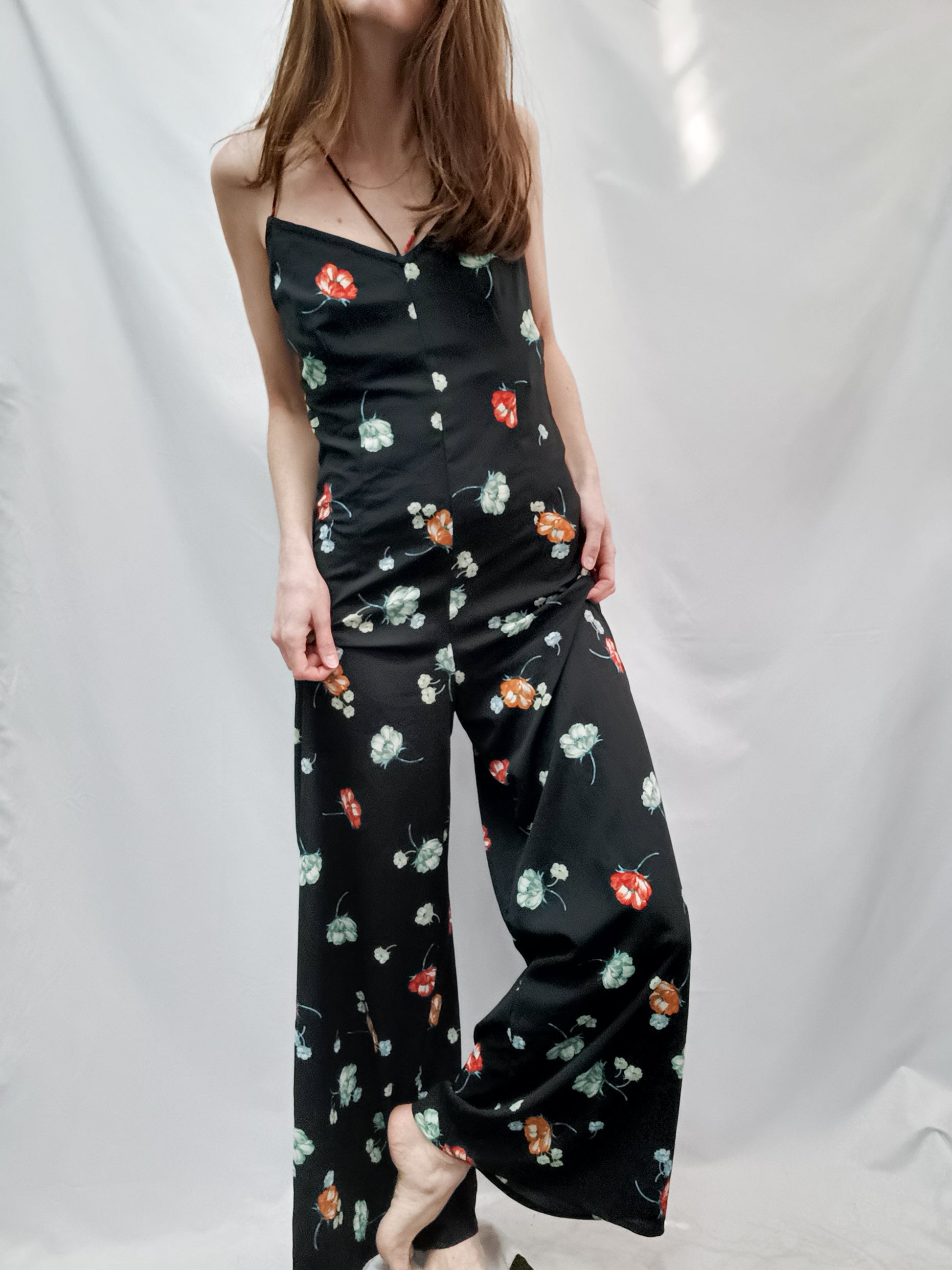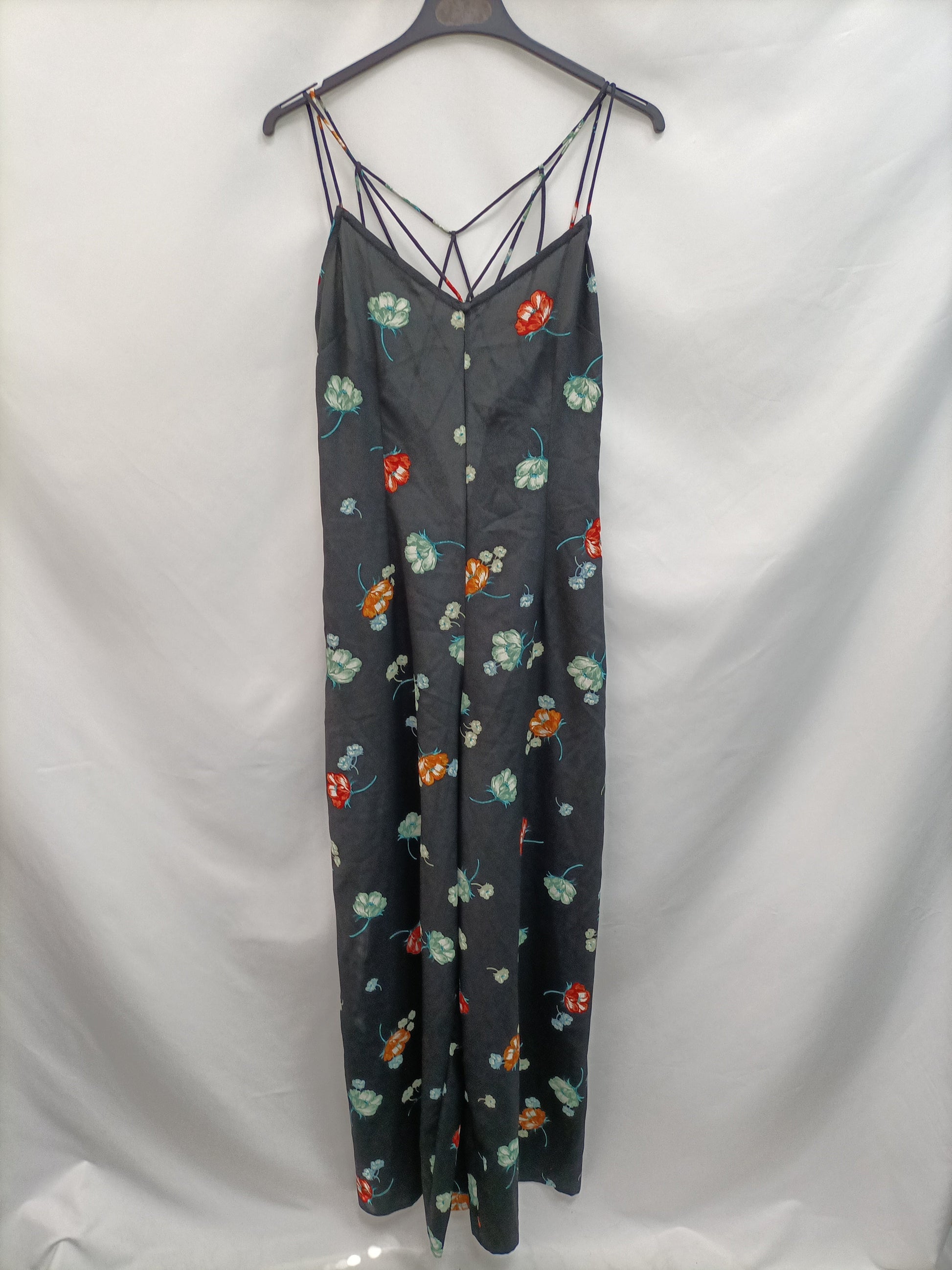 Mono negro largo semiestructurado con espada baja tirantes cruzados. No elástico. Cremallera lateral. Largo 141