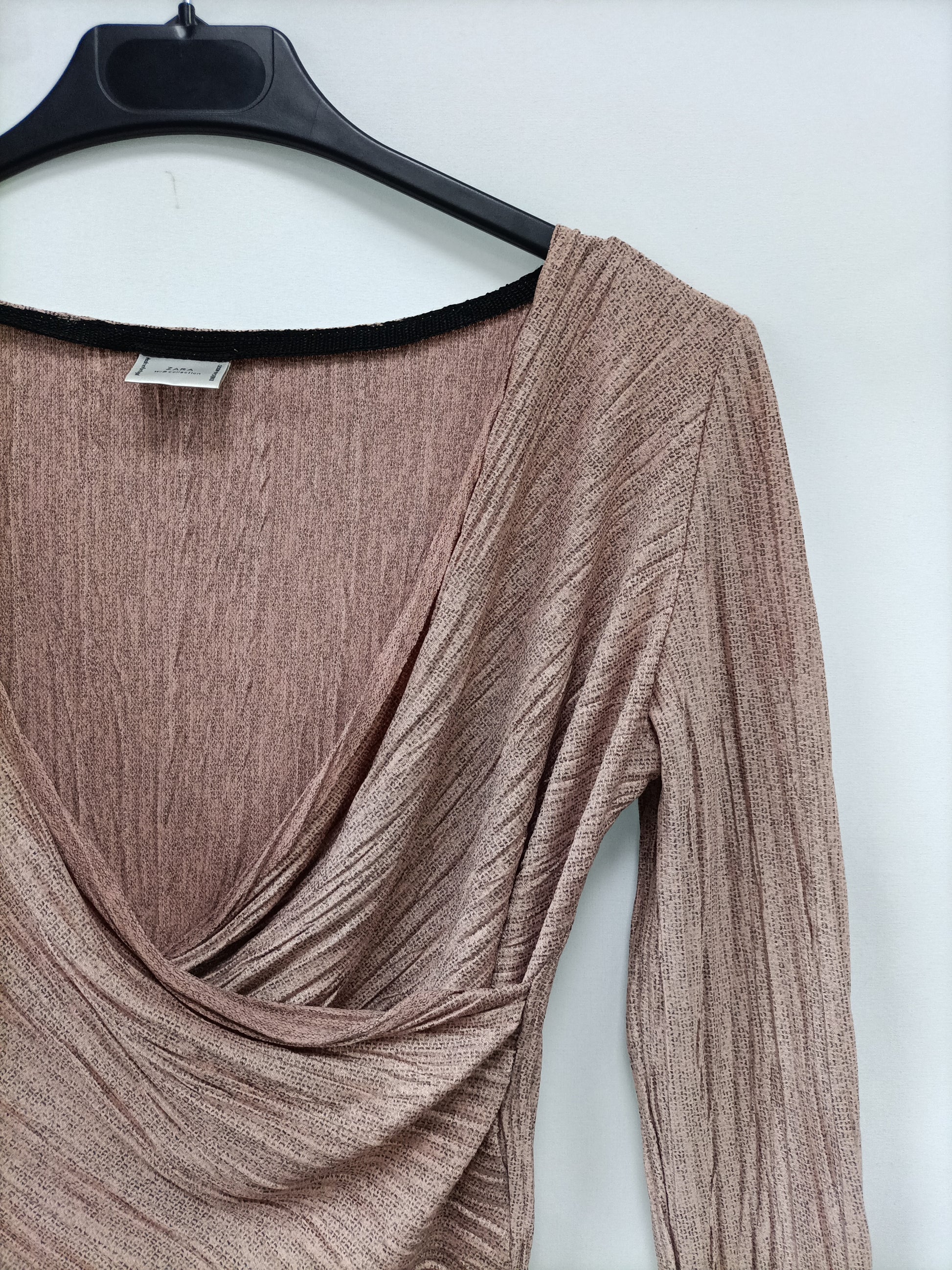 Top plisado rosa palo y negro cortito con el Escote cruzado. Elastico. Largo 40 cm