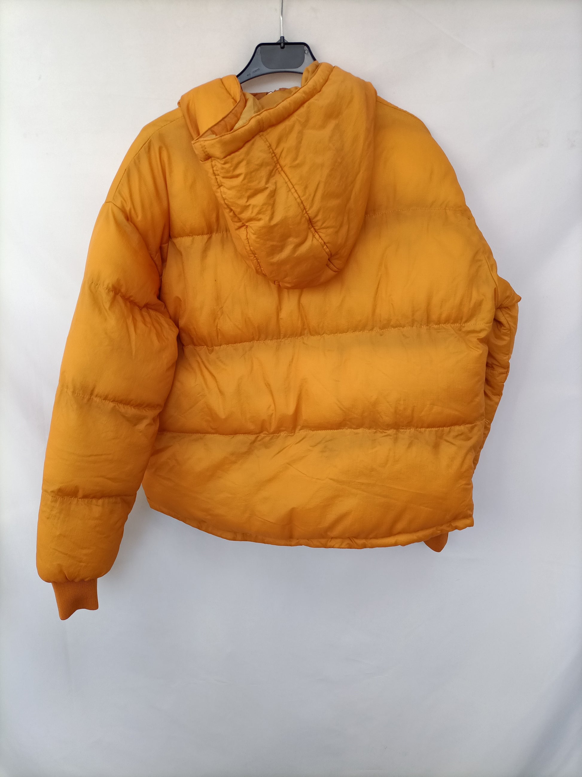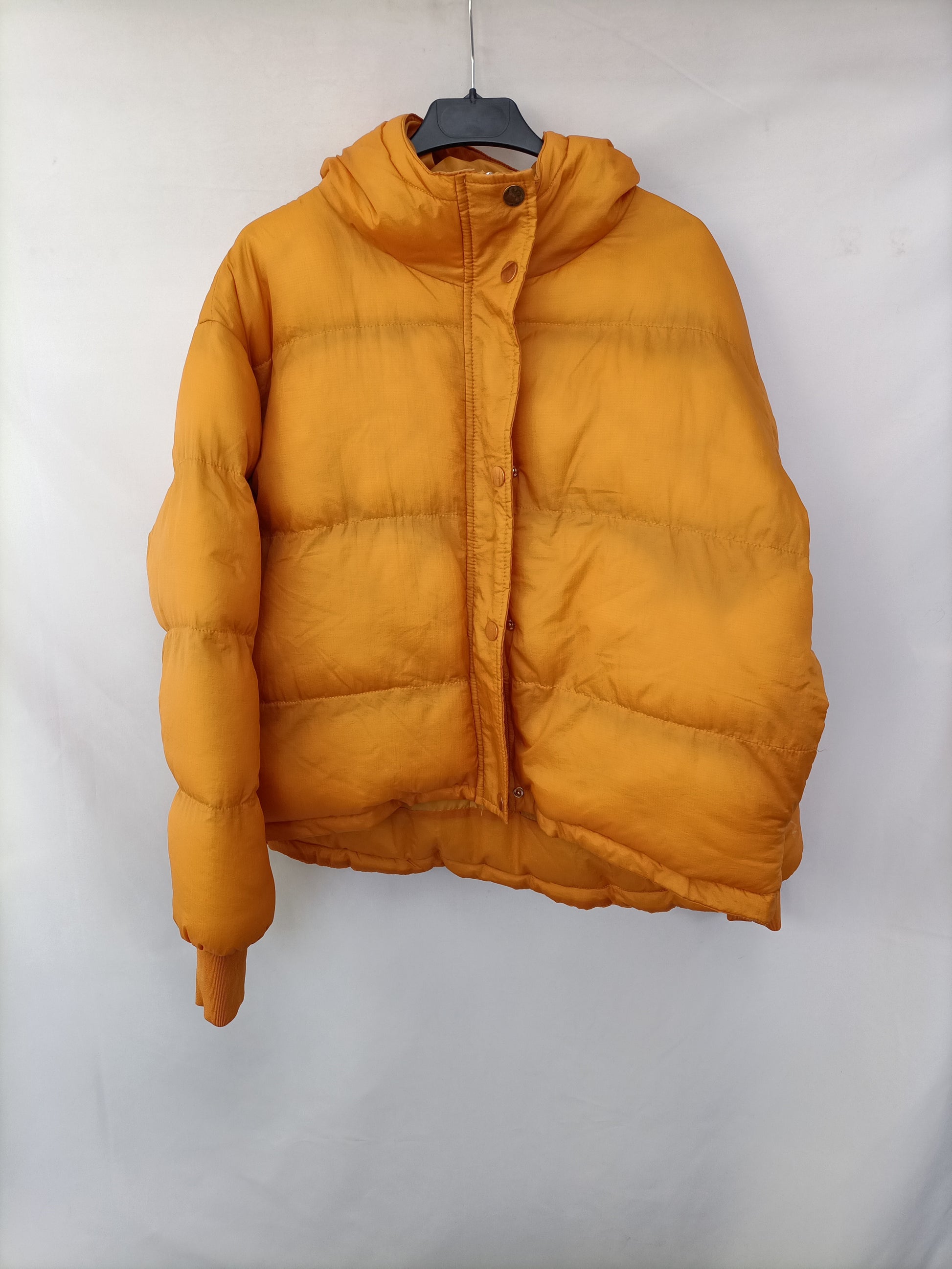 Plumas amarillo con capucha ligero y gordito. No elástica. De sisa a sisa 62 m largo 66 cm