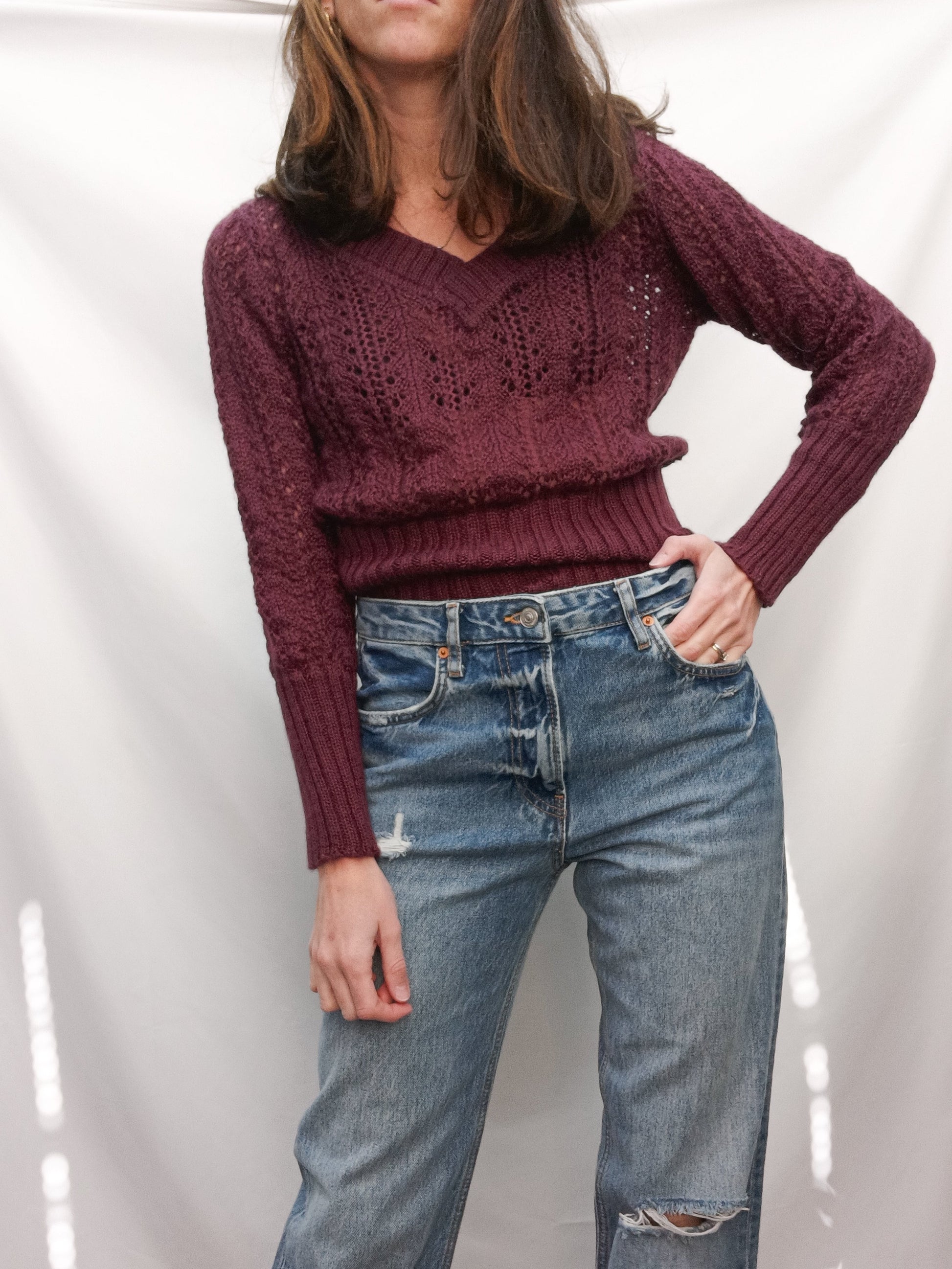 Jersey burdeos troquelado escote pico y Ajustado en la parte de abajo y mangas. Largo 56 cm