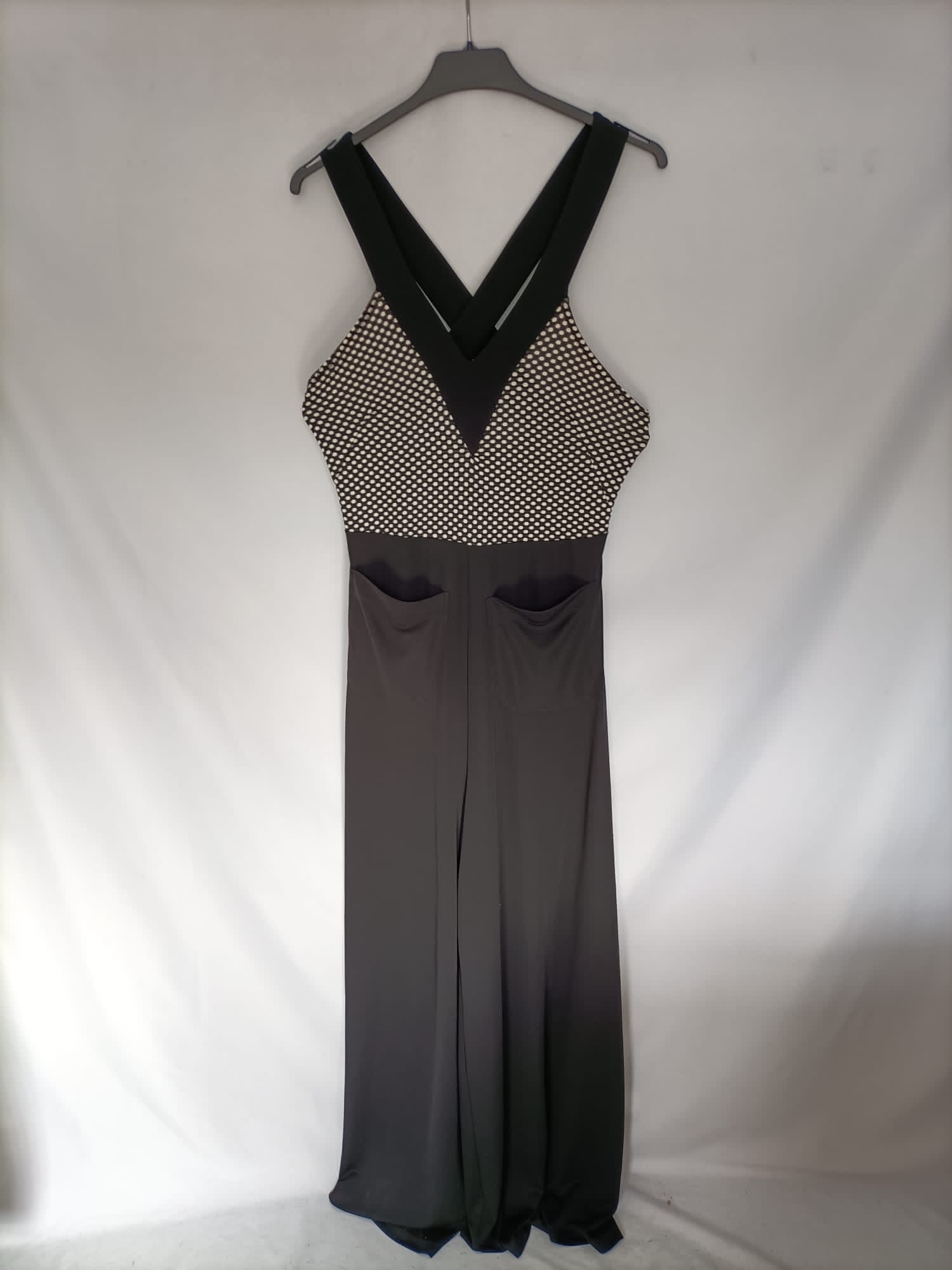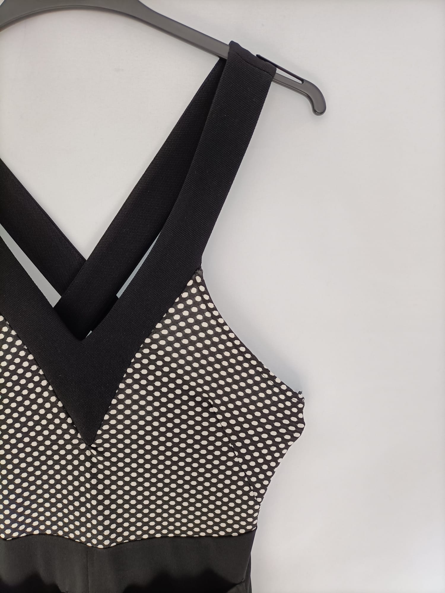 Zara. M. Mono largo negro Palazzo y fluido con escote de topitos bicolor y con textura. Largo 160 cm