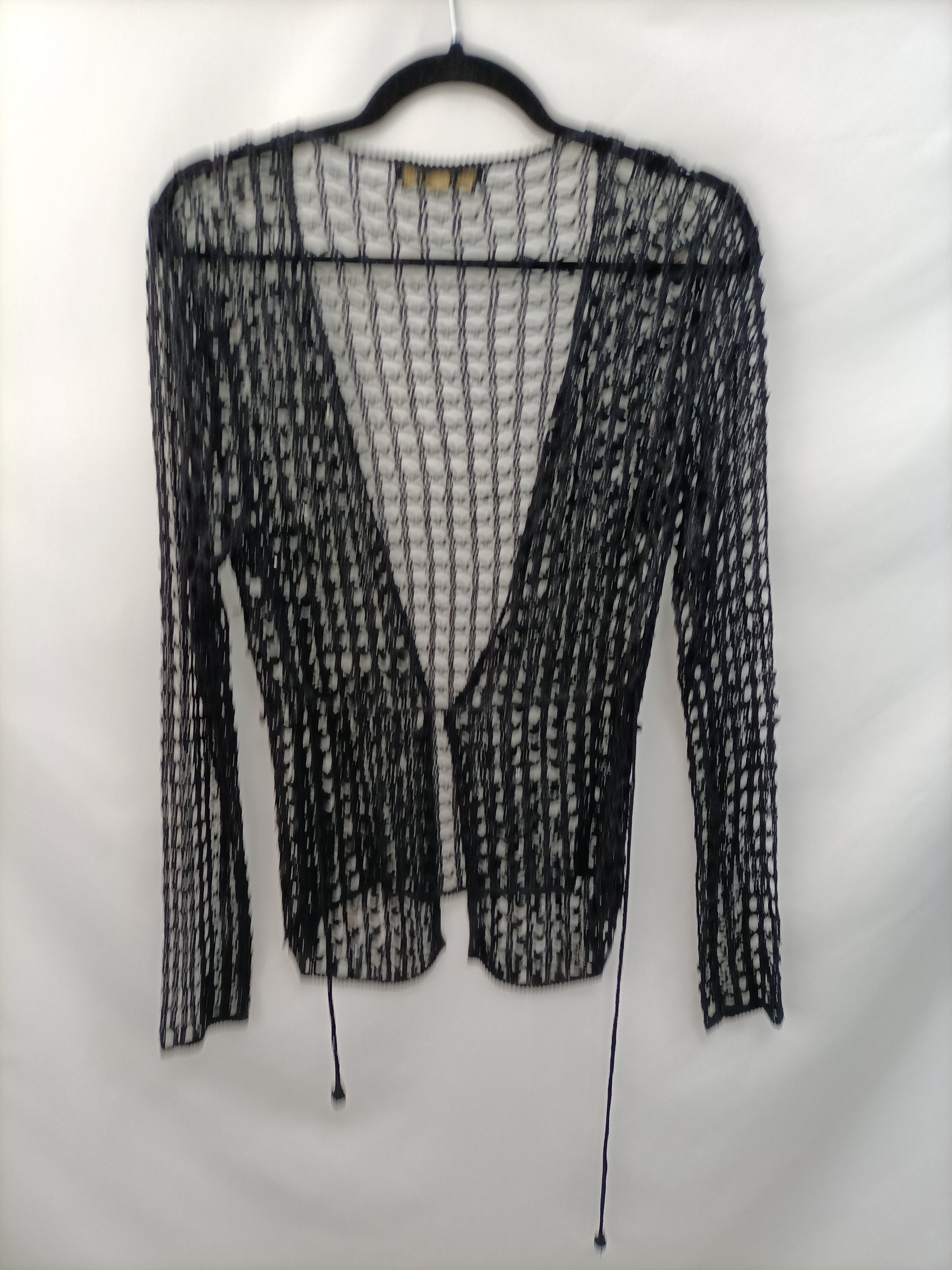 Rebeca negra de croché con lentejuelas. Se abrocha con un corchete y tiene lazada. Elástico. Largo 68 cm . Total look con vestido