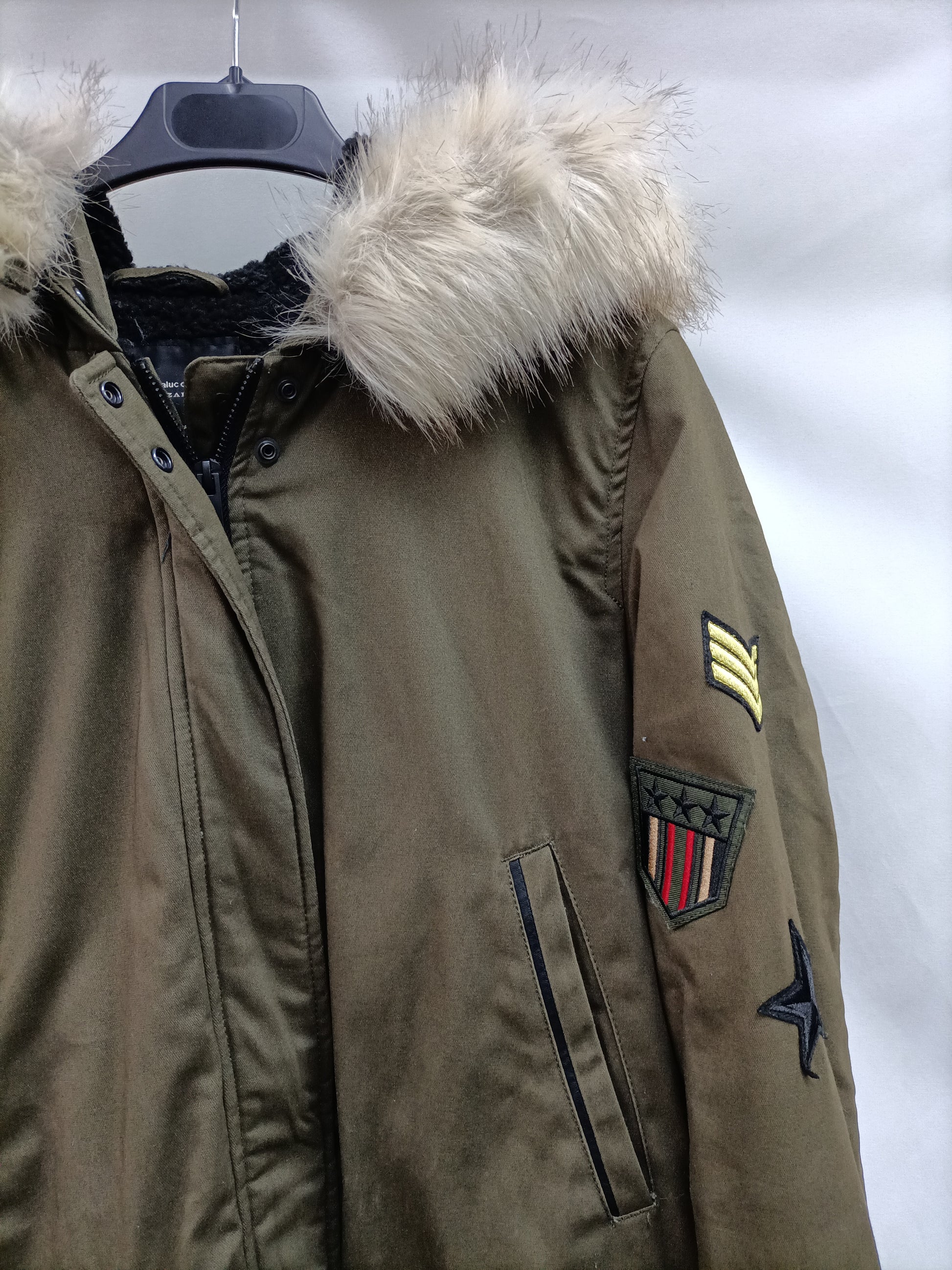 Abrigo verde con capucha y parches. Interior de borrego. Pelito extraíble. De sisa a sisa 53 cm largo 80 cm