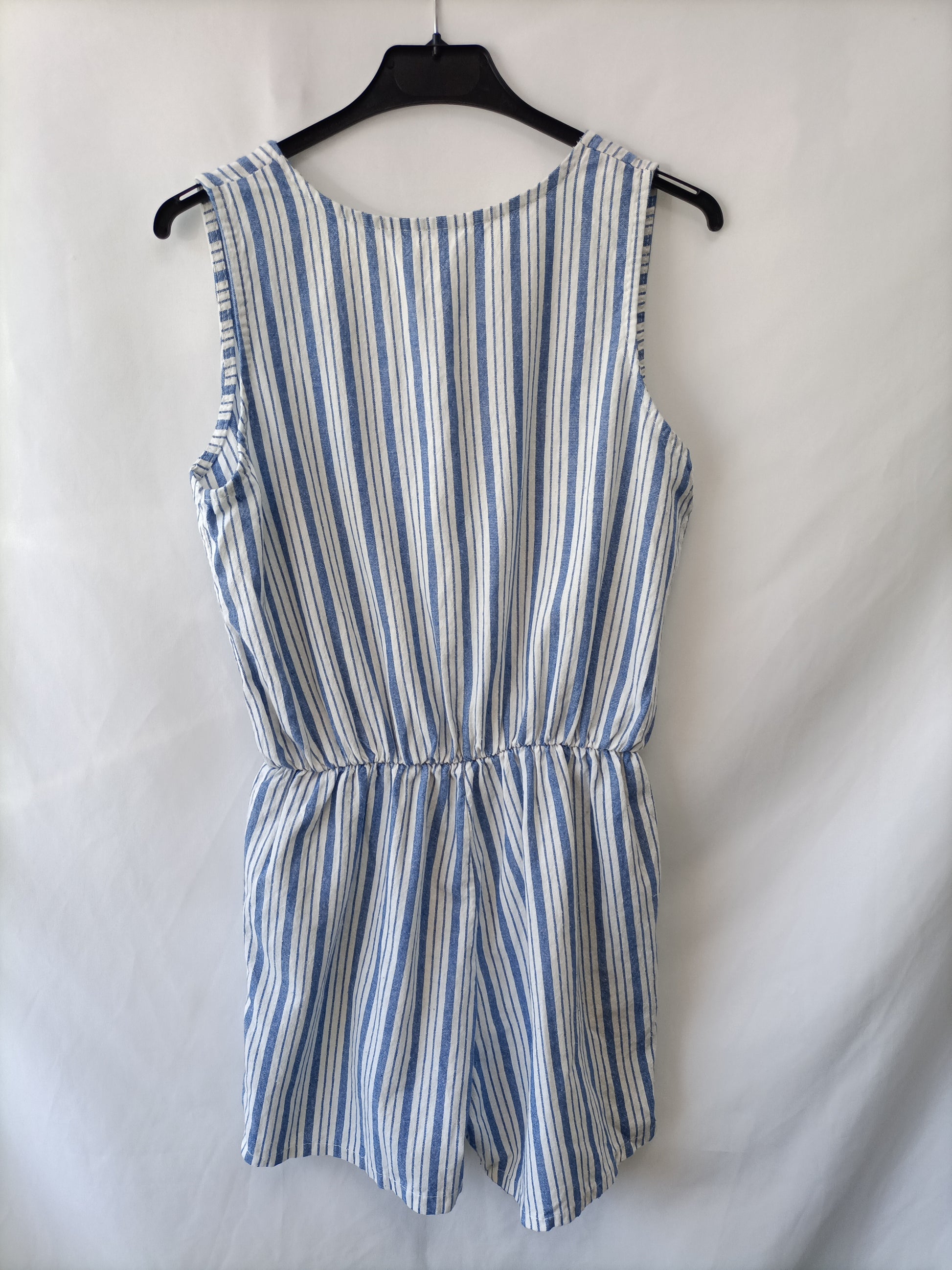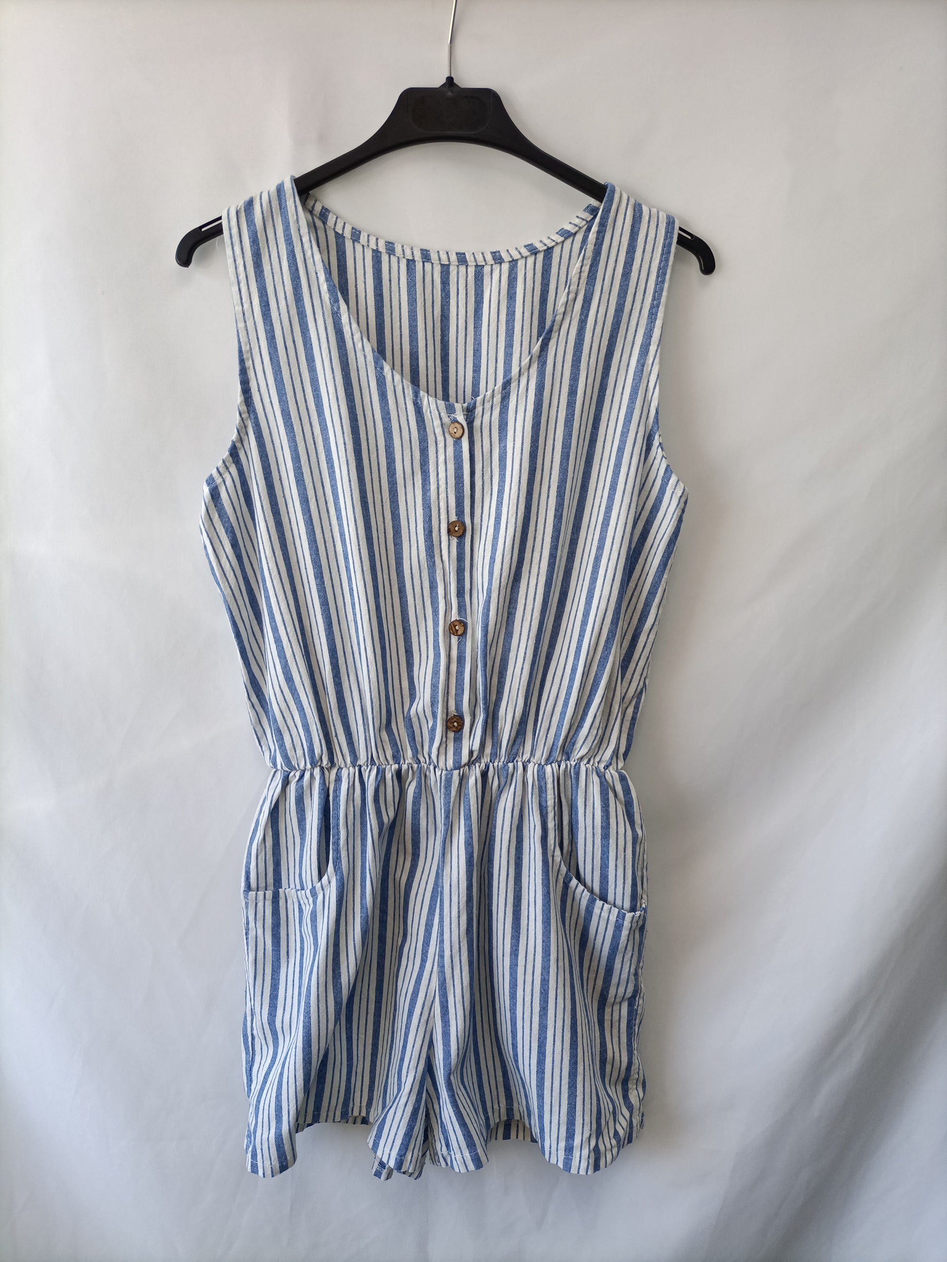 Mono corto de rayas azul y blanco con botones en la parte de arriba y cintura elástica. Tejido tipo algodón. De sisa a sisa 47 cm Largo 76 cm