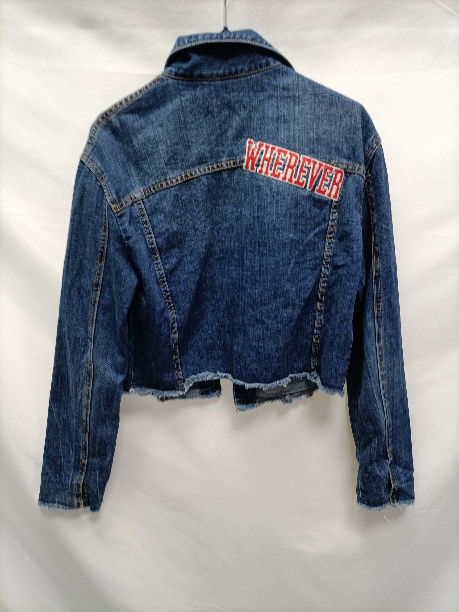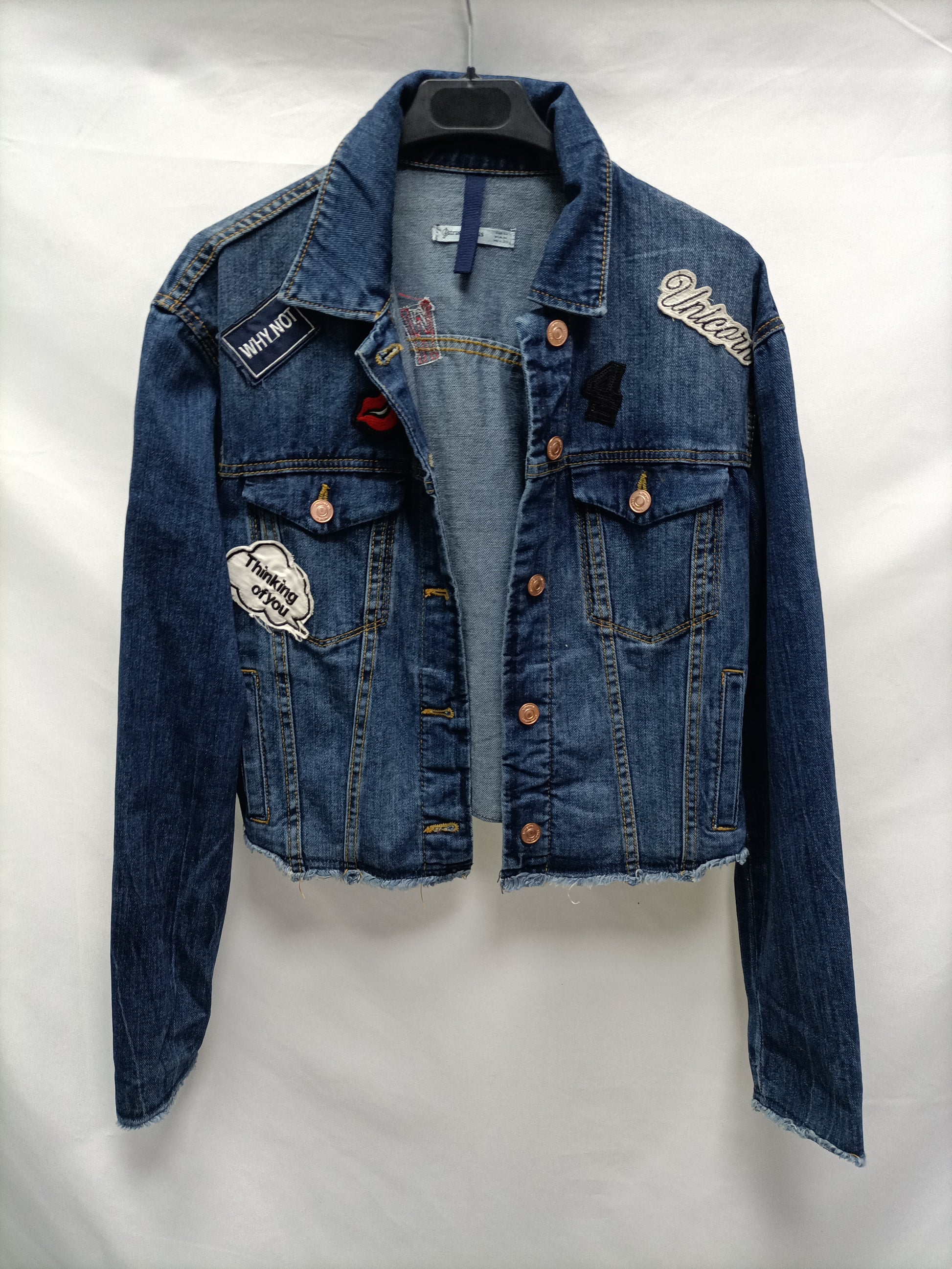 Cazadora vaquera cortita oscura con detalle de parches. No elastico. De sisa a sisa 50 cm Largo 54 cm