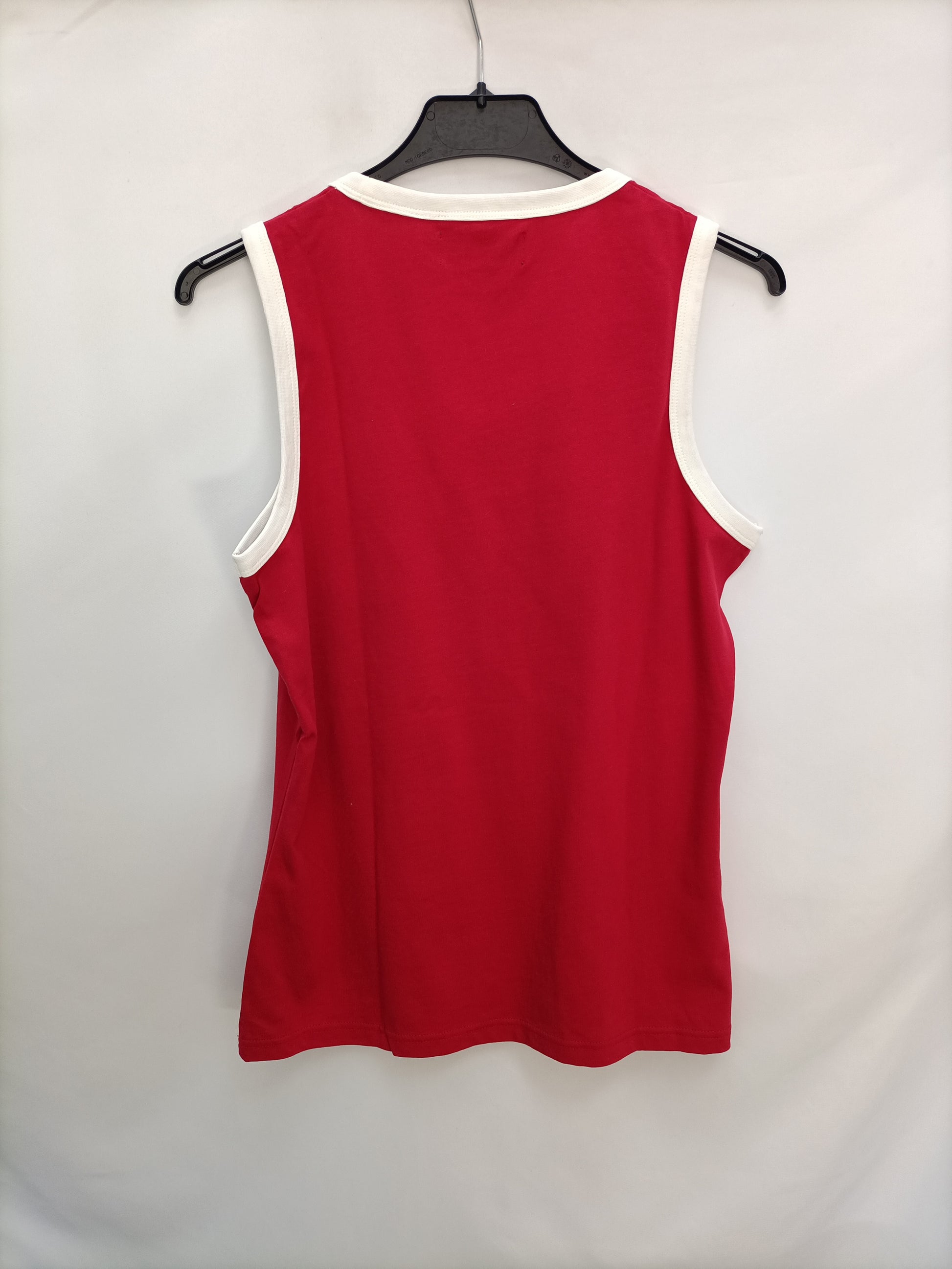 Camiseta roja estilo deportiva con ribete blanco. Elastica. Largo 61 cm