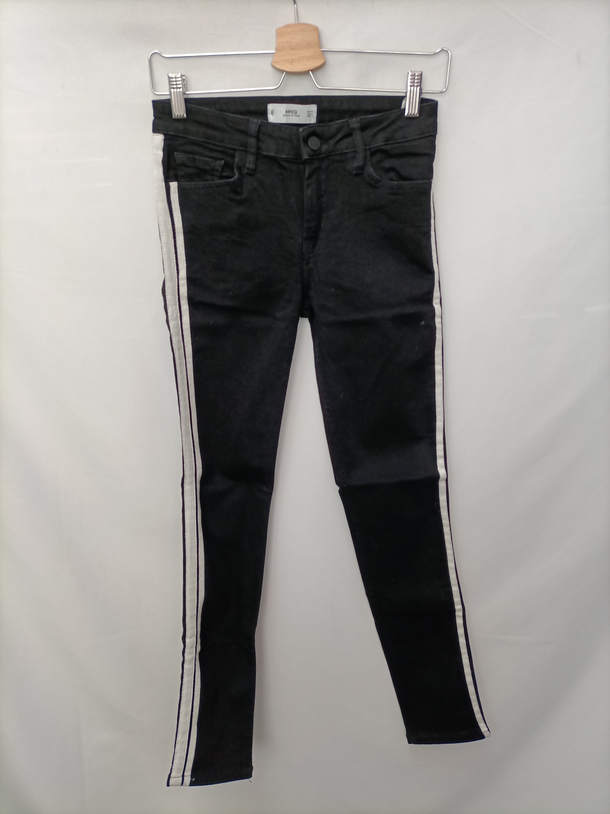Pantalón denim negro con detalle de rayas laterales blancas. Semielastico y ajustado. Cintura 34 cm Largo 98 cm.