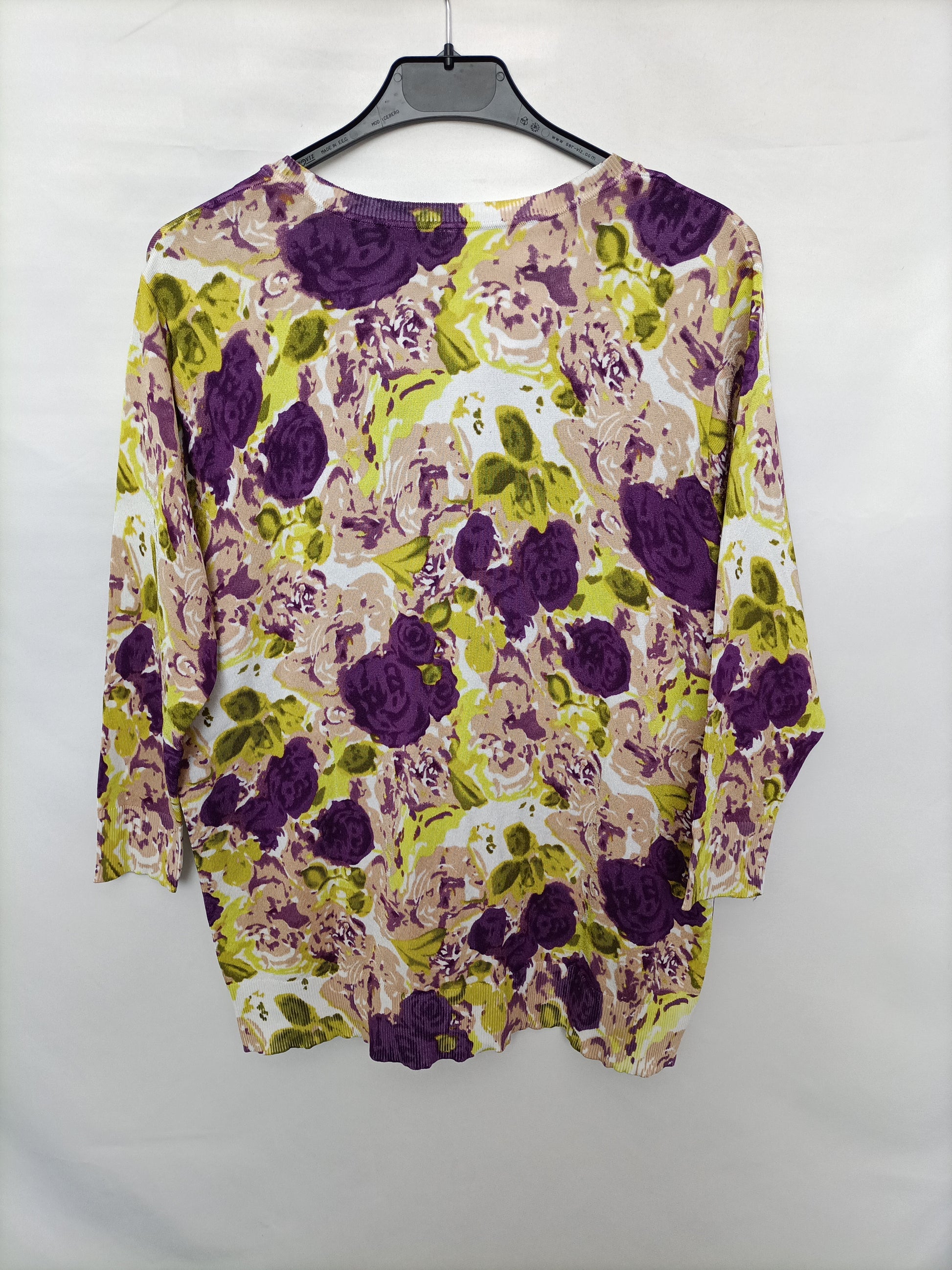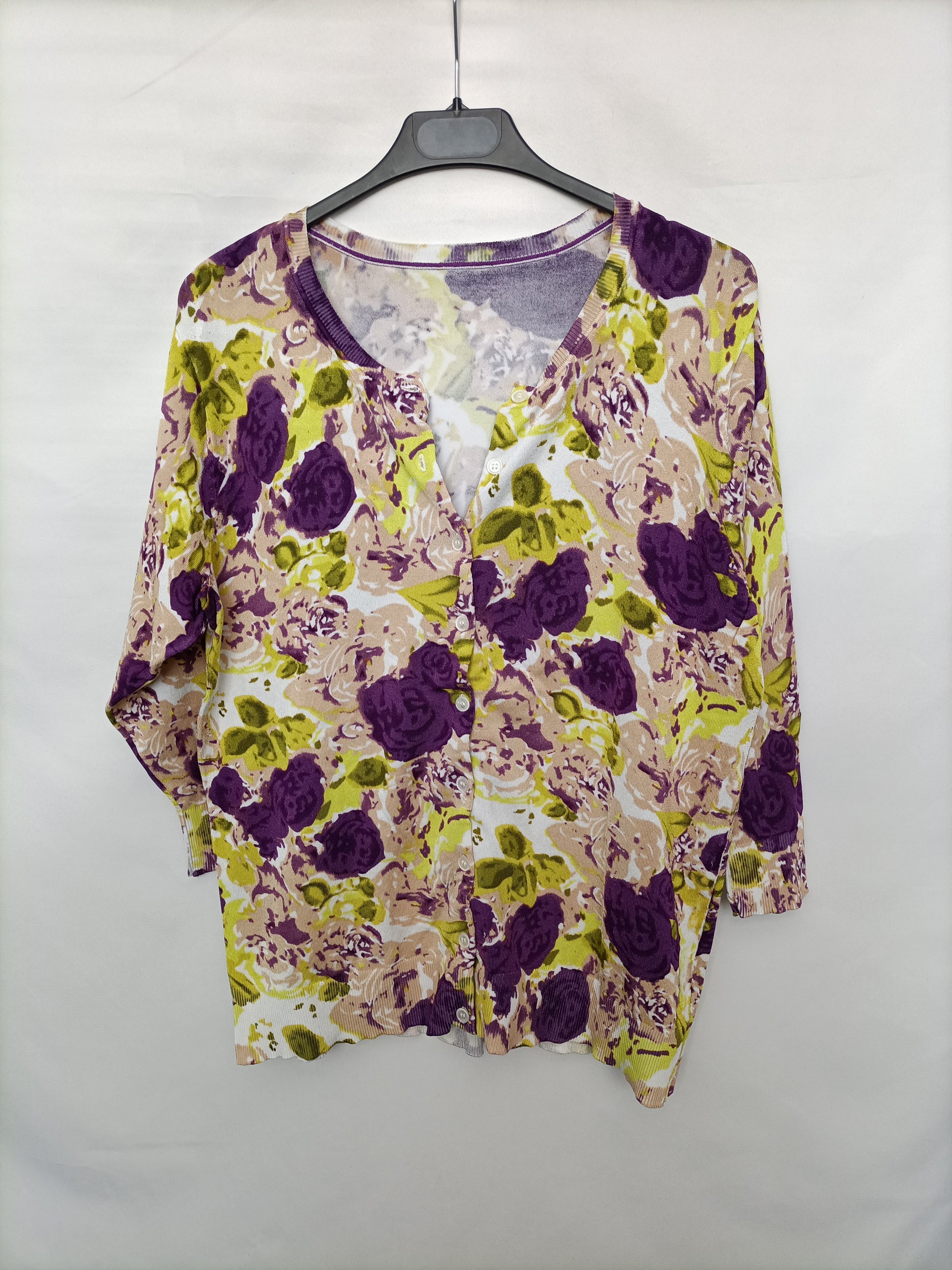 Rebeca de punto con flores en tono morado y verde. Elástica y finita. Abotonada. Largo 60 cm